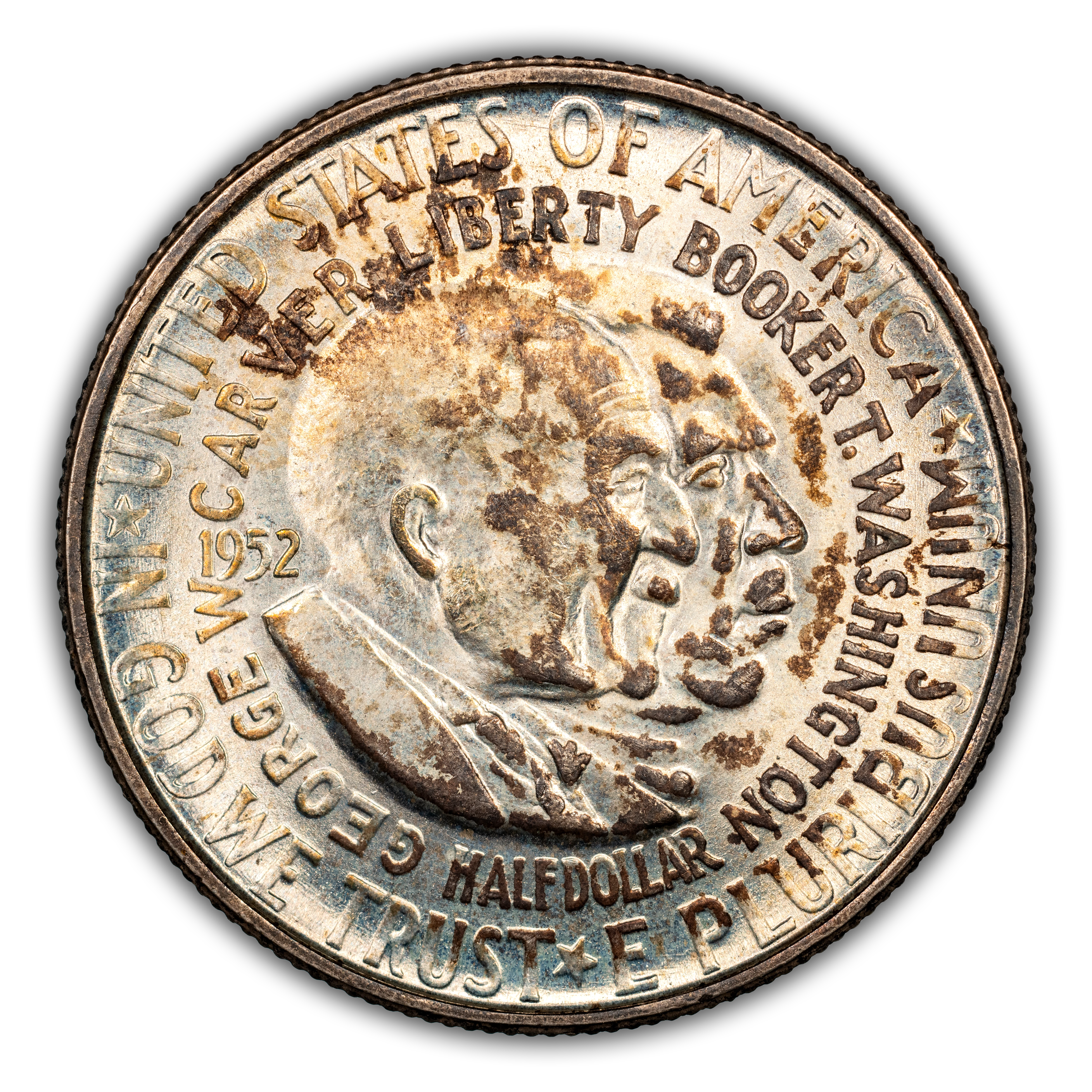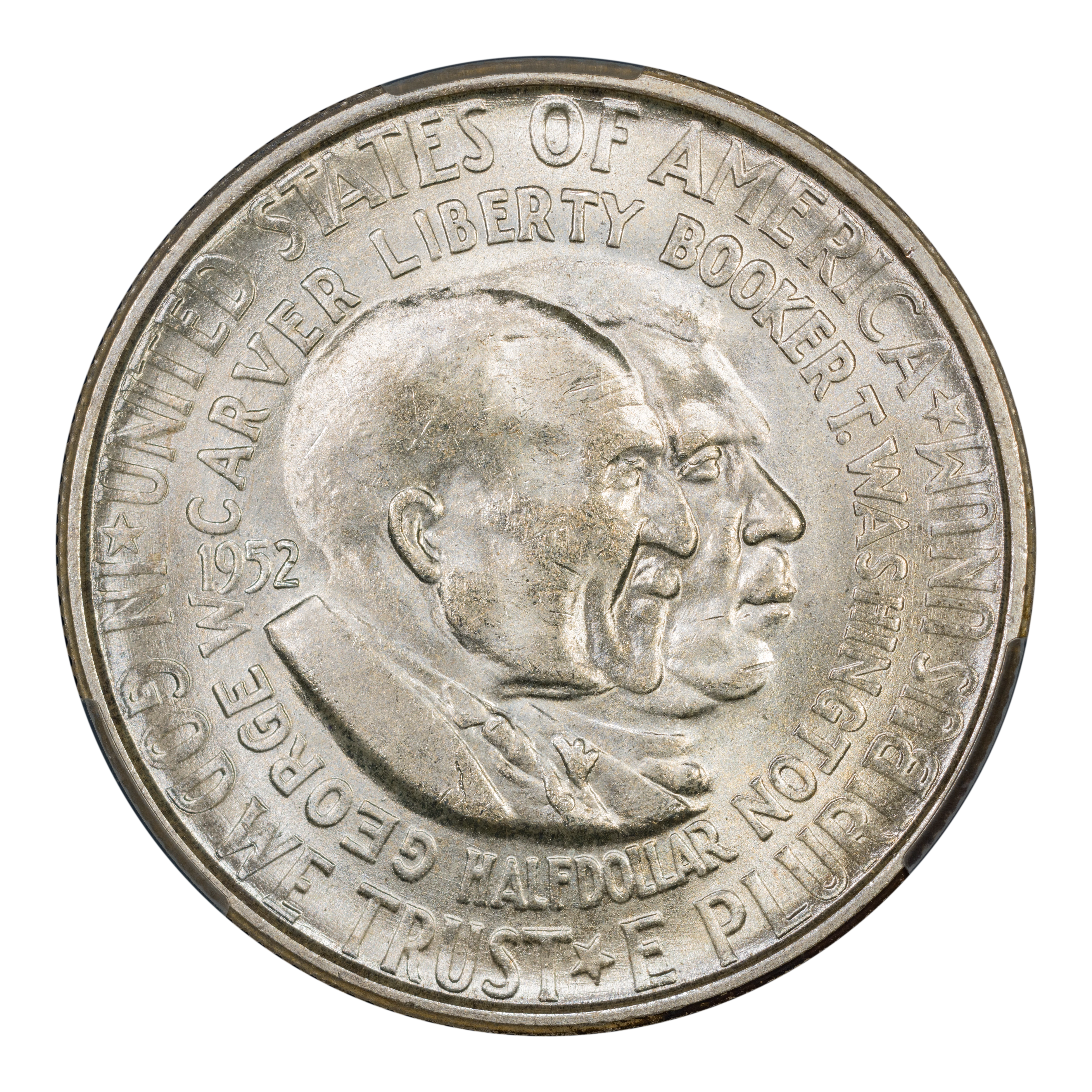 The 1952 Washington-Carver half dollars mark the second year of four years for this multiple-year commemorative type. The obverse features -- jugate portrait of social-reform contemporaries Booker T. Washington and George Washington Carver, the former an author and presidential advisor and the latter -- scientist and advisor. The coin was designed by Isaac Scott Hathaway, who became the first African American to design -- U.S. coin upon the release of the Booker T. Washington half dollar in 1946.