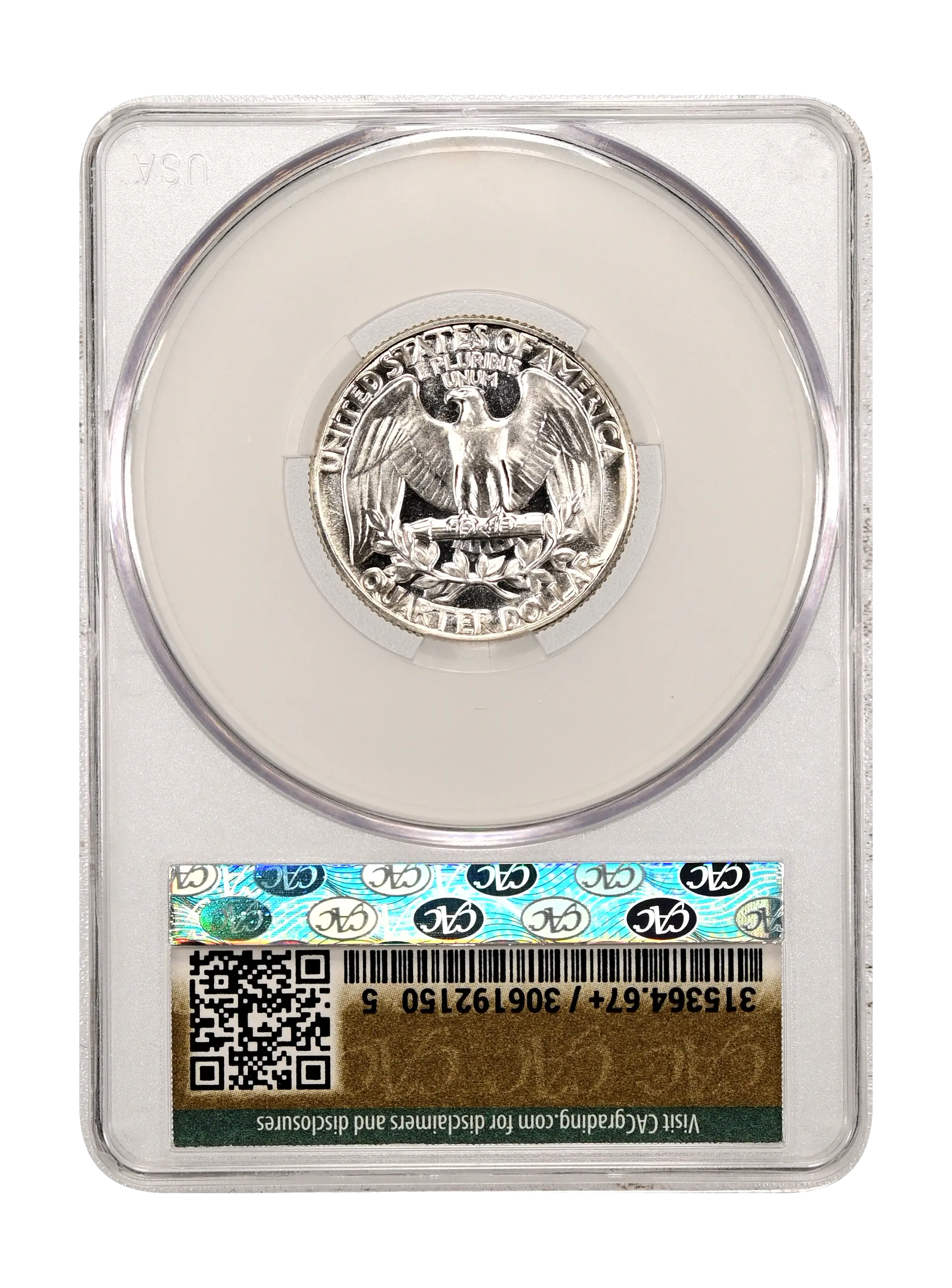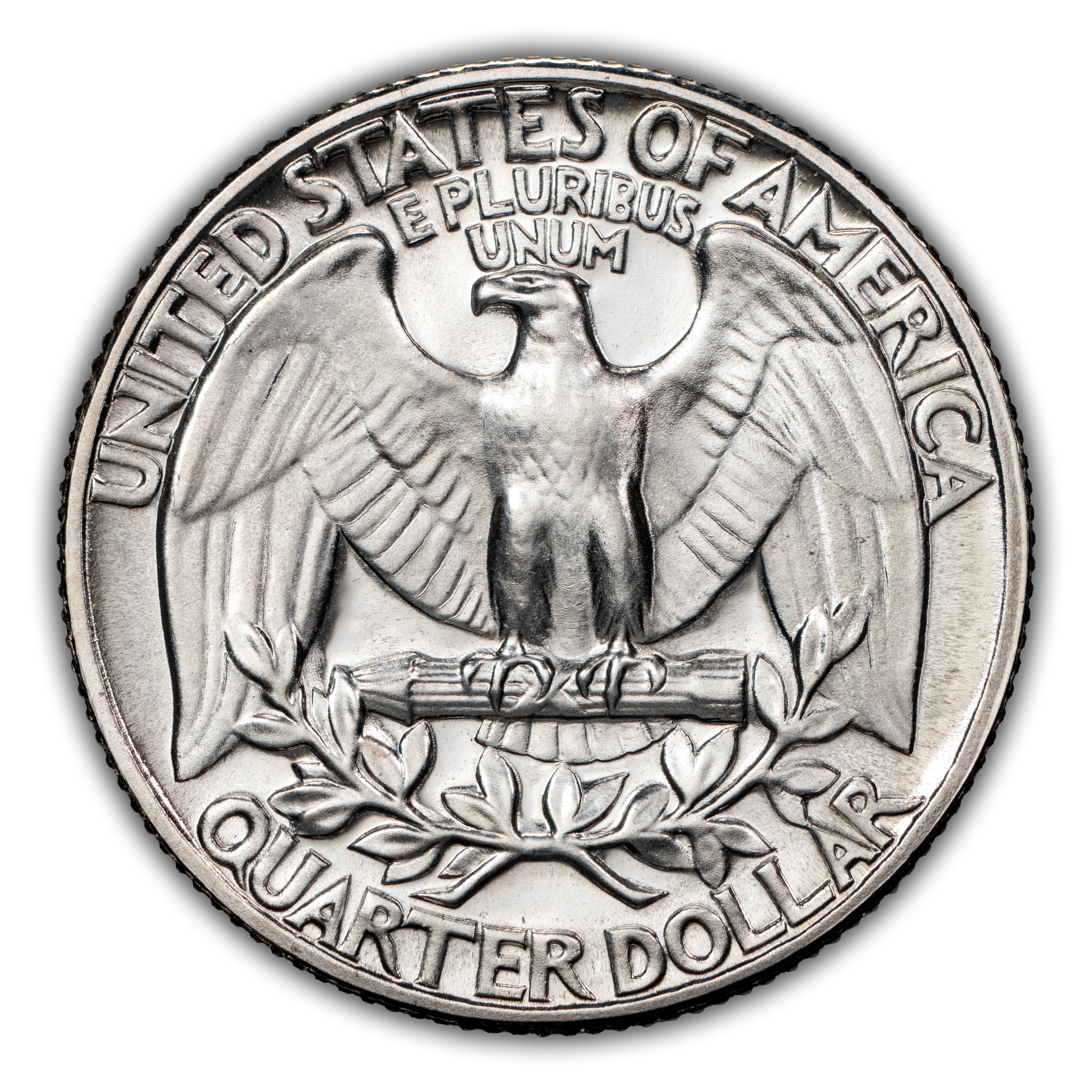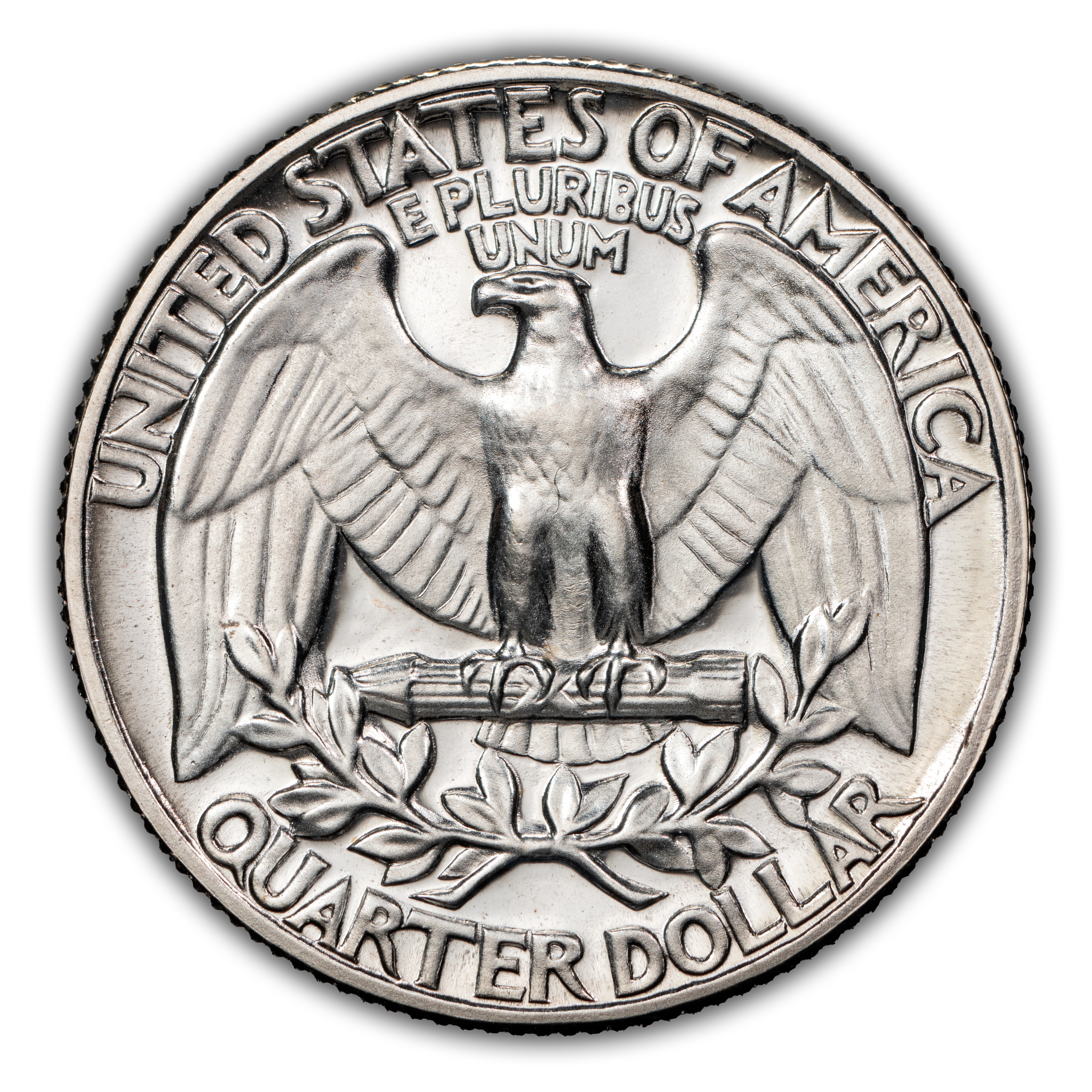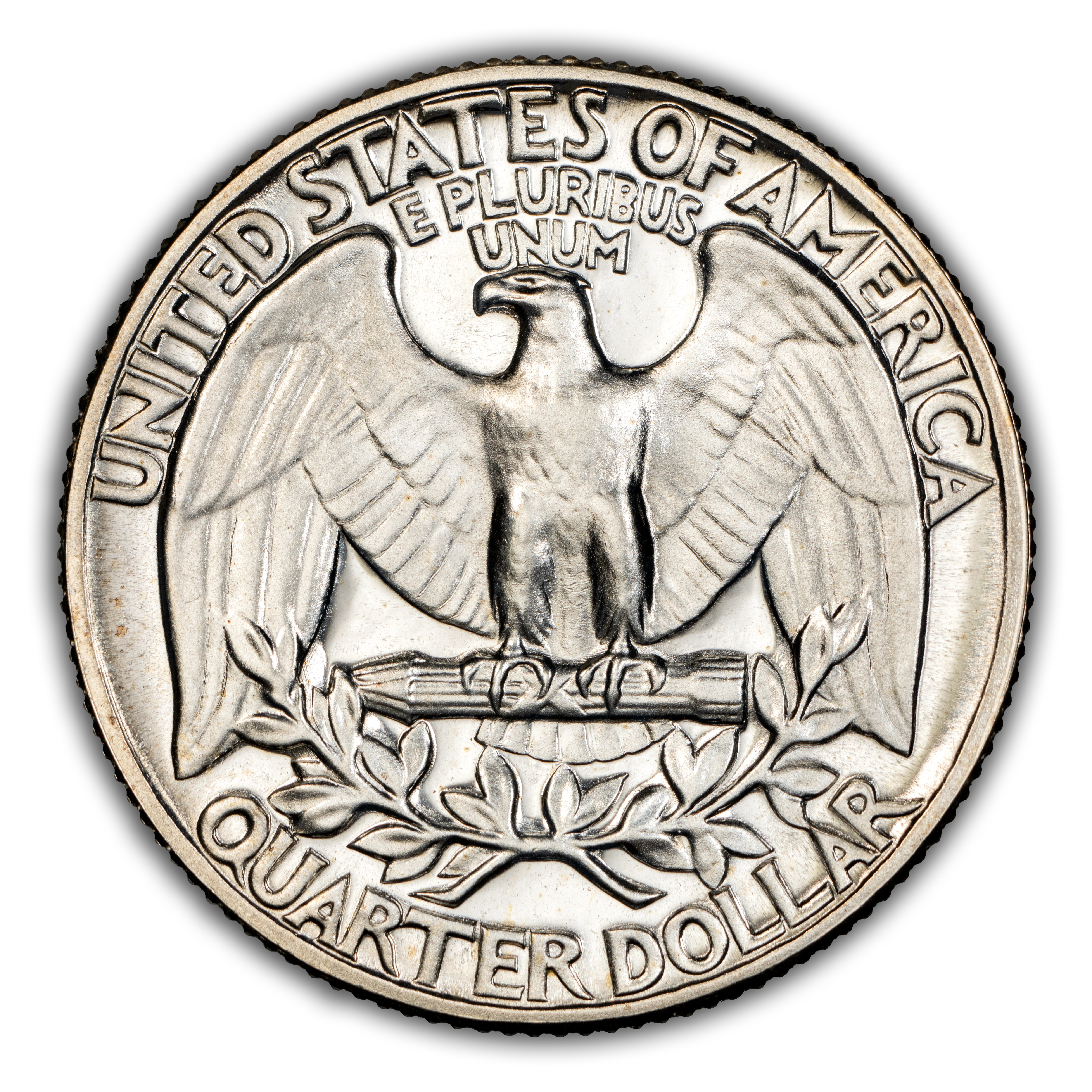 Reverse: Large eagle with wings fully extended, clutching a bundle of arrows with the words UNITED STATES OF AMERICA at the top periphery; QUARTER DOLLAR at the bottom. An olive leaf is positioned between the eagle and the denomination.