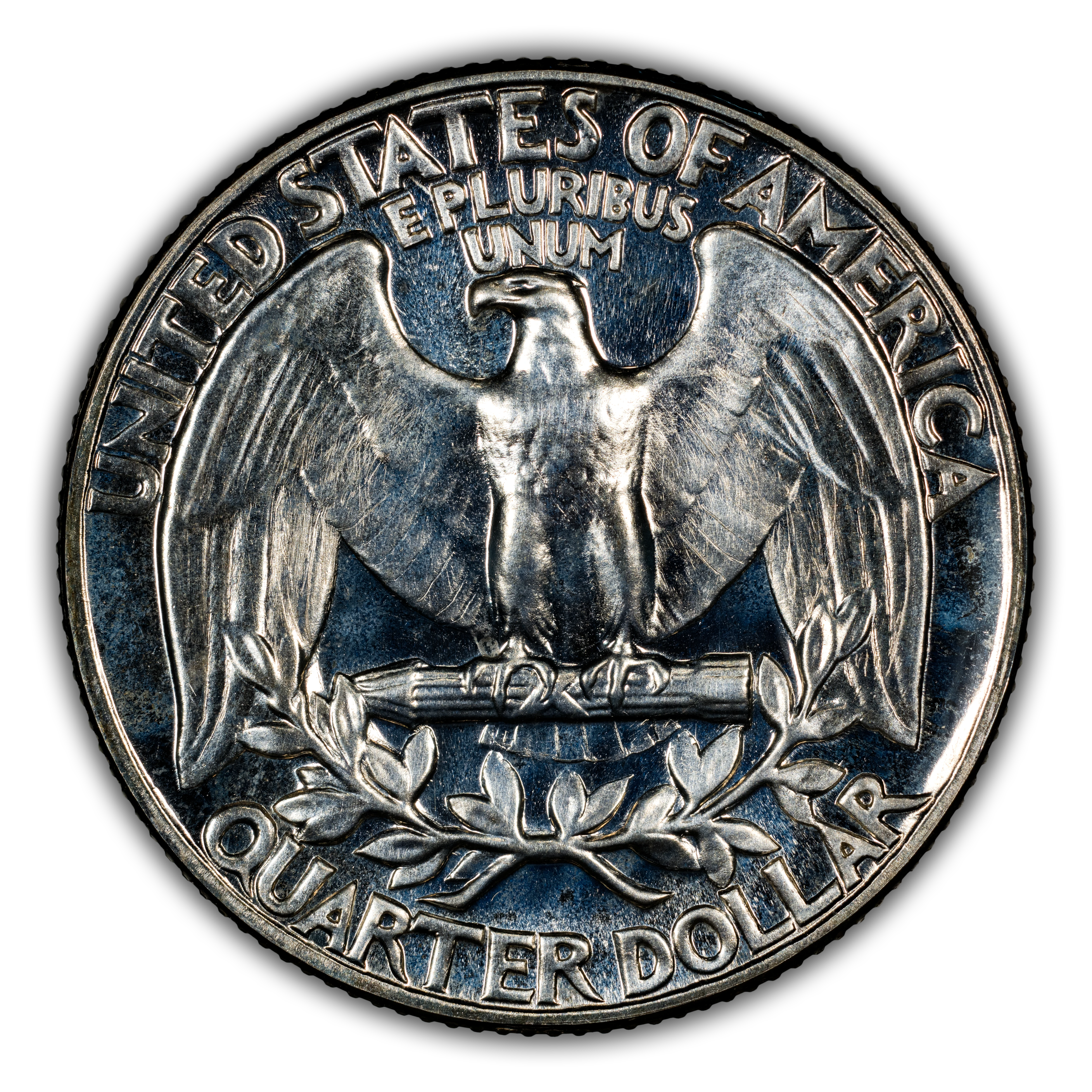 Reverse: Large eagle with wings fully extended, clutching a bundle of arrows with the words UNITED STATES OF AMERICA at the top periphery; QUARTER DOLLAR at the bottom. An olive leaf is positioned between the eagle and the denomination.