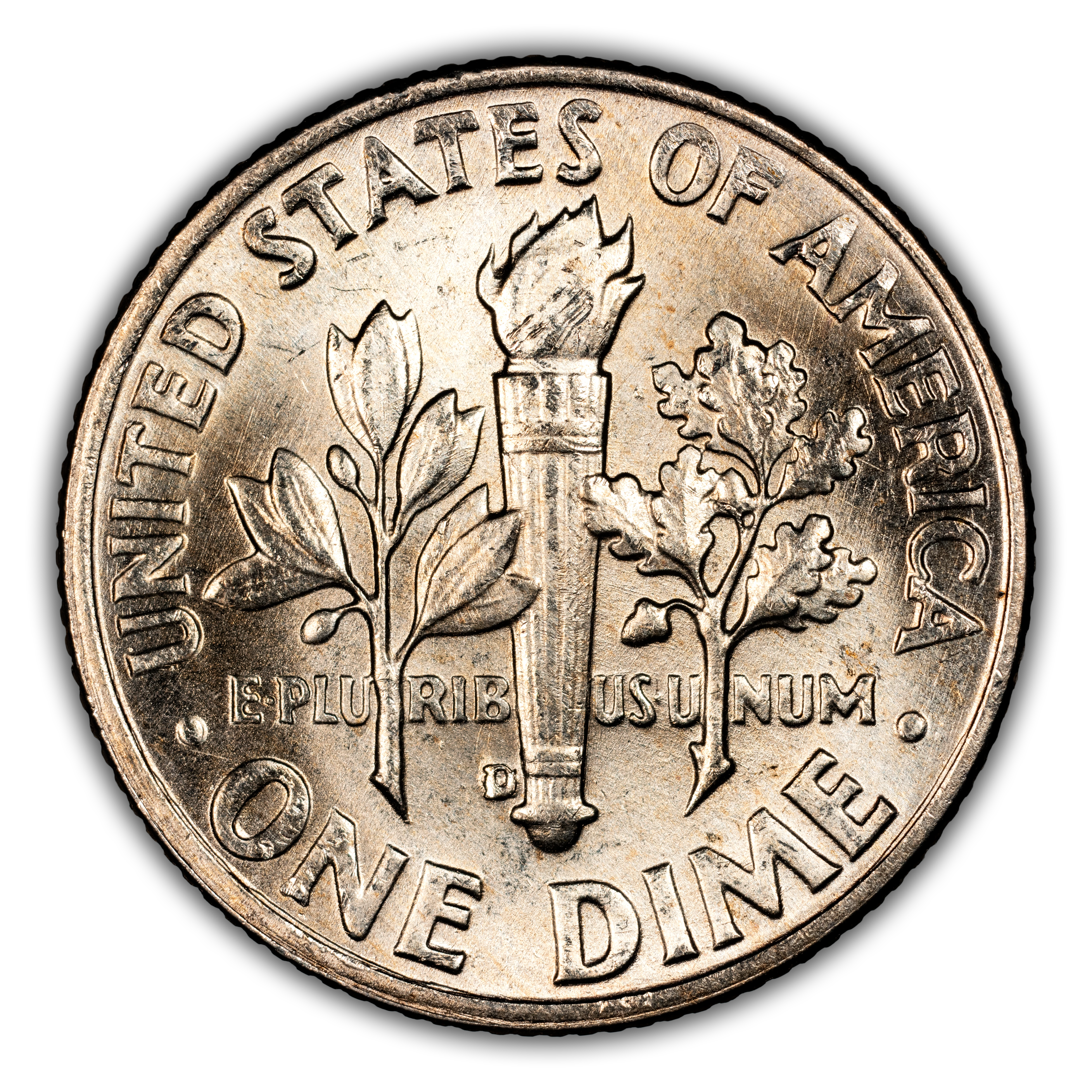 Reverse: Torch of Liberty is flanked by olive branches in the center with UNITED STATES OF AMERICA * ONE DIME around the circumference.