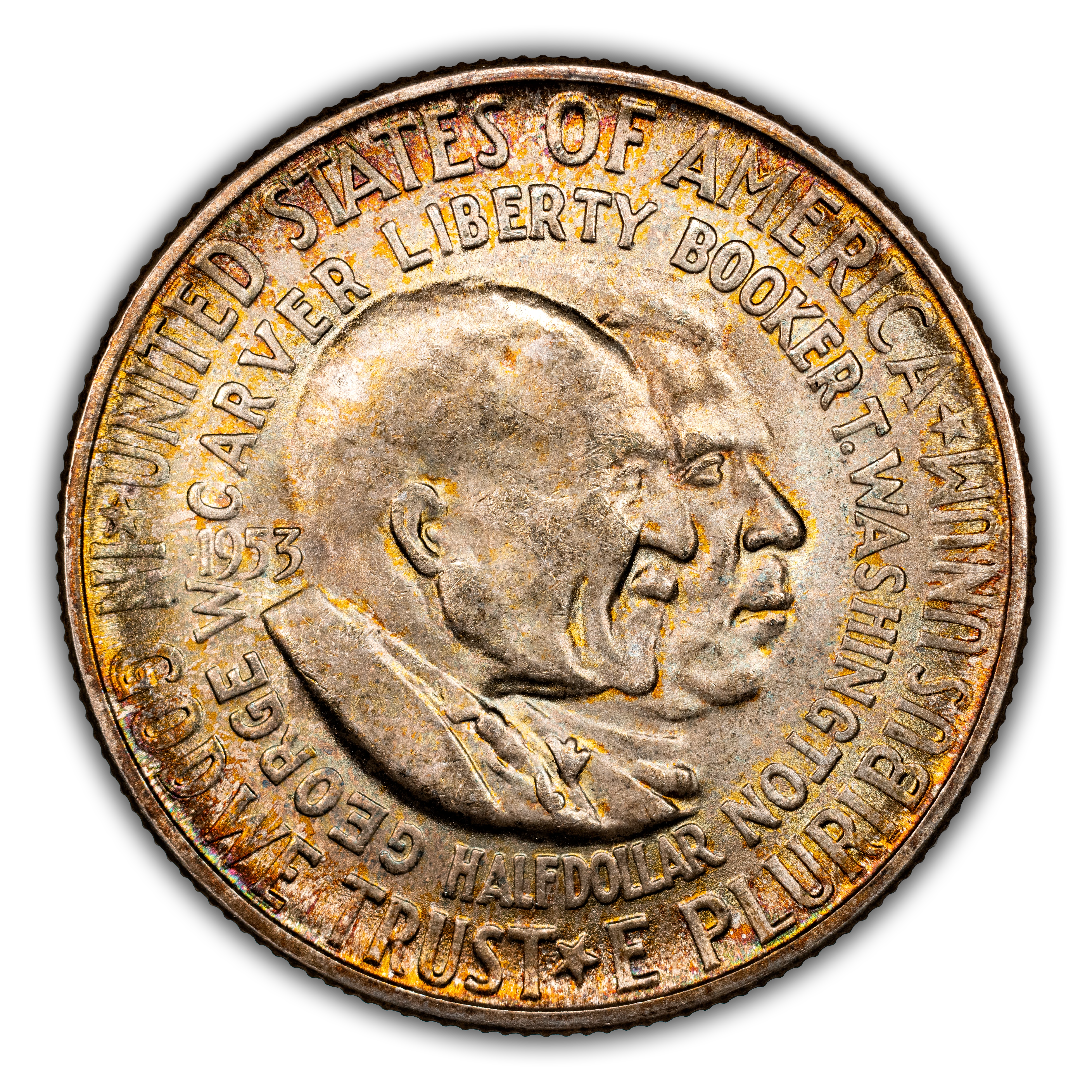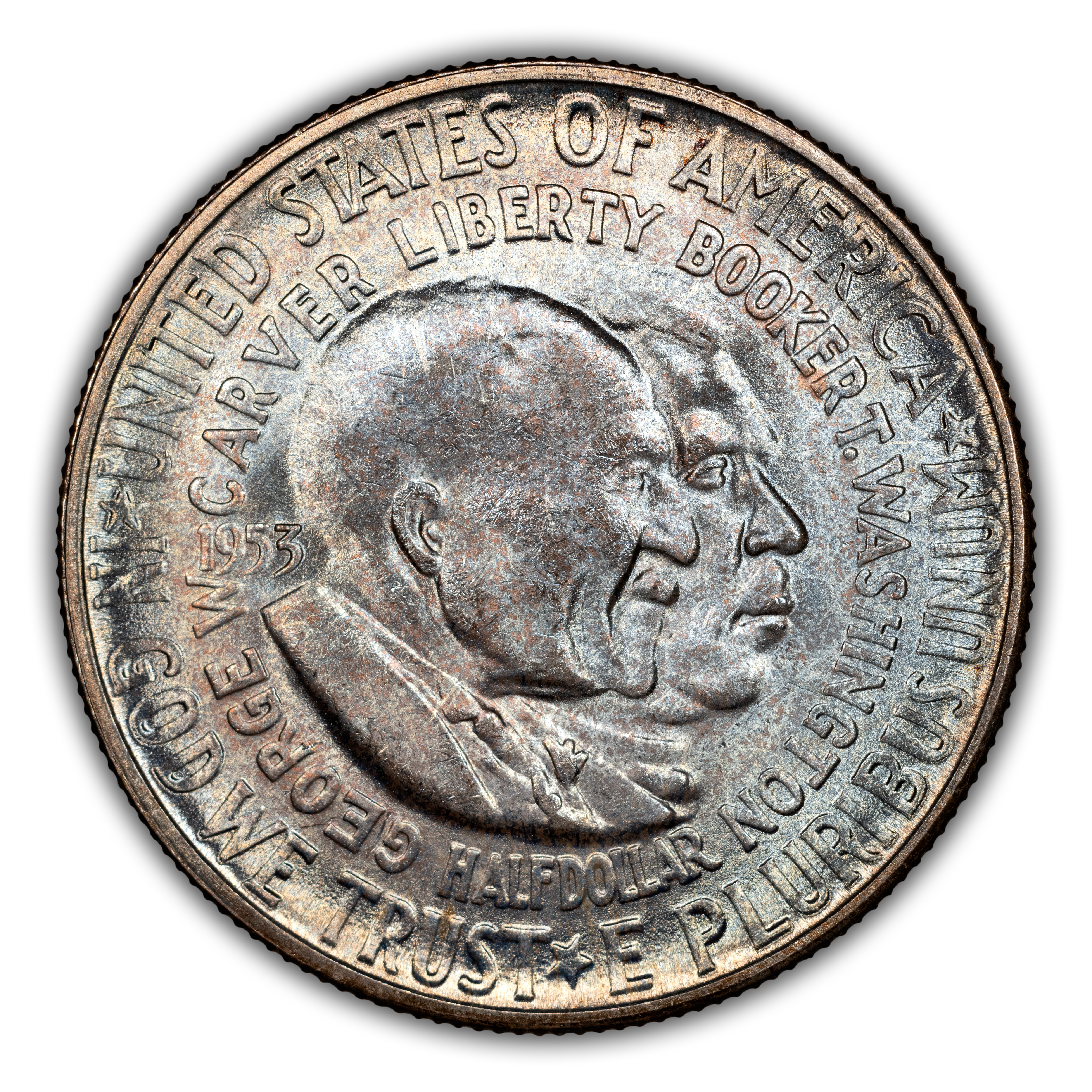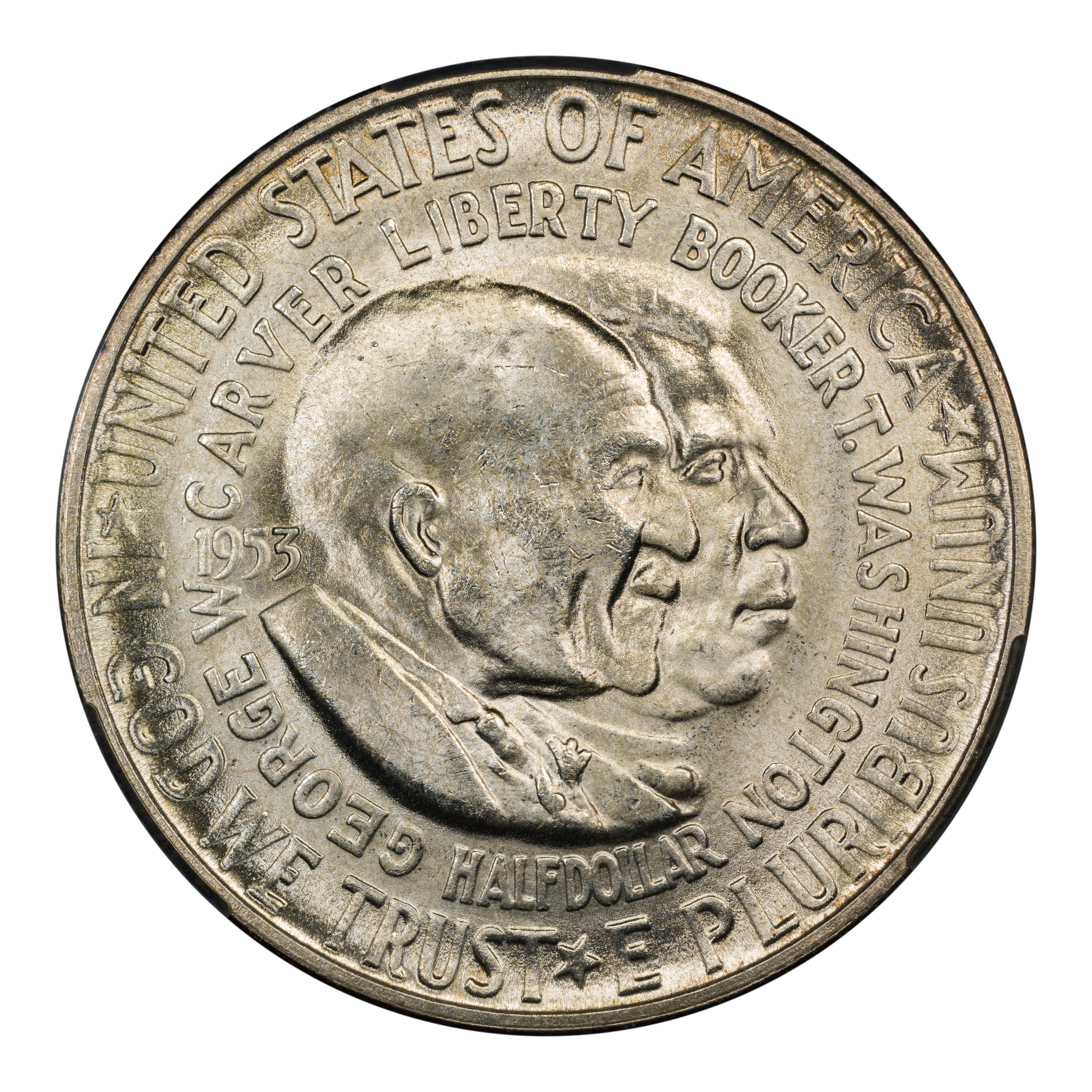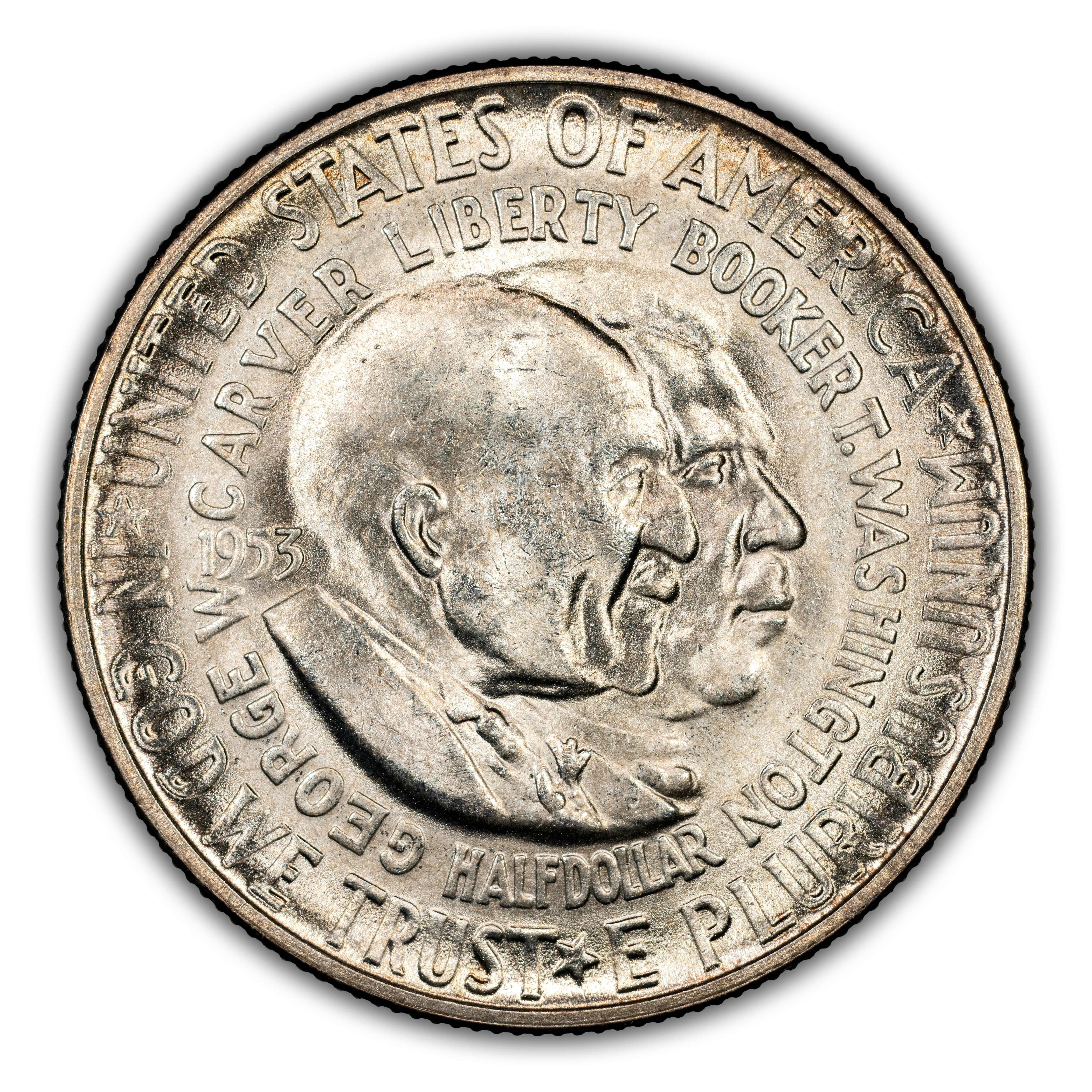 The 1953 Washington-Carver commemorative half dollars honor the memories of two prominent African American leaders of the late 19th and early 20th centuries, with Booker T. Washington -- pioneering author and presidential advisor and Carver -- renowned scientist and inventor. Both are pictured in -- jugate portrait by Isaac Scott Hathaway, the first African American to design -- U.S. coin with his Booker T. Washington type debuting in 1946.