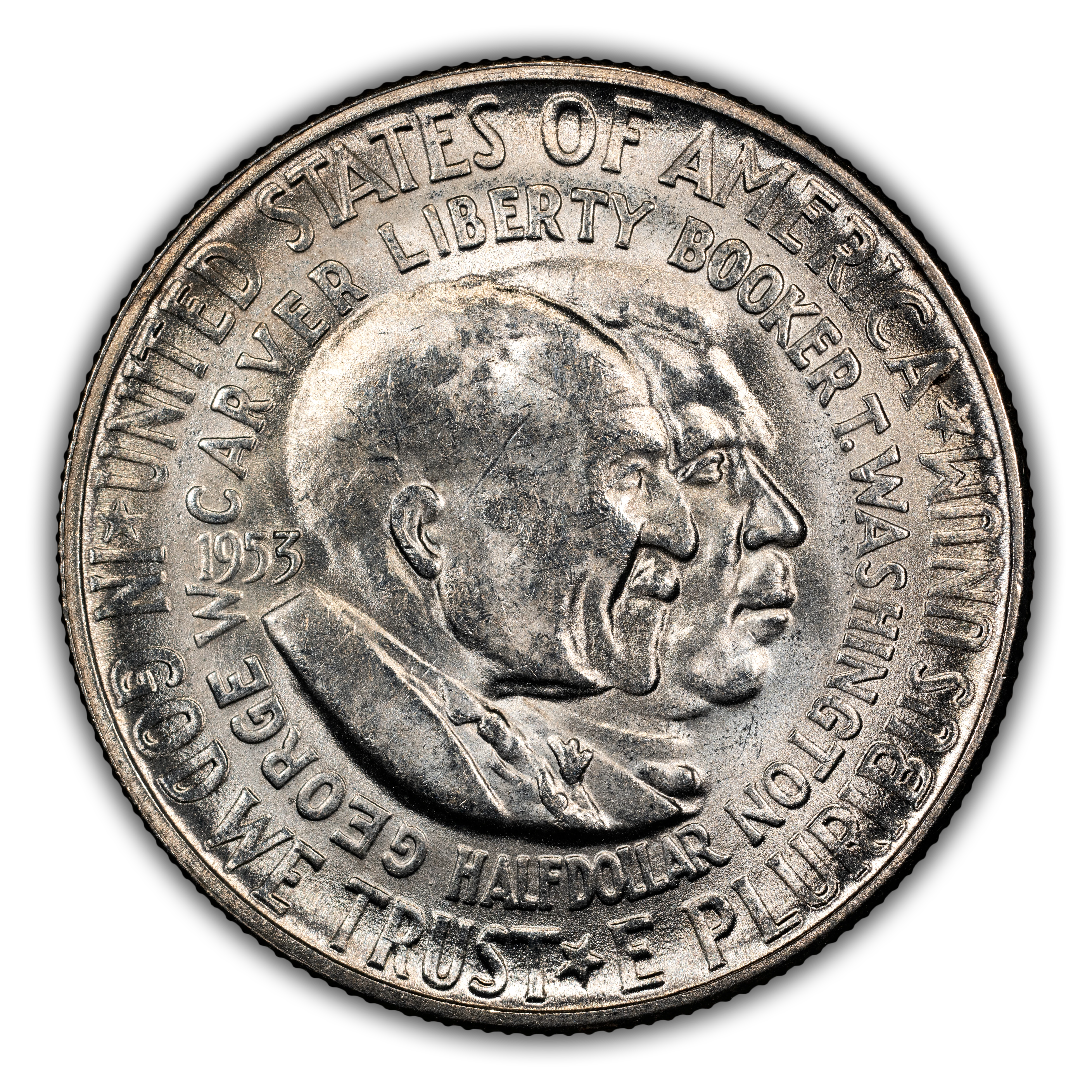 The 1953 Washington-Carver commemorative half dollars honor the memories of two prominent African American leaders of the late 19th and early 20th centuries, with Booker T. Washington -- pioneering author and presidential advisor and Carver -- renowned scientist and inventor. Both are pictured in -- jugate portrait by Isaac Scott Hathaway, the first African American to design -- U.S. coin with his Booker T. Washington type debuting in 1946.