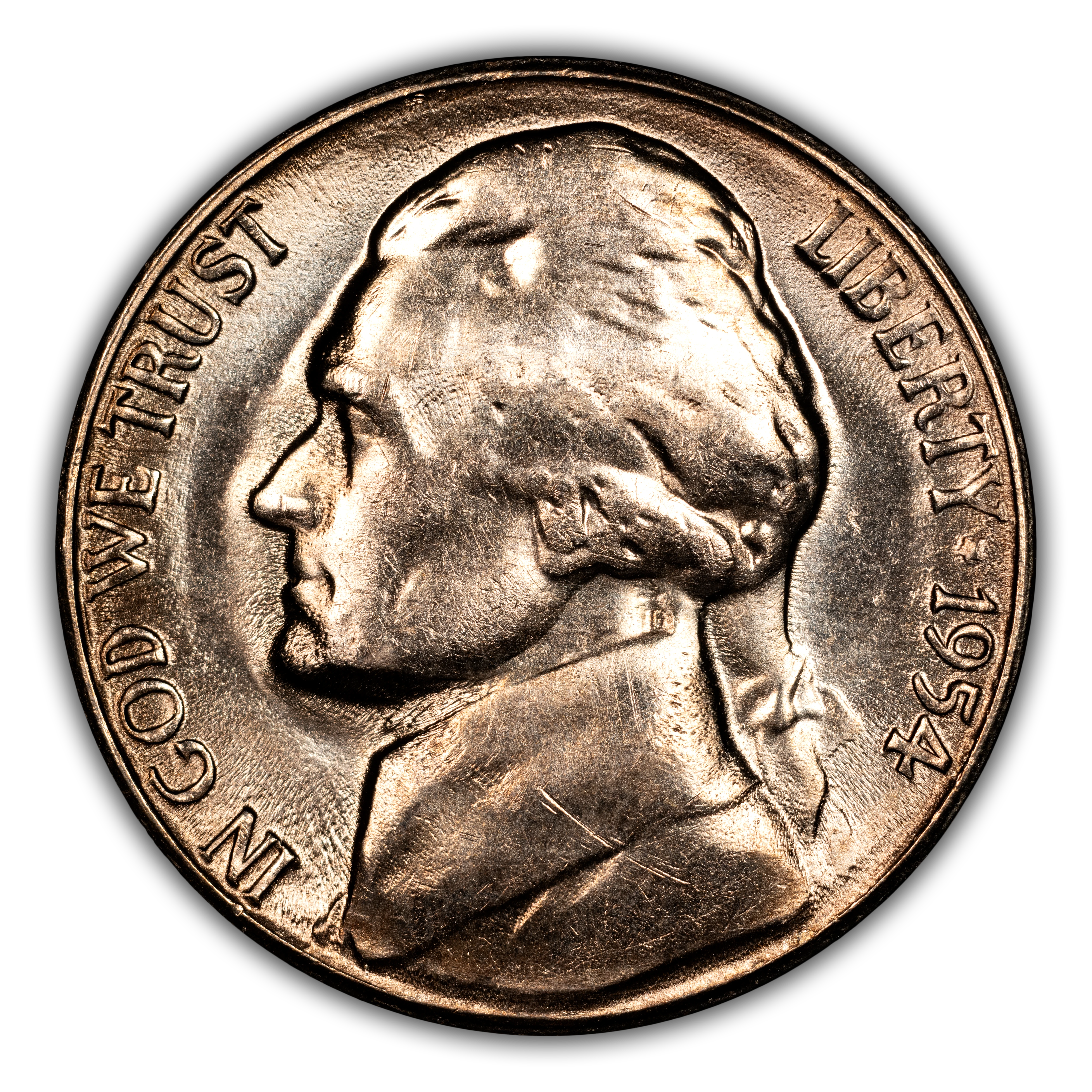 Obverse: Felix Schlag's portrait of Jefferson, facing left, with the motto IN GOD WE TRUST on the left periphery, and LIBERTY * [year] on the right side.