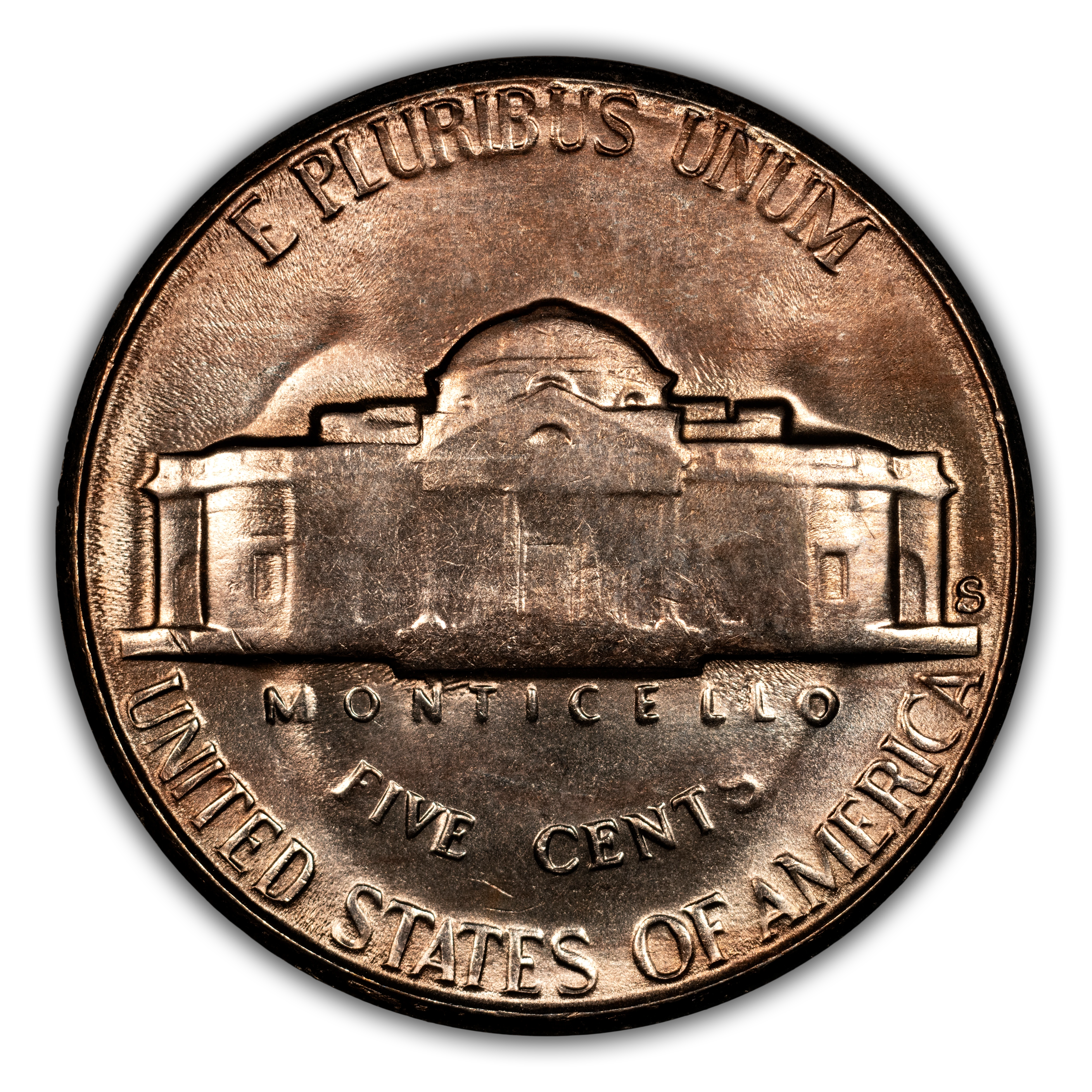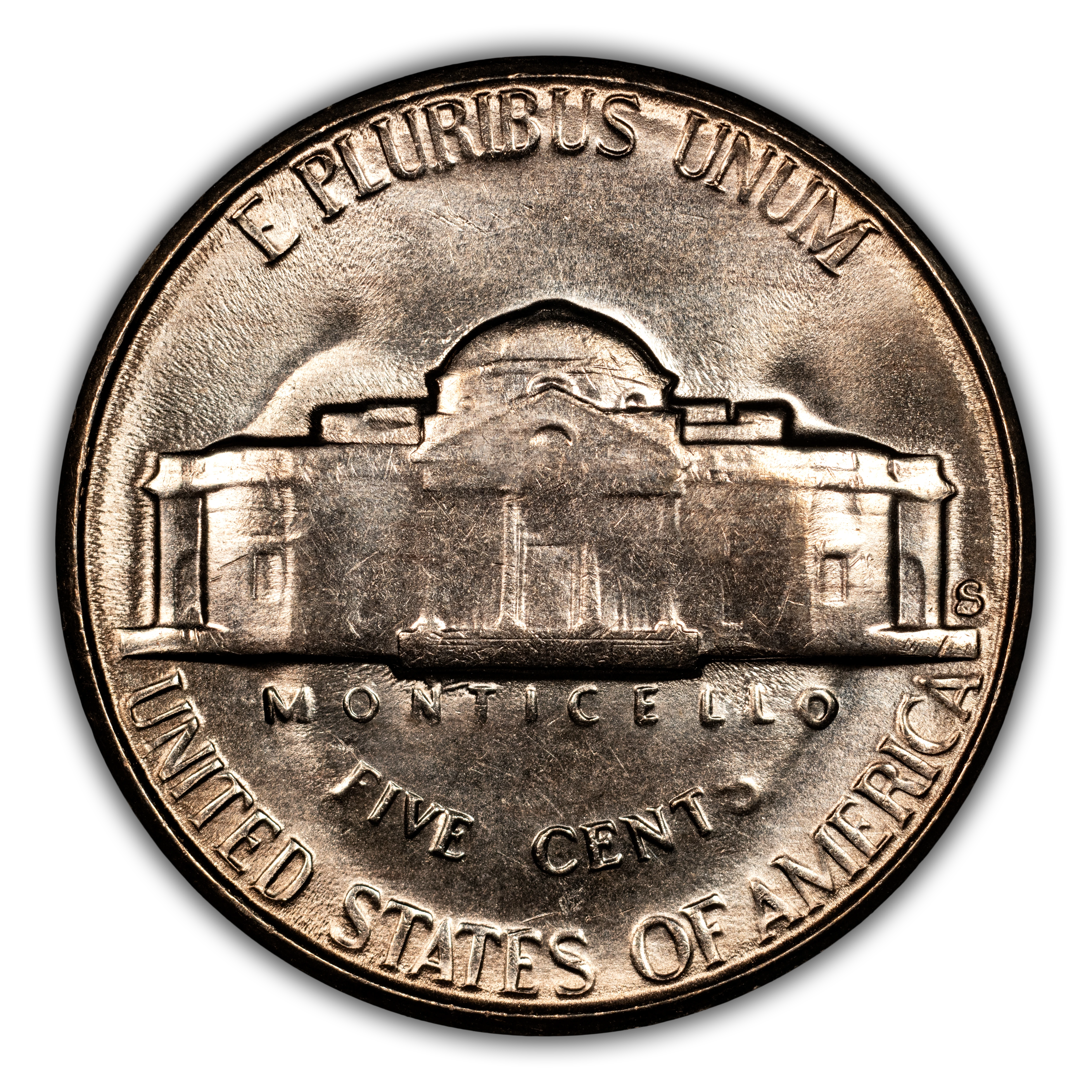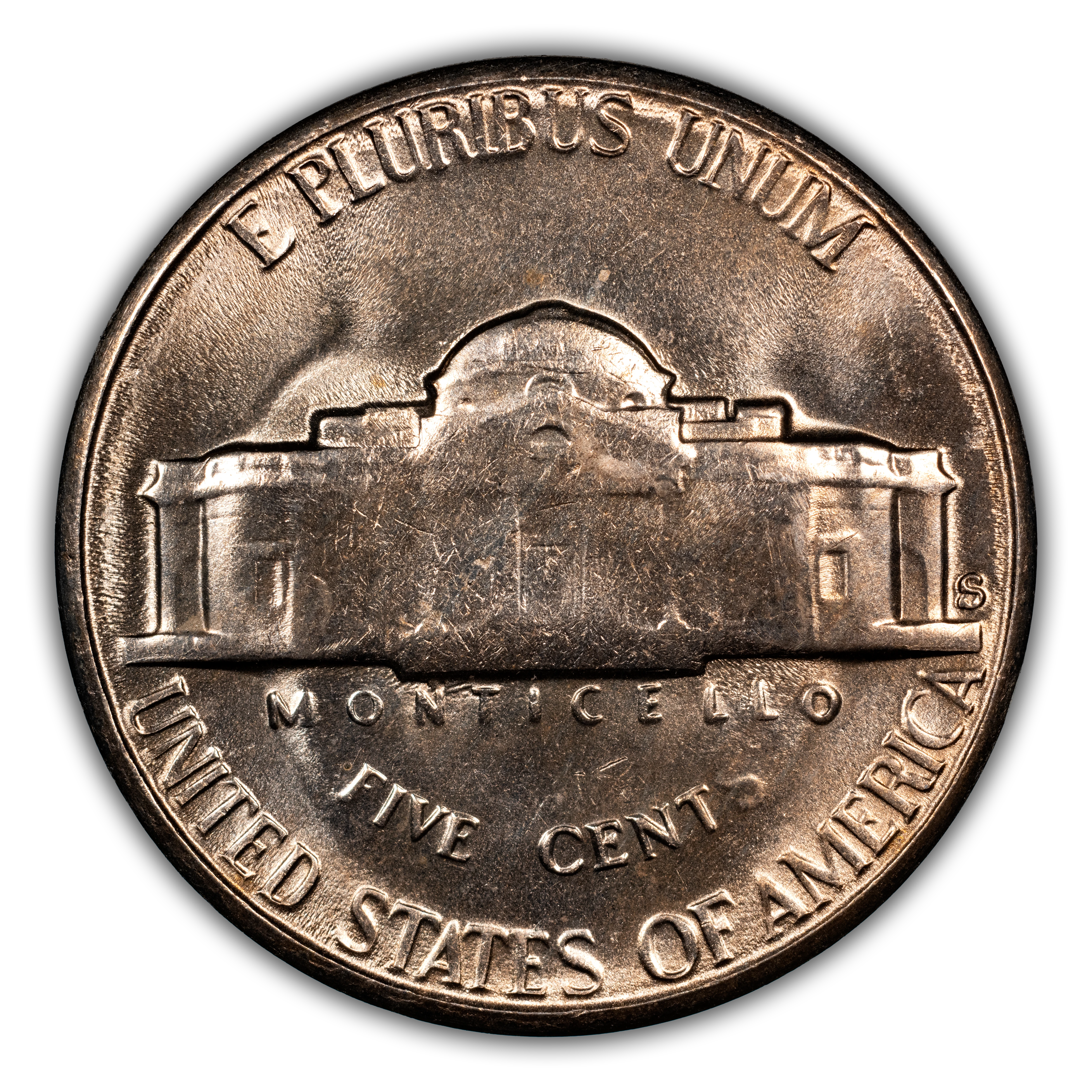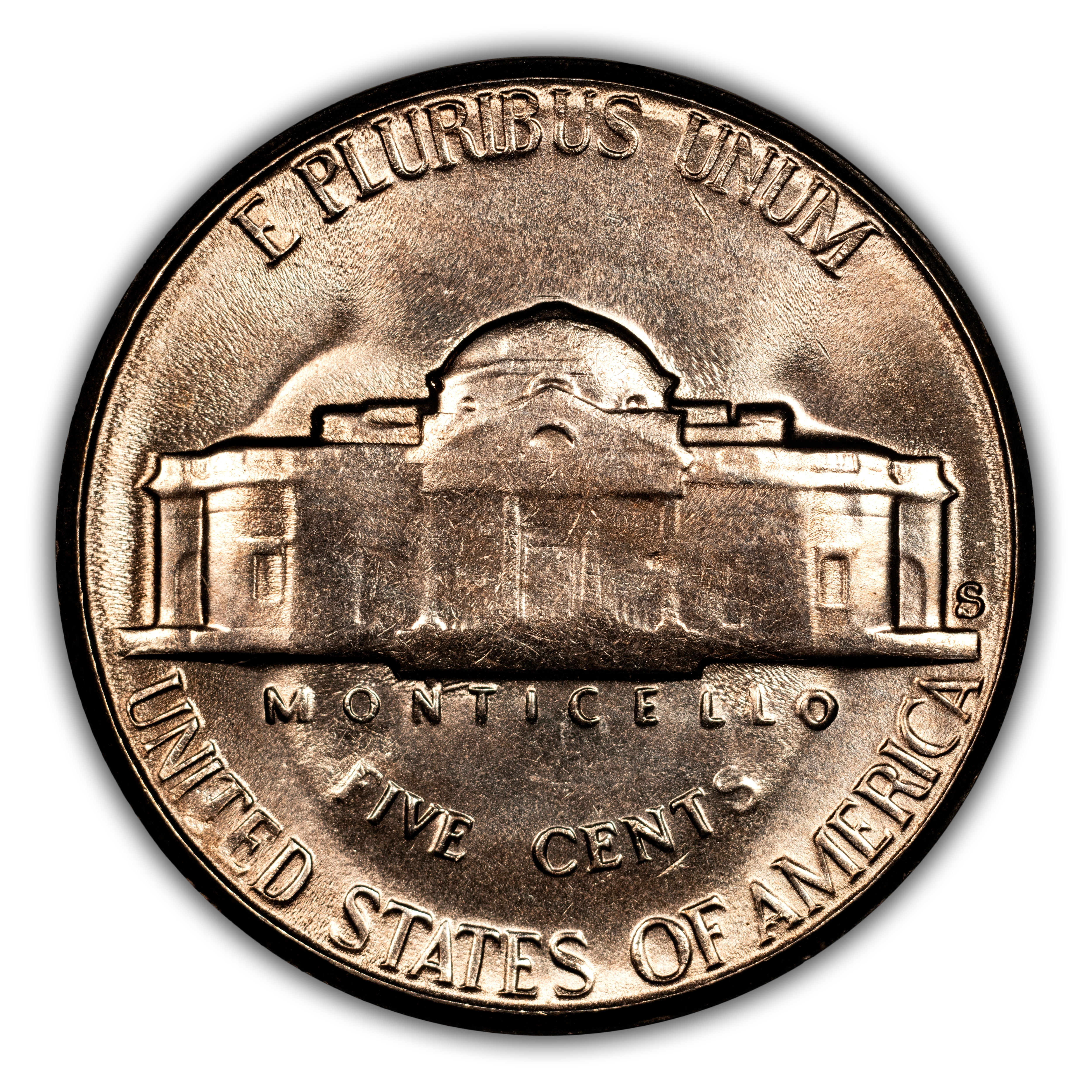 Reverse: The Jefferson home is prominently centered with the name MONTICELLO captioned below. The denomination FIVE CENTS is spelled out in half circle underneath and the words E PLURIBUS UNUM and UNITED STATES OF AMERICA appear at the top and bottom periphery. The mintmark is positioned on the right side of Monticello.