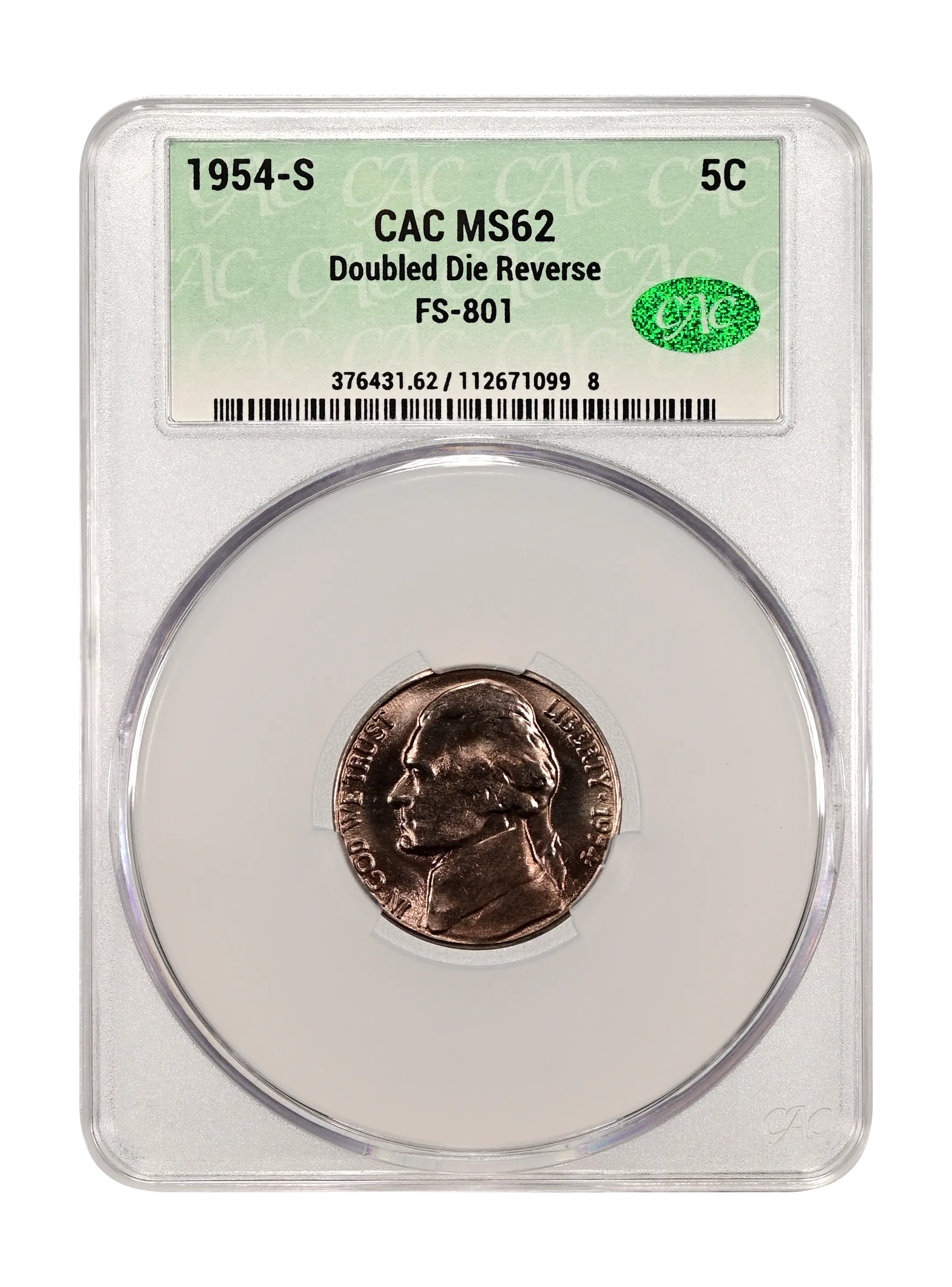 1954-S Doubled Die Reverse 5c FS-801 CAC MS62