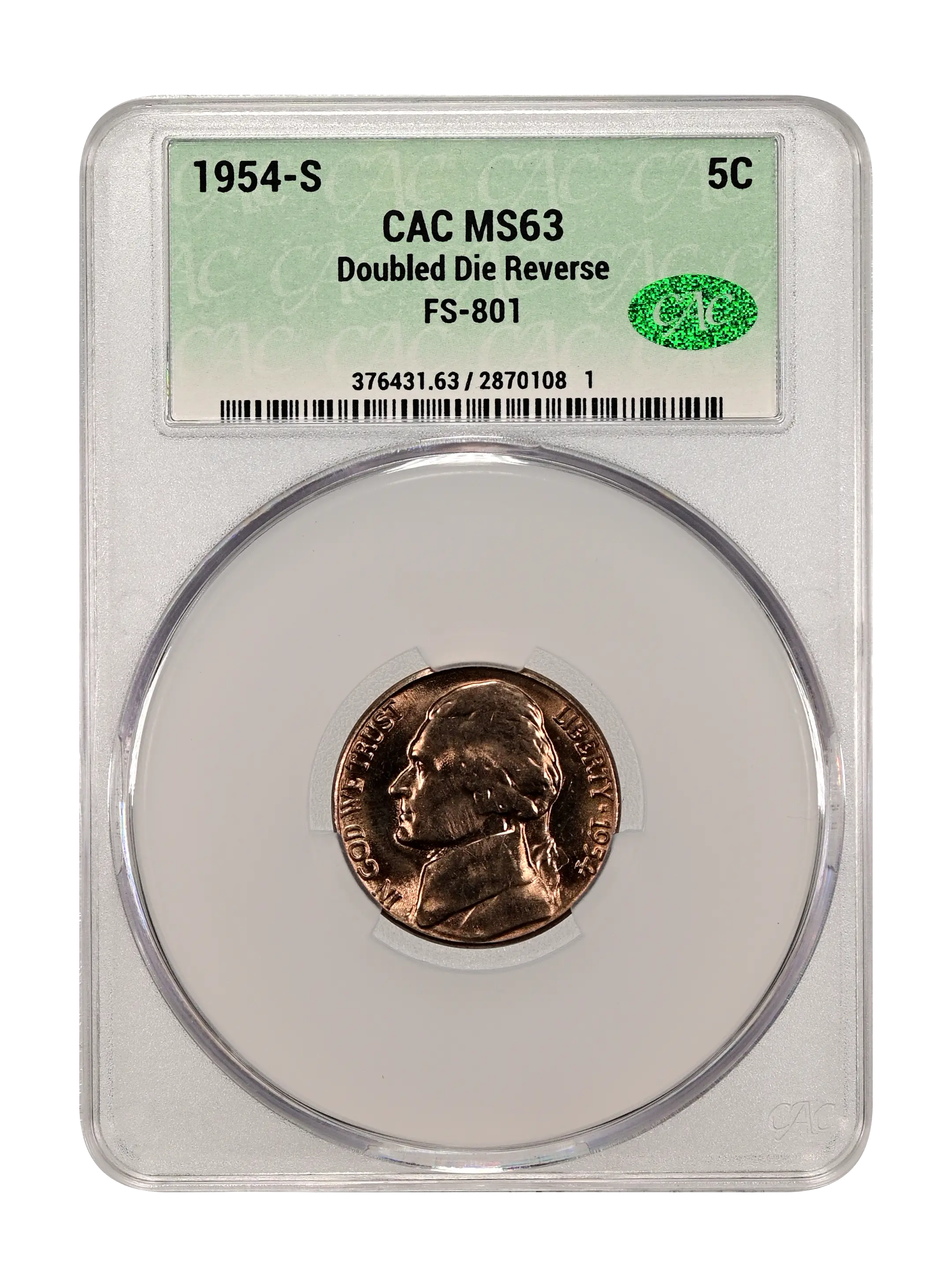 1954-S Doubled Die Reverse 5c FS-801 CAC MS63
