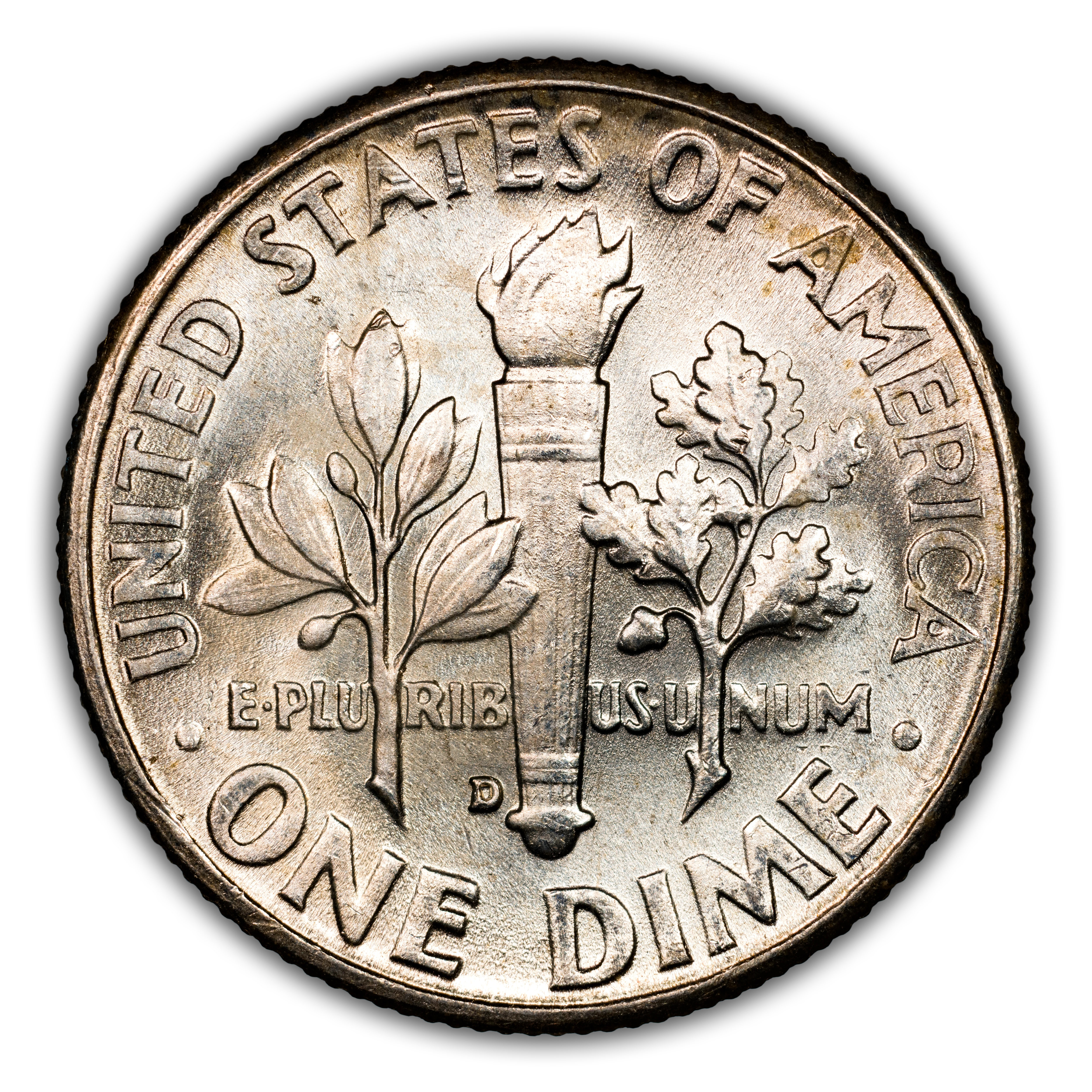 Reverse: Torch of Liberty is flanked by olive branches in the center with UNITED STATES OF AMERICA * ONE DIME around the circumference.
