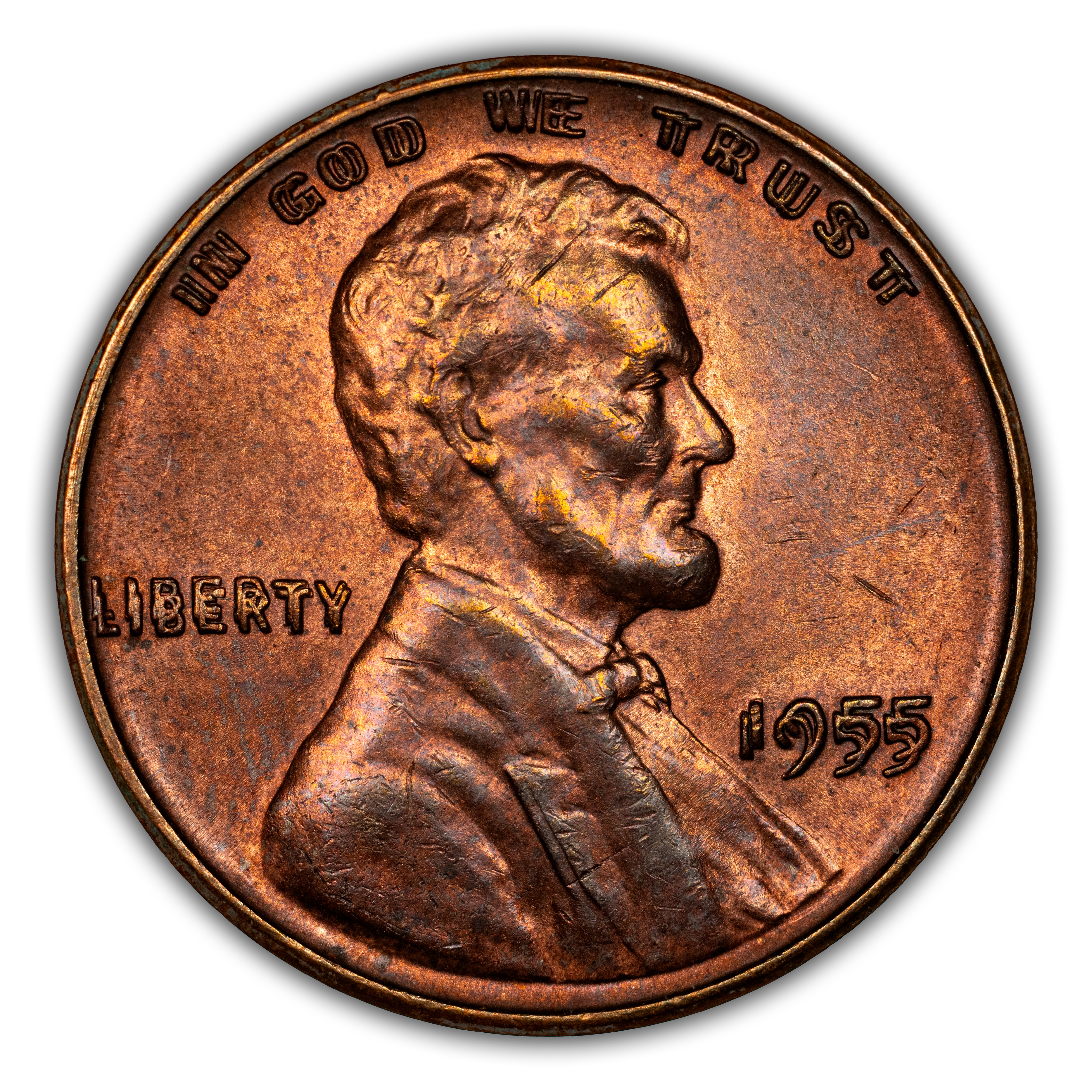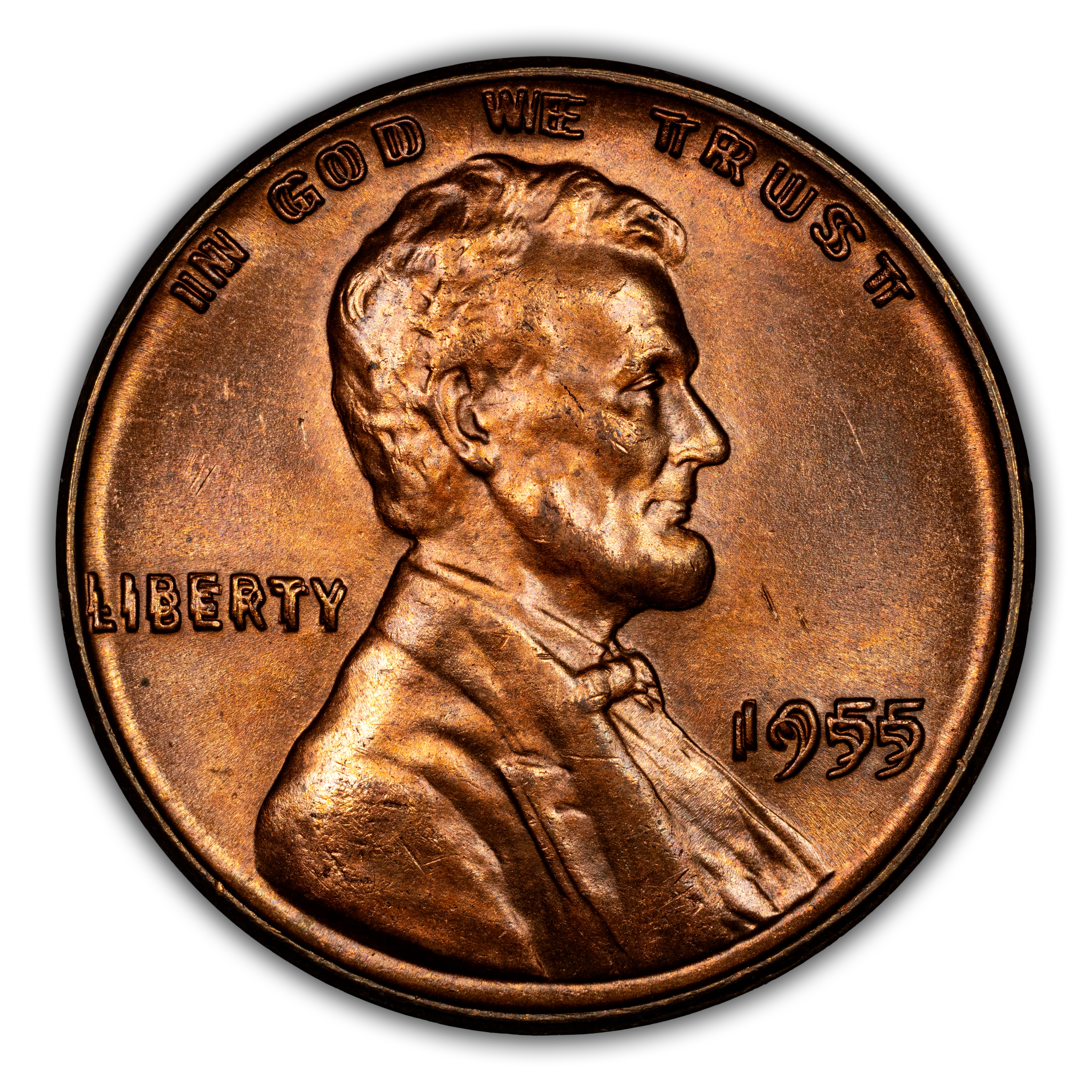 The 1955 doubled die Lincoln cent is perhaps the most well-known variety error in all of numismatics. This is partly due to its minting and discovery happening most serendipitously during a period when coin collecting was enjoying a boom in popularity during the post-war years of the 1950s. Many examples turned up in 23-cent packs of cigarettes containing two one-cent coins as change via vending machines that accepted only quarters. These coins were found mainly in New England, though they popped up elsewhere as well. Numismatic legend has it that mint employees were aware that several thousand 1955 doubled die cents had been made by accident but opted to let them go instead of recalling and destroying a batch of Lincoln cents numbering into the tens of thousands. Doubling is easily seen with the naked eye in the date, inscription LIBERTY and motto IN GOD WE TRUST.