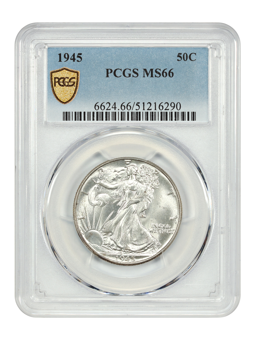 Reverse: The Liberty bell is prominently featured with the words UNITED STATES OF AMERICA and HALF DOLLAR around the periphery. The motto, E PLURIBUS UNUM is left of the bell, with a eagle -- wings fully spread -- to the right.