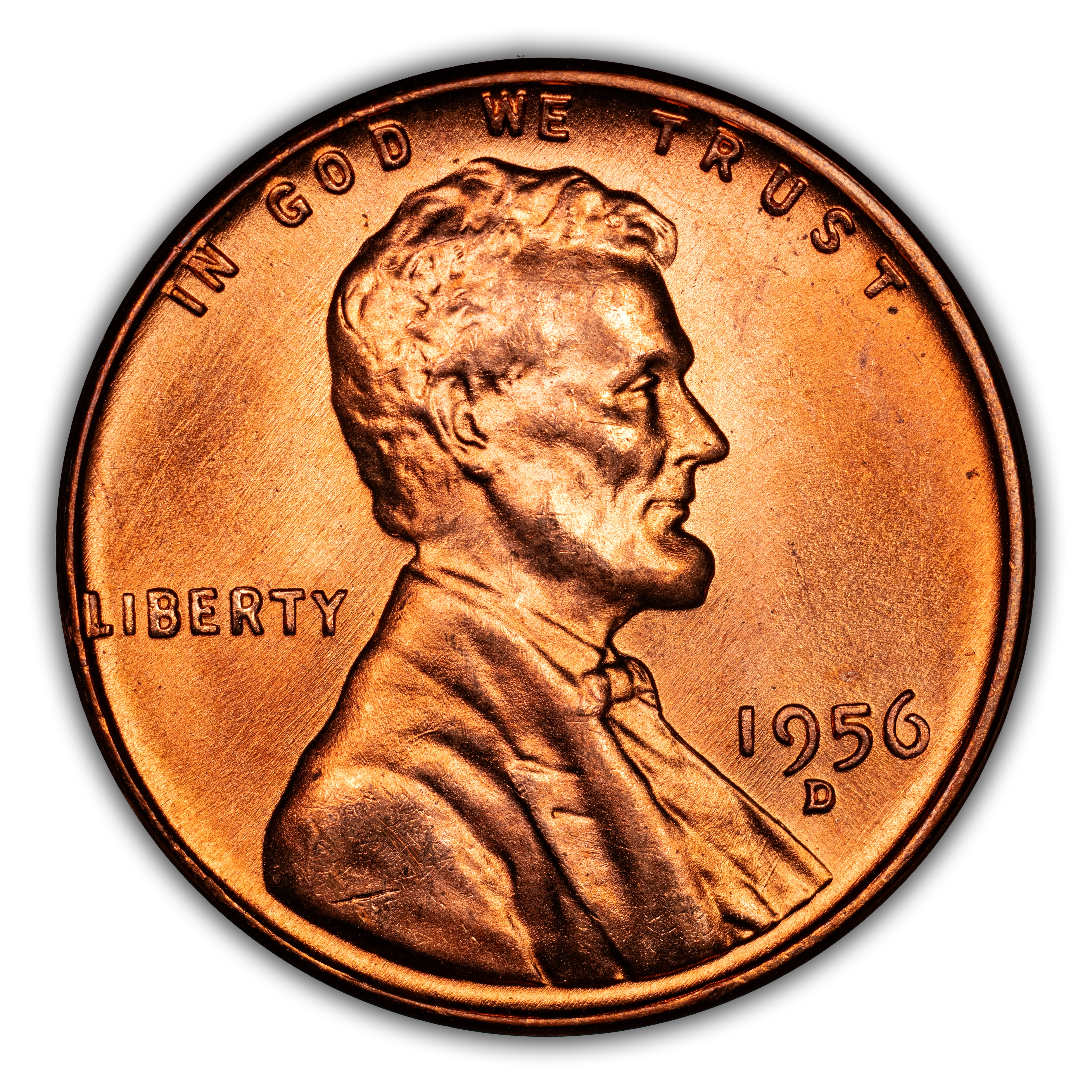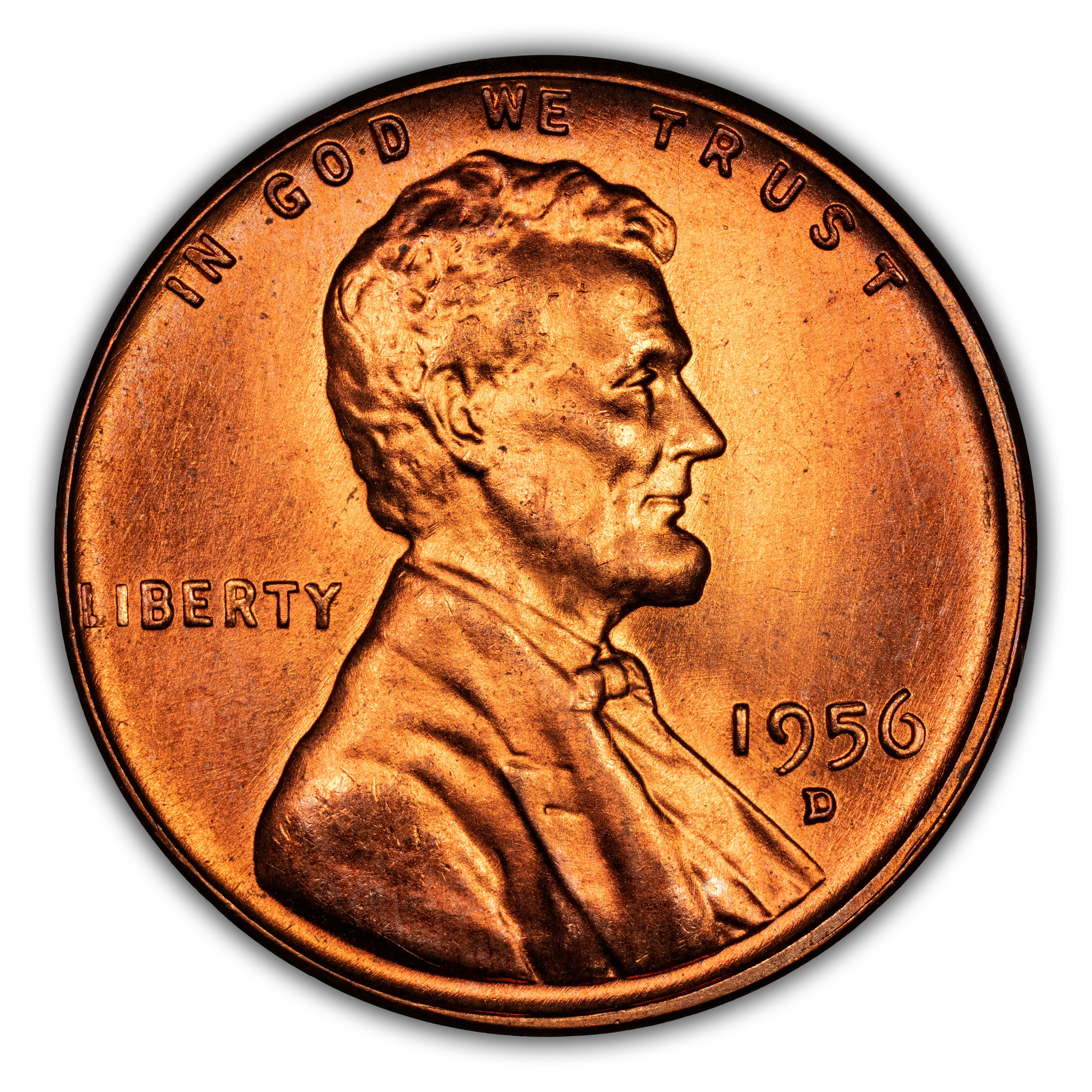 The 1956-D penny is commonly found in all circulated grades and in Gem levels up through MS66, above which this issue becomes a real rarity. Registry set collectors pay high premiums for the chance to own one of but a small number of examples grading MS67 or higher.