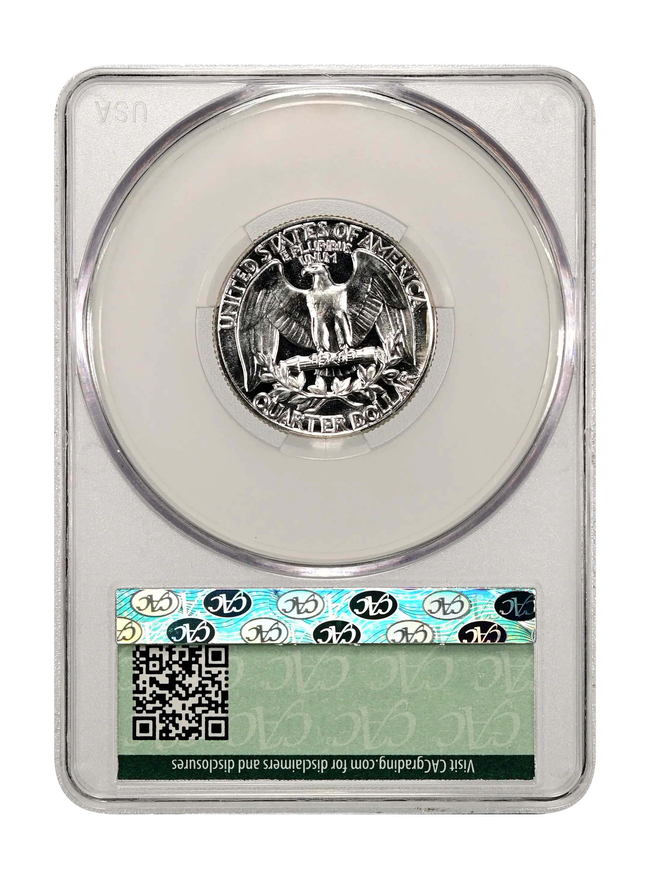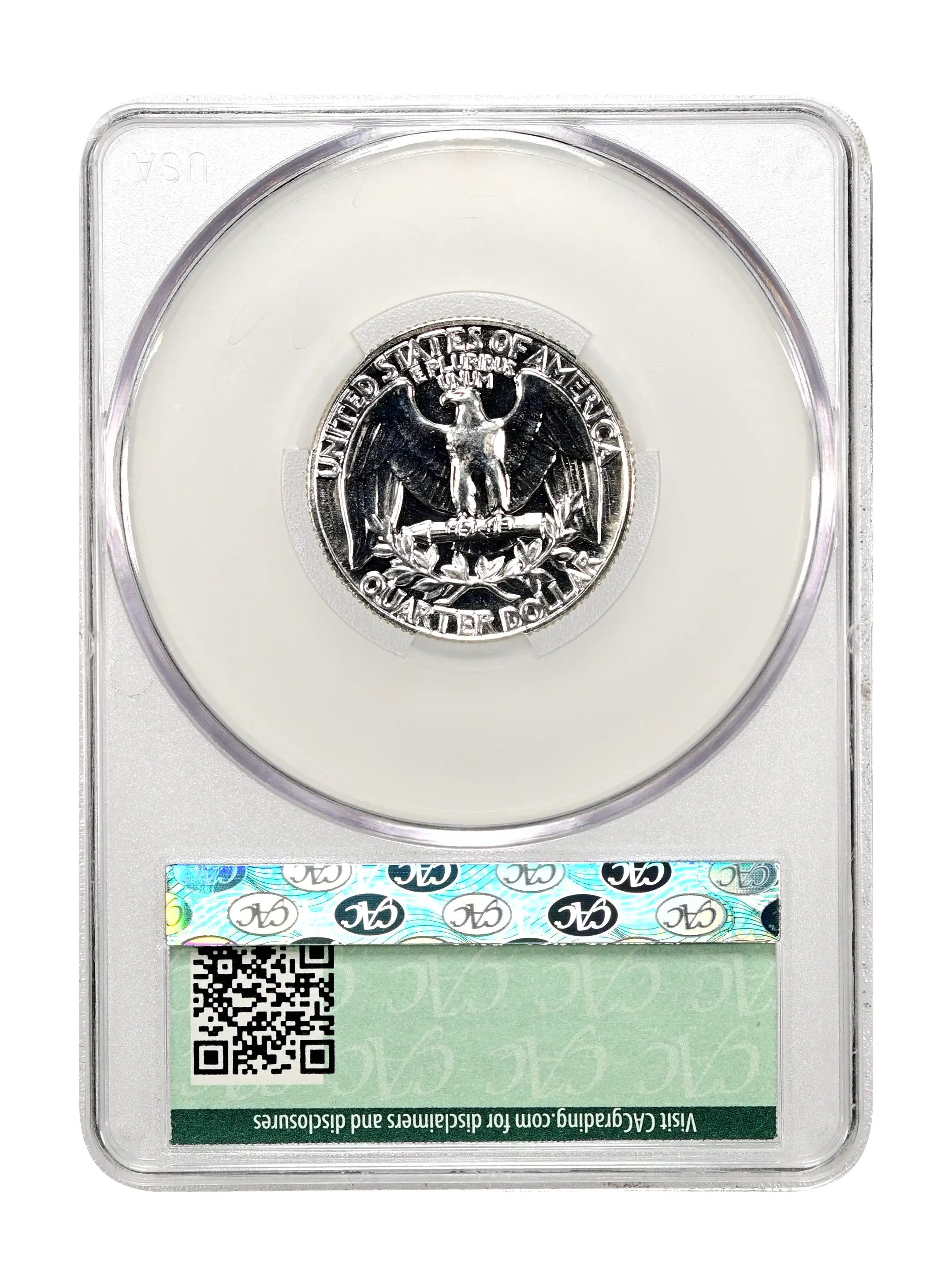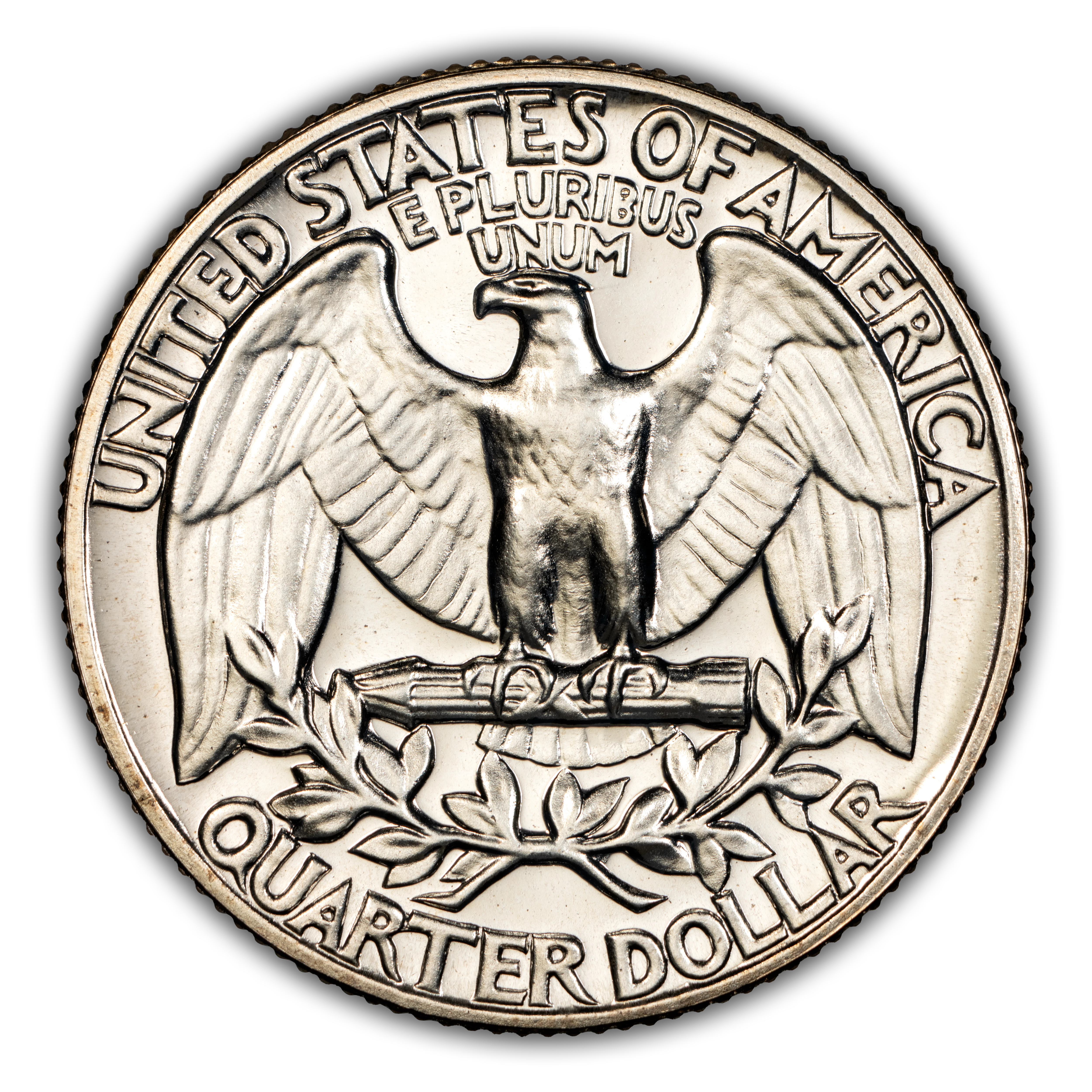 Reverse: Large eagle with wings fully extended, clutching a bundle of arrows with the words UNITED STATES OF AMERICA at the top periphery; QUARTER DOLLAR at the bottom. An olive leaf is positioned between the eagle and the denomination.