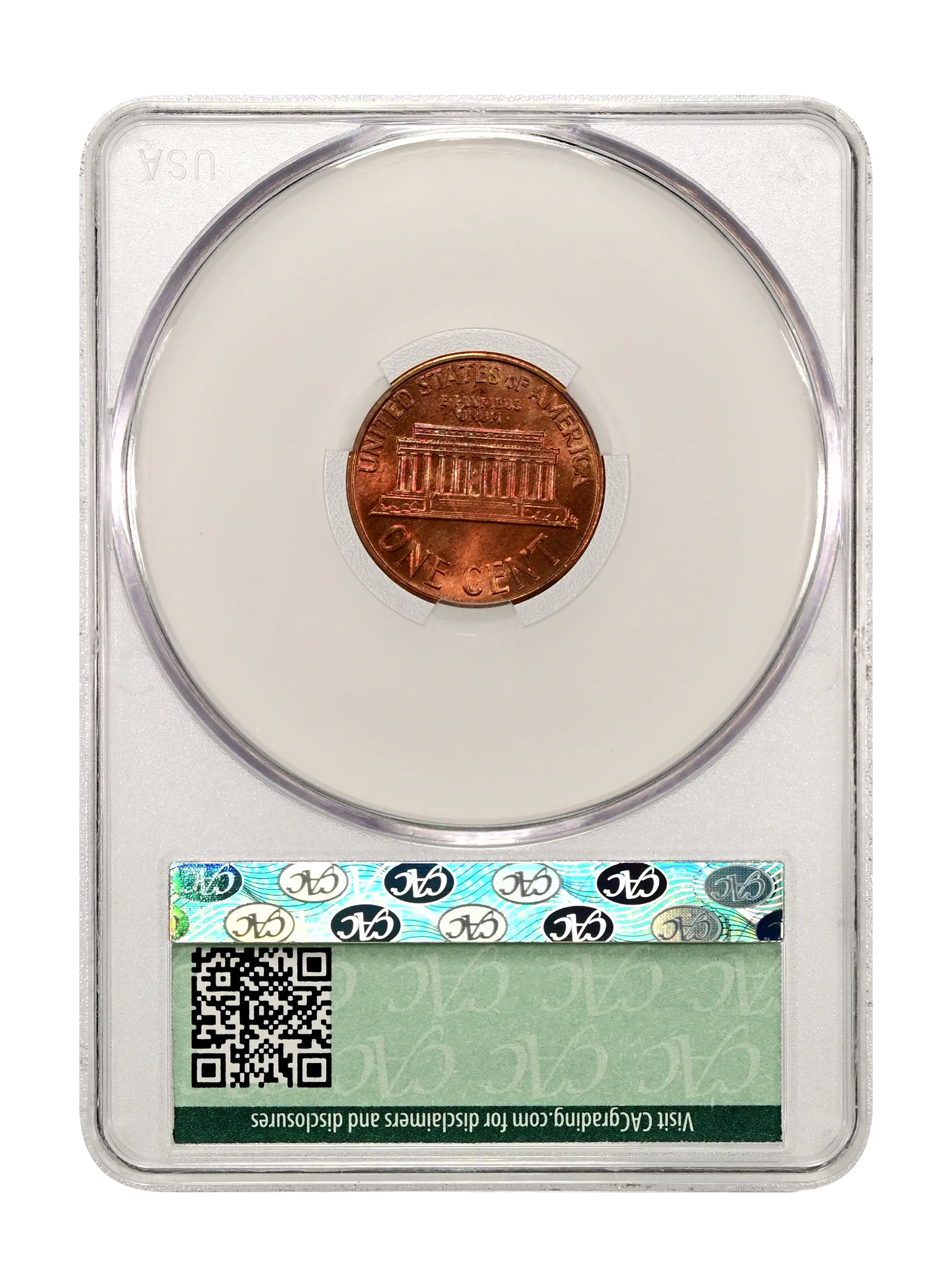 Reverse: Lincoln memorial building centered with words ONE CENT, UNITED STATES OF AMERICA on top and bottom periphery. E PLURIBUS UNUM centered above the top of the memorial.