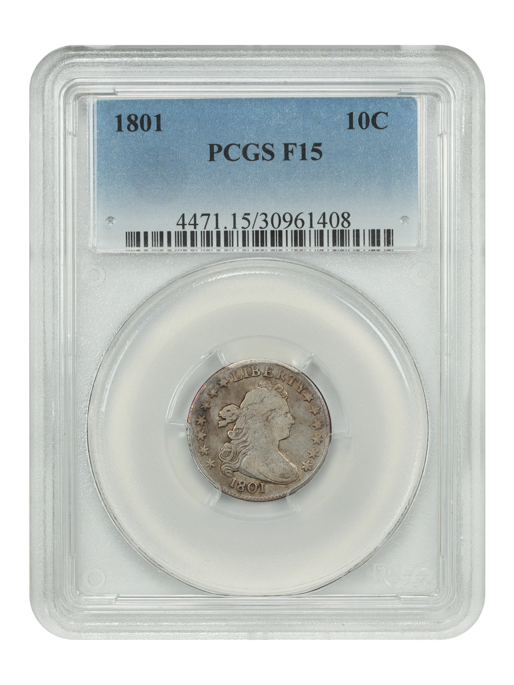 Reverse: Torch of Liberty is flanked by olive branches in the center with UNITED STATES OF AMERICA * ONE DIME around the circumference.
