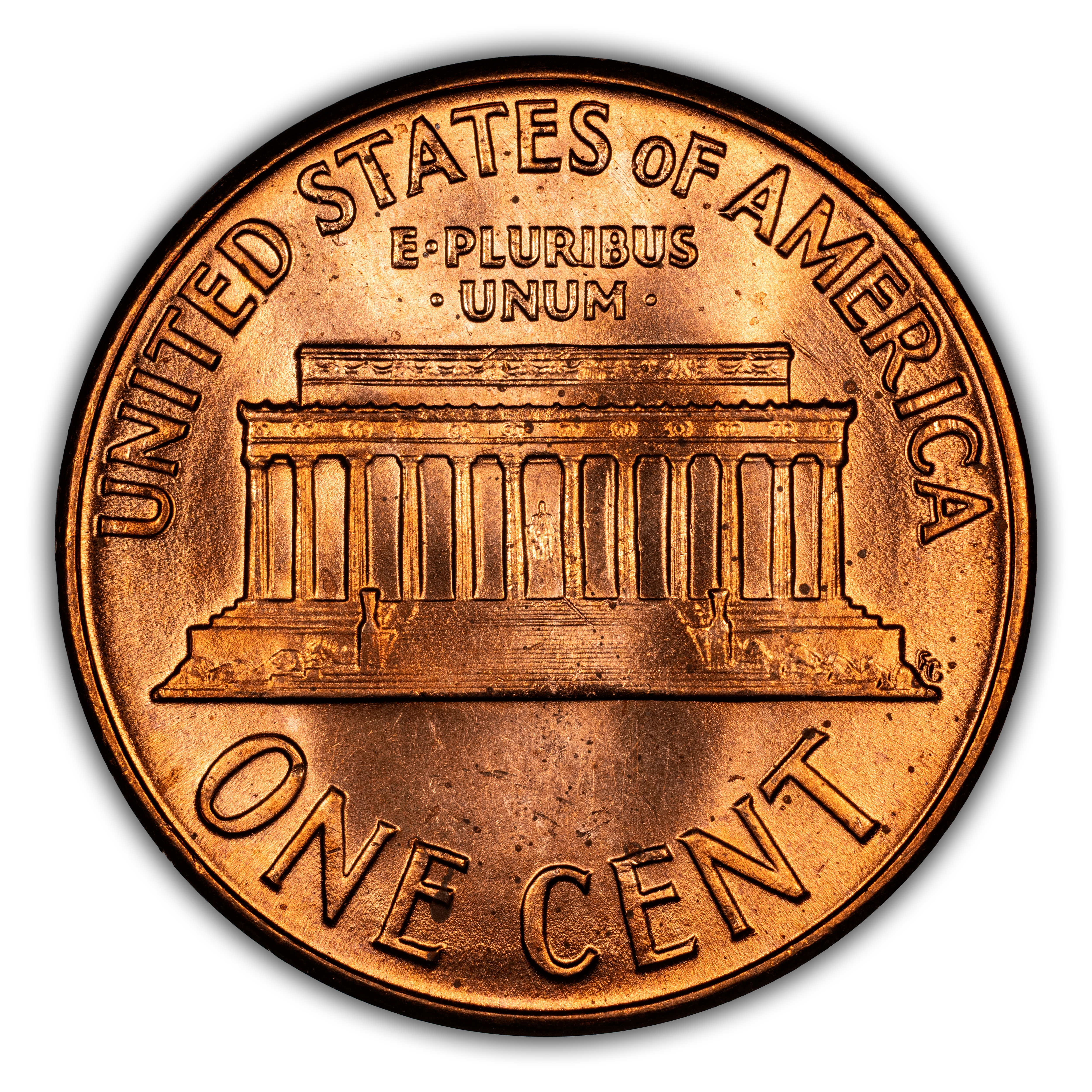 Reverse: Lincoln memorial building centered with words ONE CENT, UNITED STATES OF AMERICA on top and bottom periphery. E PLURIBUS UNUM centered above the top of the memorial.