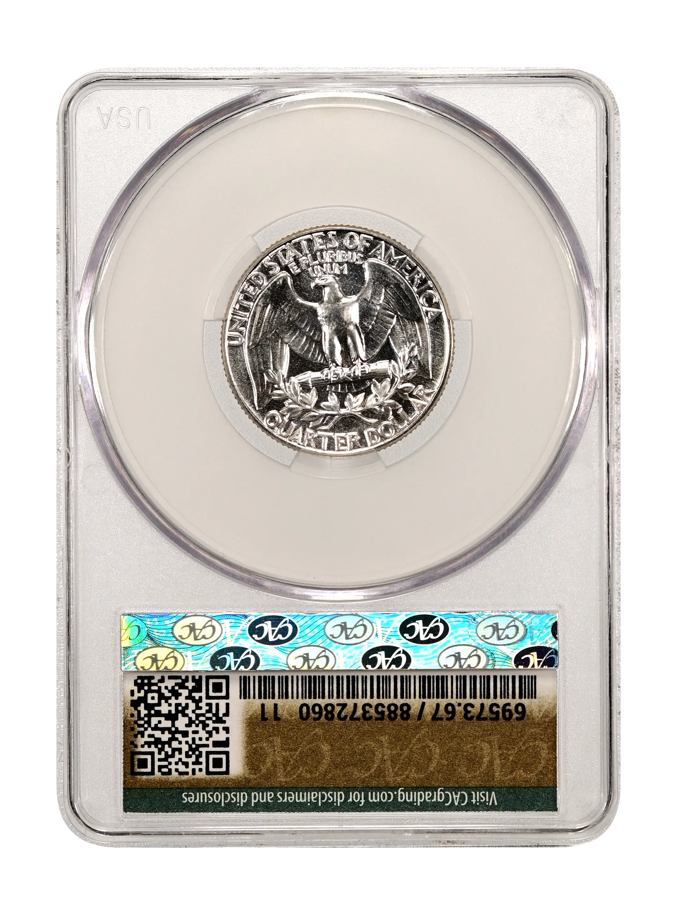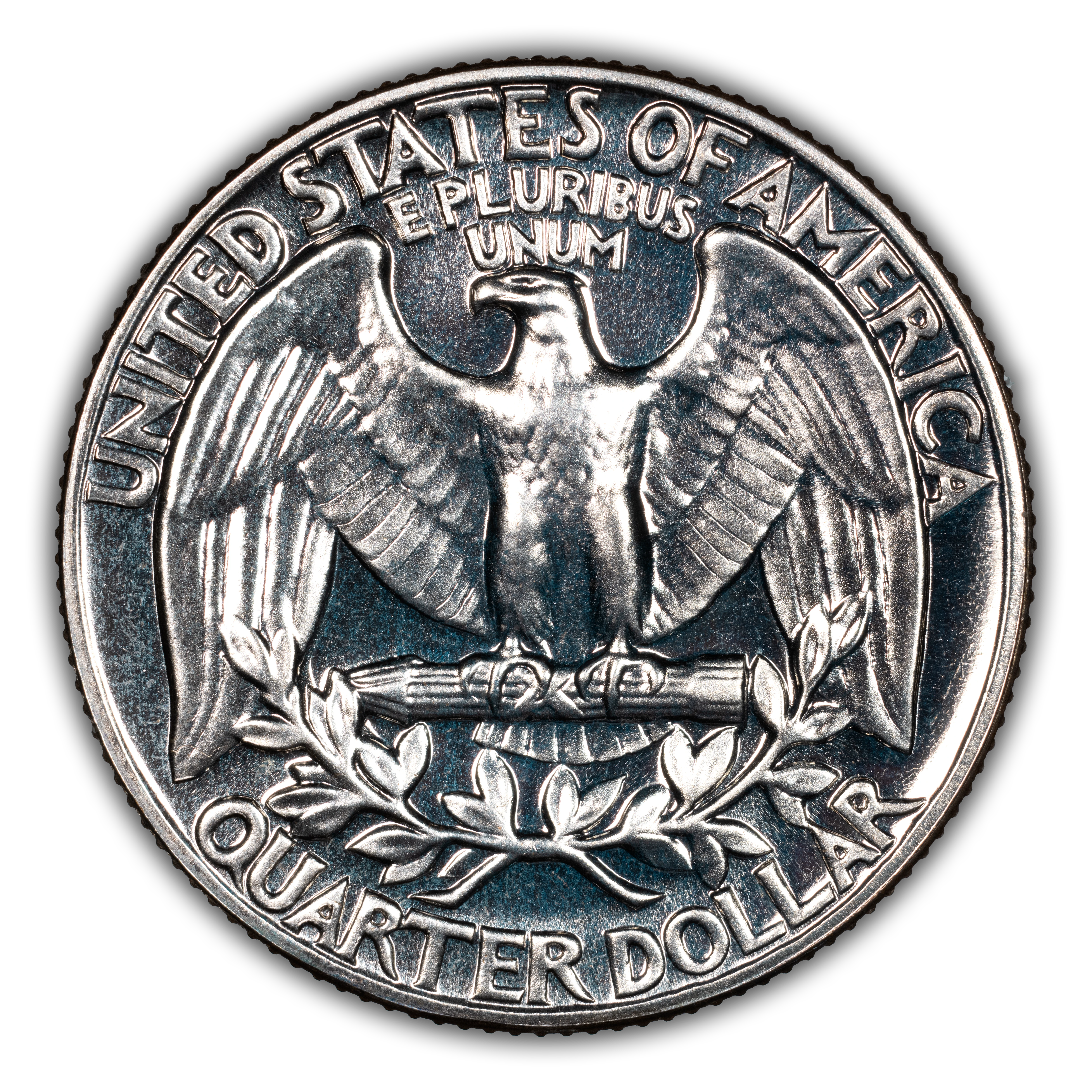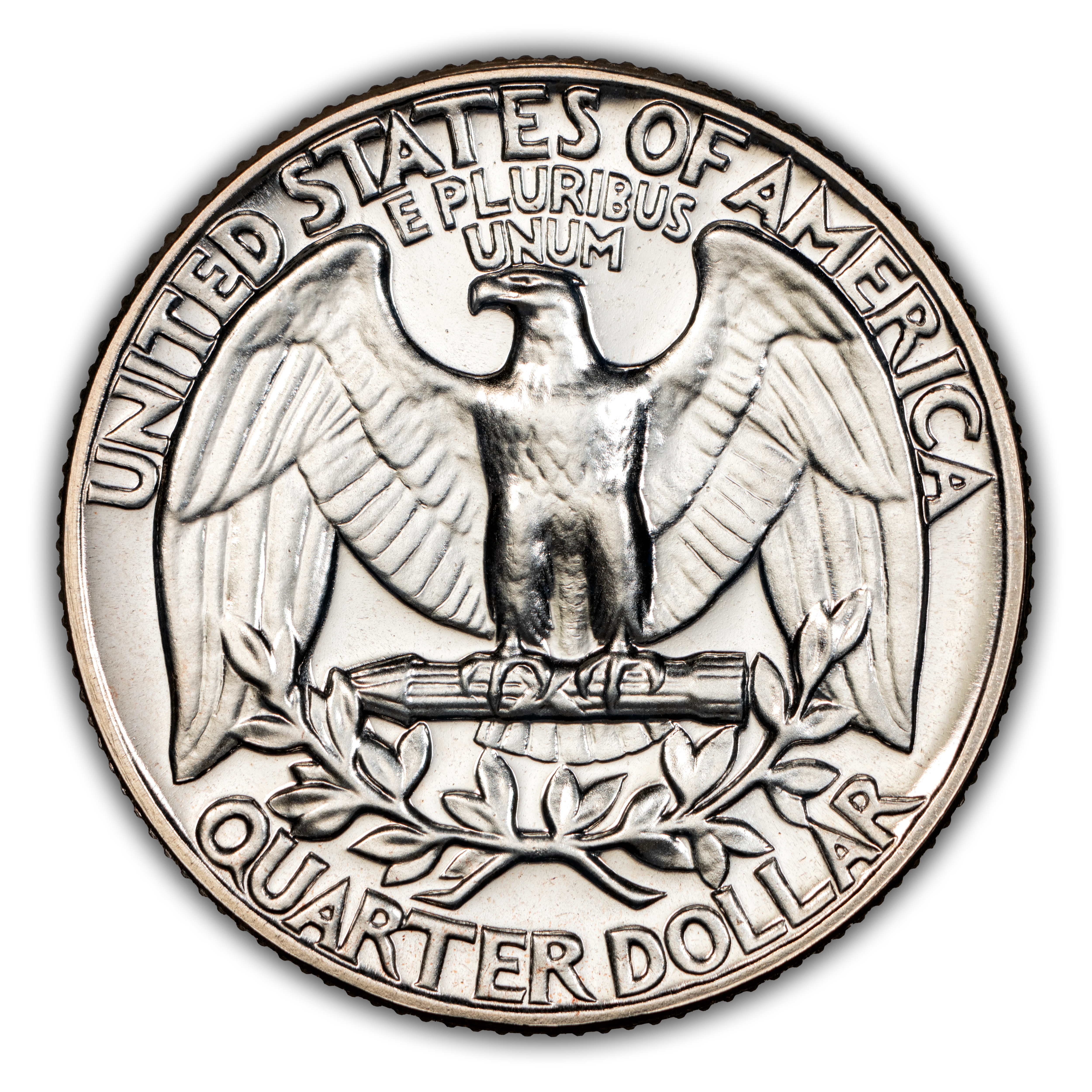 Reverse: Large eagle with wings fully extended, clutching a bundle of arrows with the words UNITED STATES OF AMERICA at the top periphery; QUARTER DOLLAR at the bottom. An olive leaf is positioned between the eagle and the denomination.