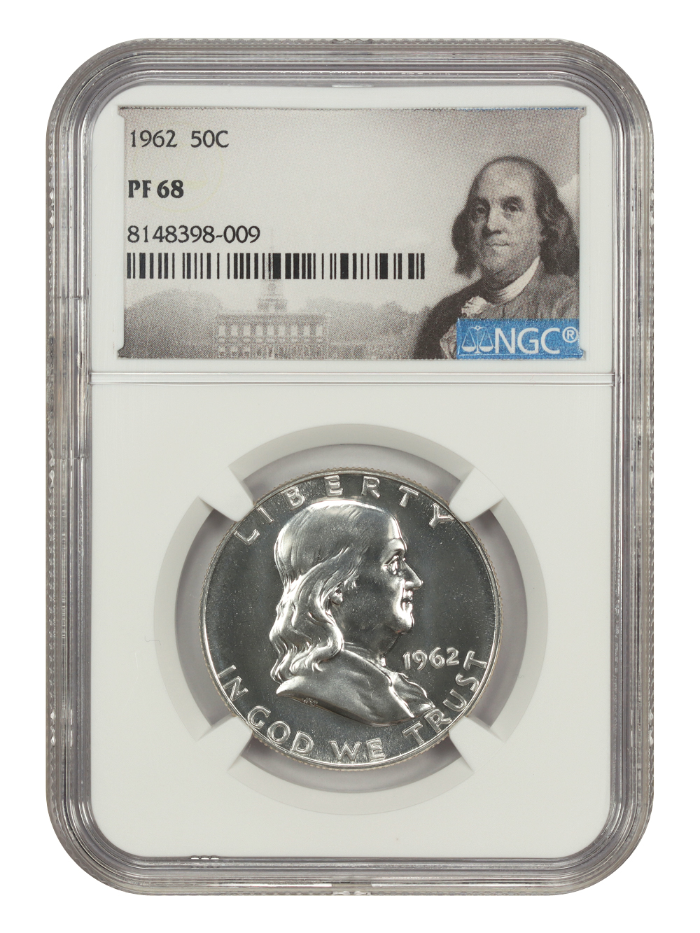 Reverse: The Liberty bell is prominently featured with the words UNITED STATES OF AMERICA and HALF DOLLAR around the periphery. The motto, E PLURIBUS UNUM is left of the bell, with a eagle -- wings fully spread -- to the right.