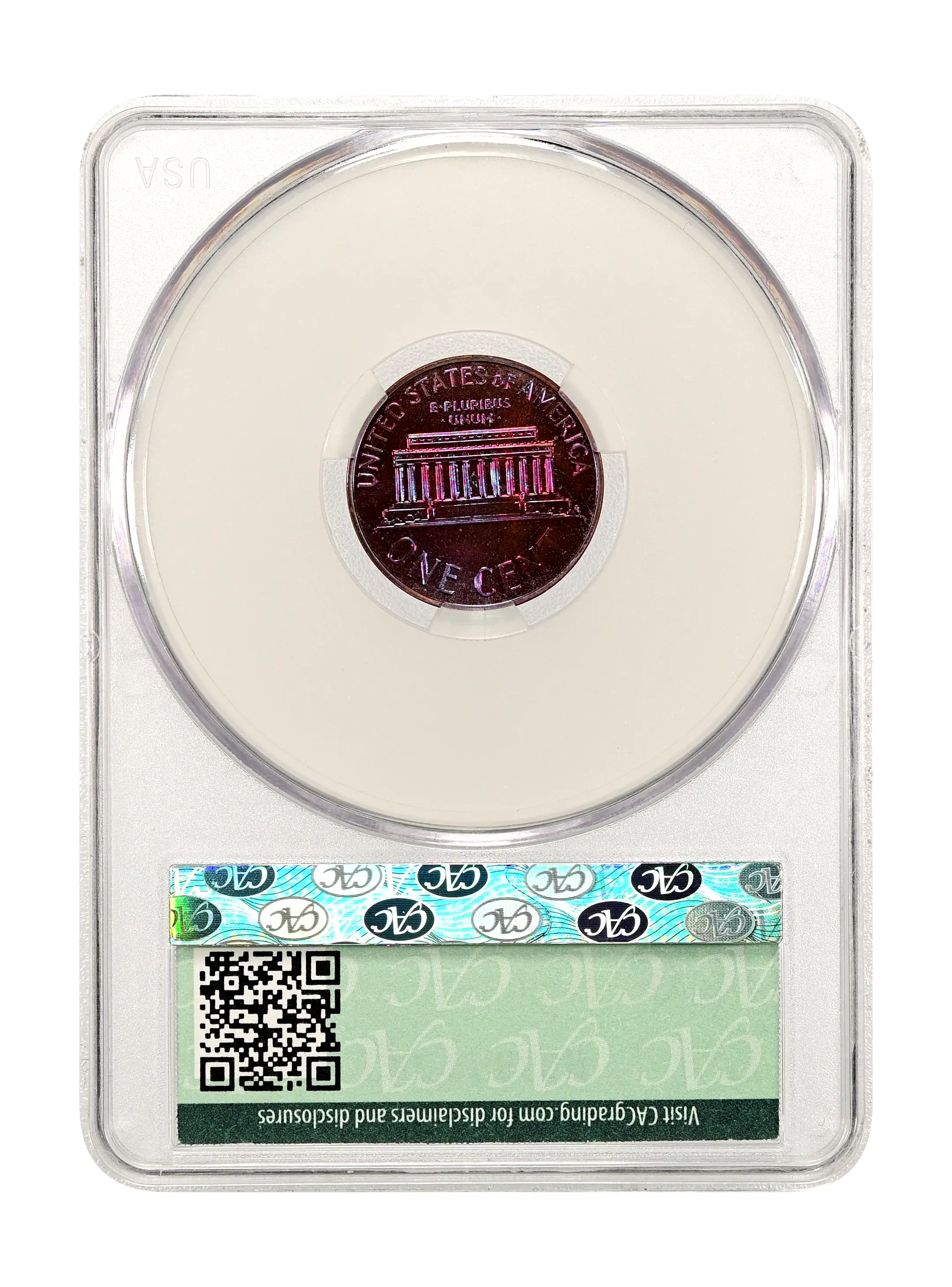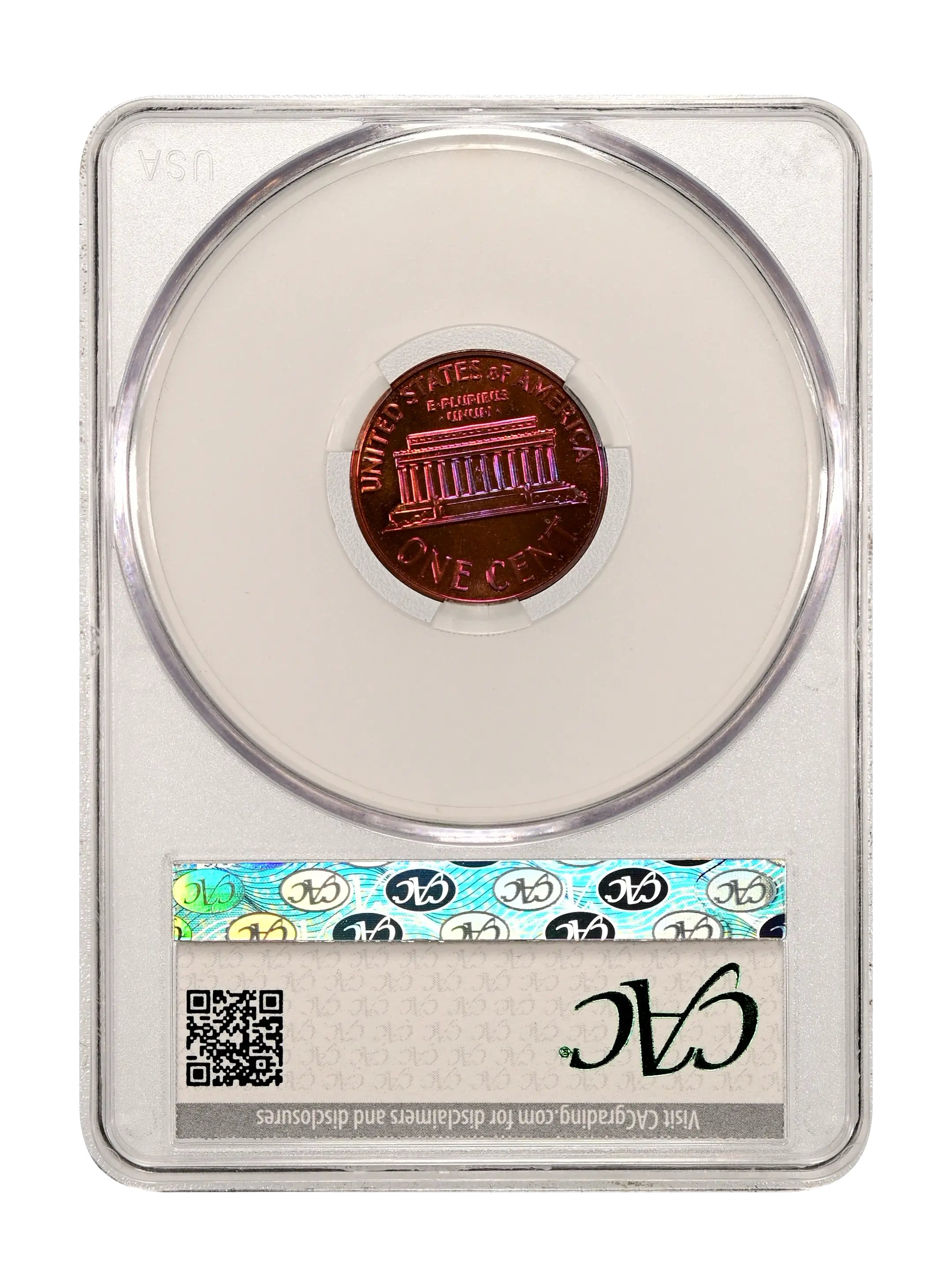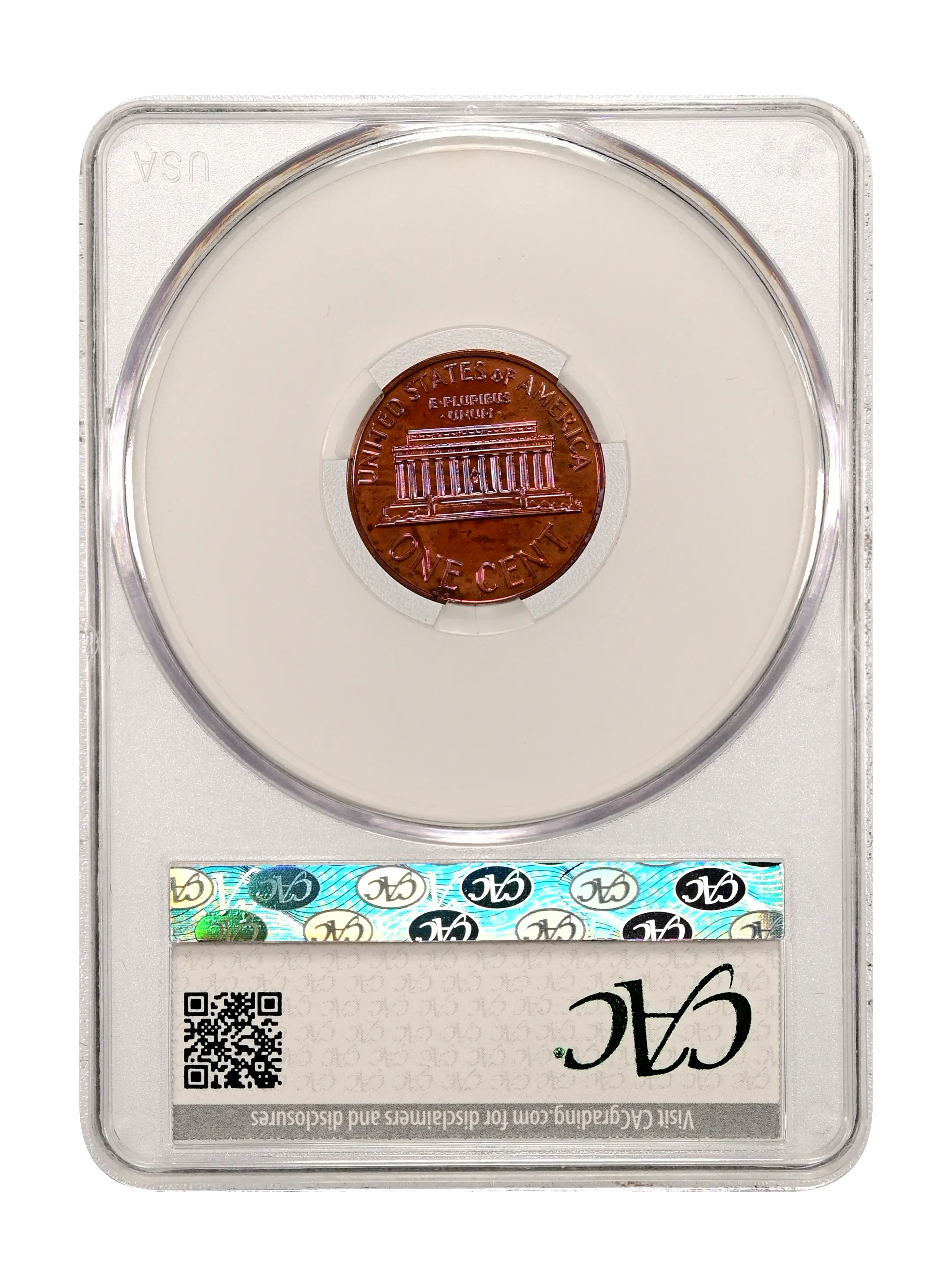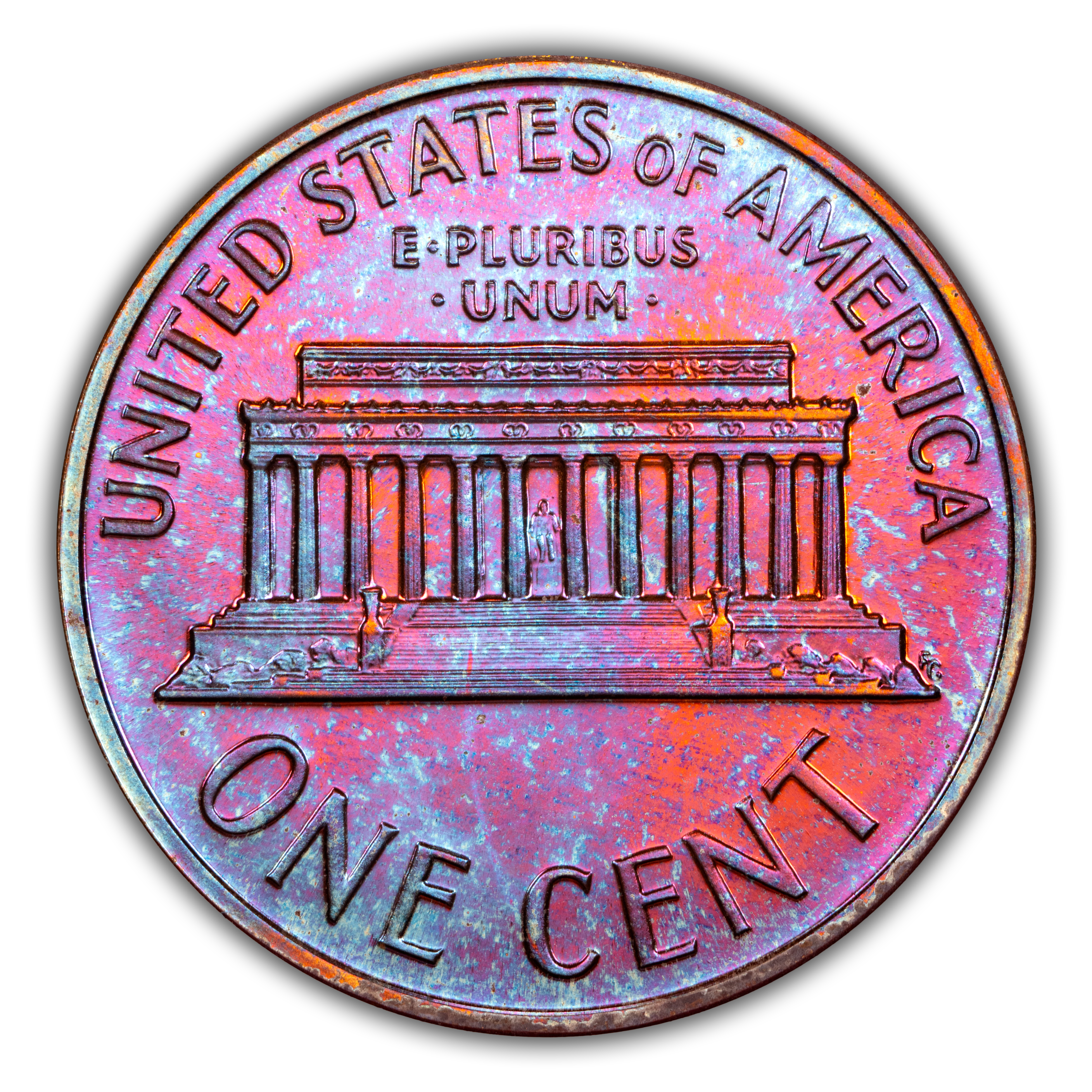 Reverse: Lincoln memorial building centered with words ONE CENT, UNITED STATES OF AMERICA on top and bottom periphery. E PLURIBUS UNUM centered above the top of the memorial.