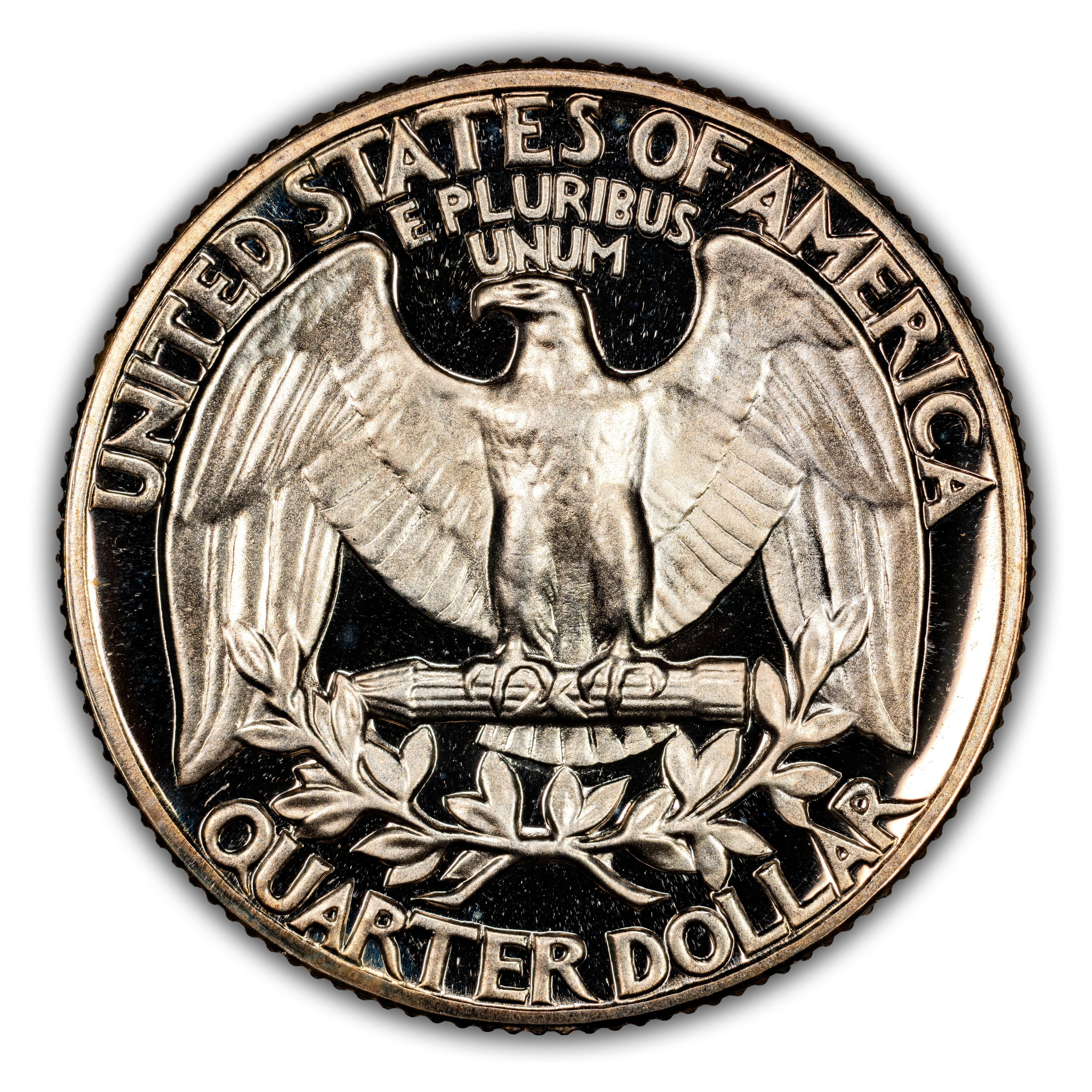 Reverse: Large eagle with wings fully extended, clutching a bundle of arrows with the words UNITED STATES OF AMERICA at the top periphery; QUARTER DOLLAR at the bottom. An olive leaf is positioned between the eagle and the denomination.