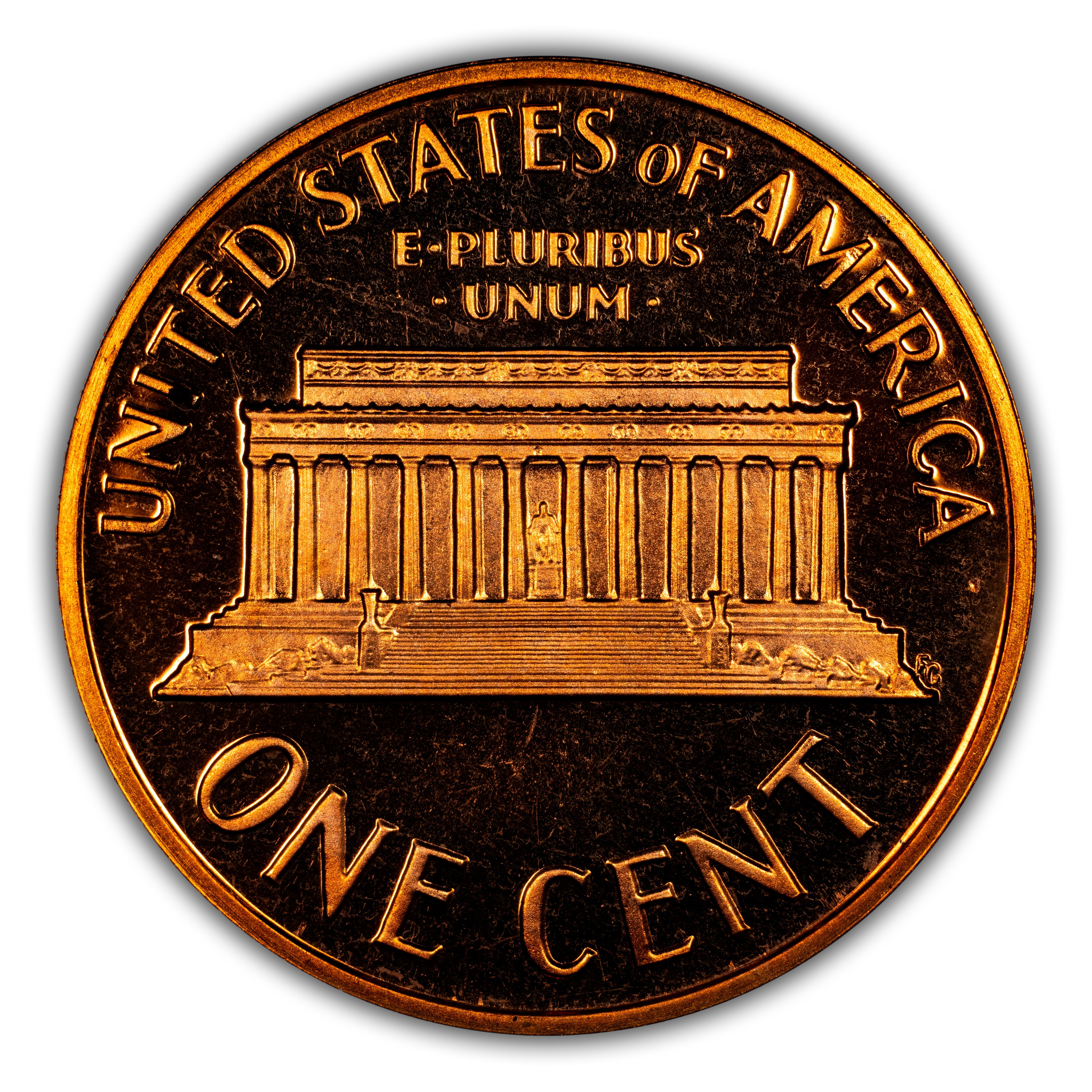 Reverse: Lincoln memorial building centered with words ONE CENT, UNITED STATES OF AMERICA on top and bottom periphery. E PLURIBUS UNUM centered above the top of the memorial.