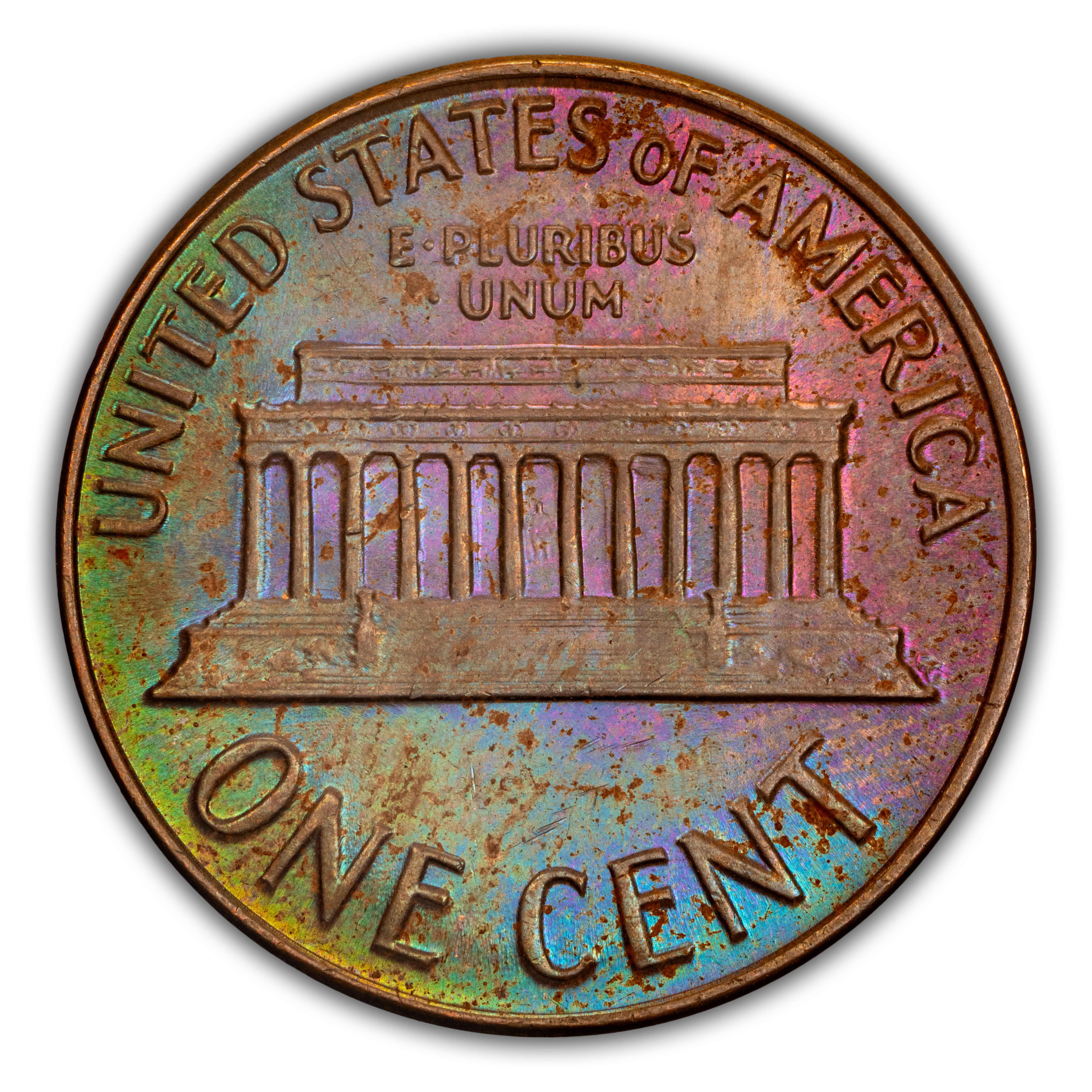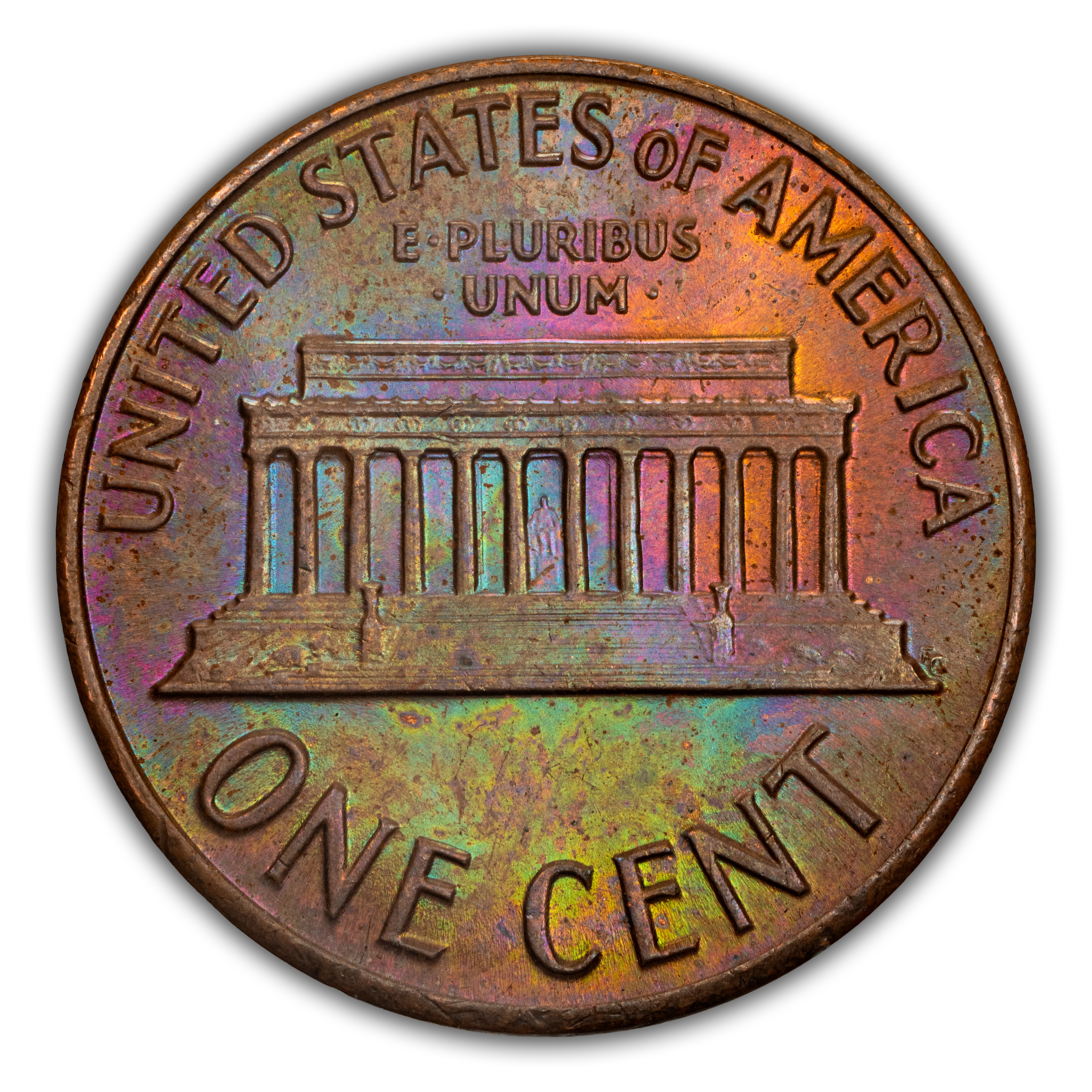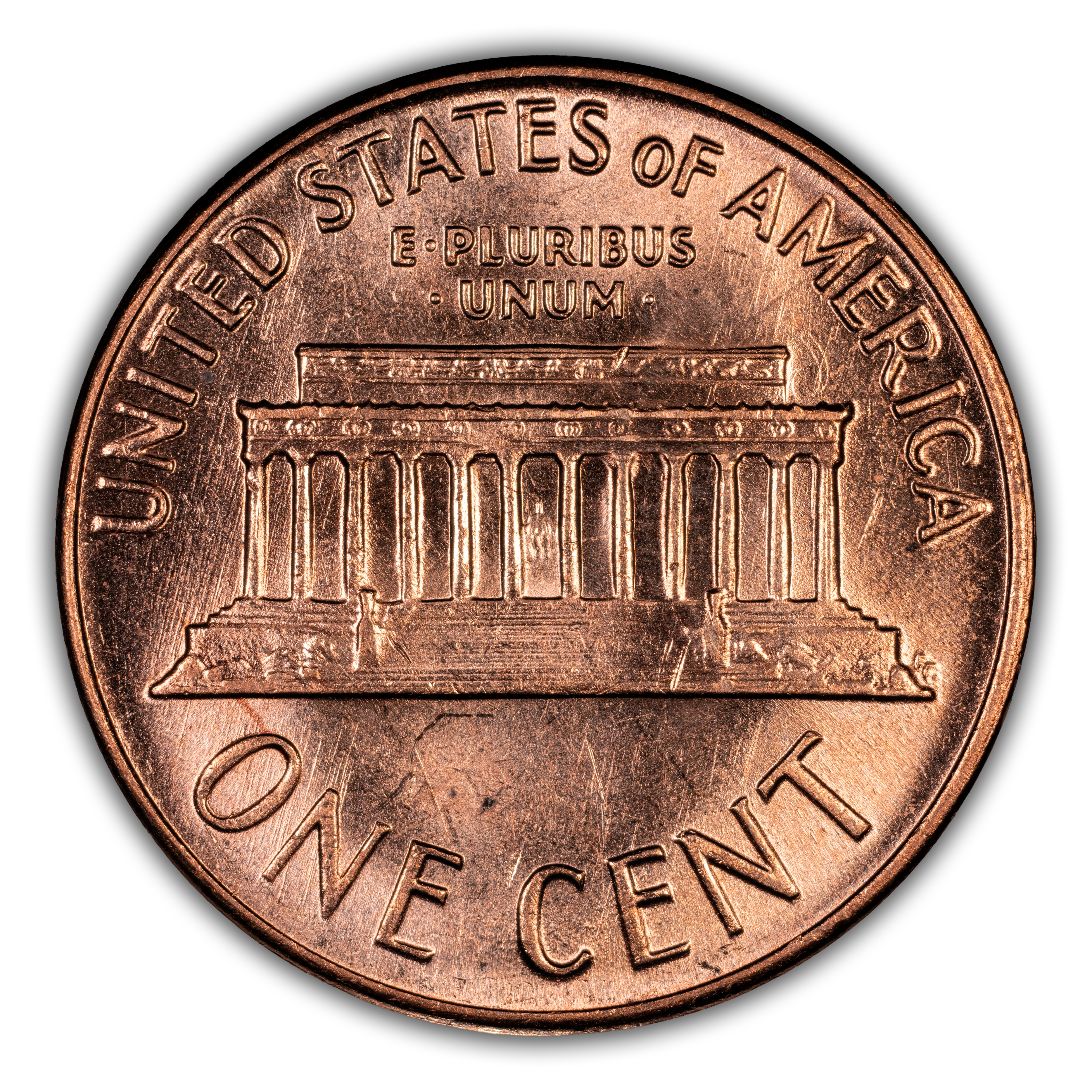 Reverse: Lincoln memorial building centered with words ONE CENT, UNITED STATES OF AMERICA on top and bottom periphery. E PLURIBUS UNUM centered above the top of the memorial.