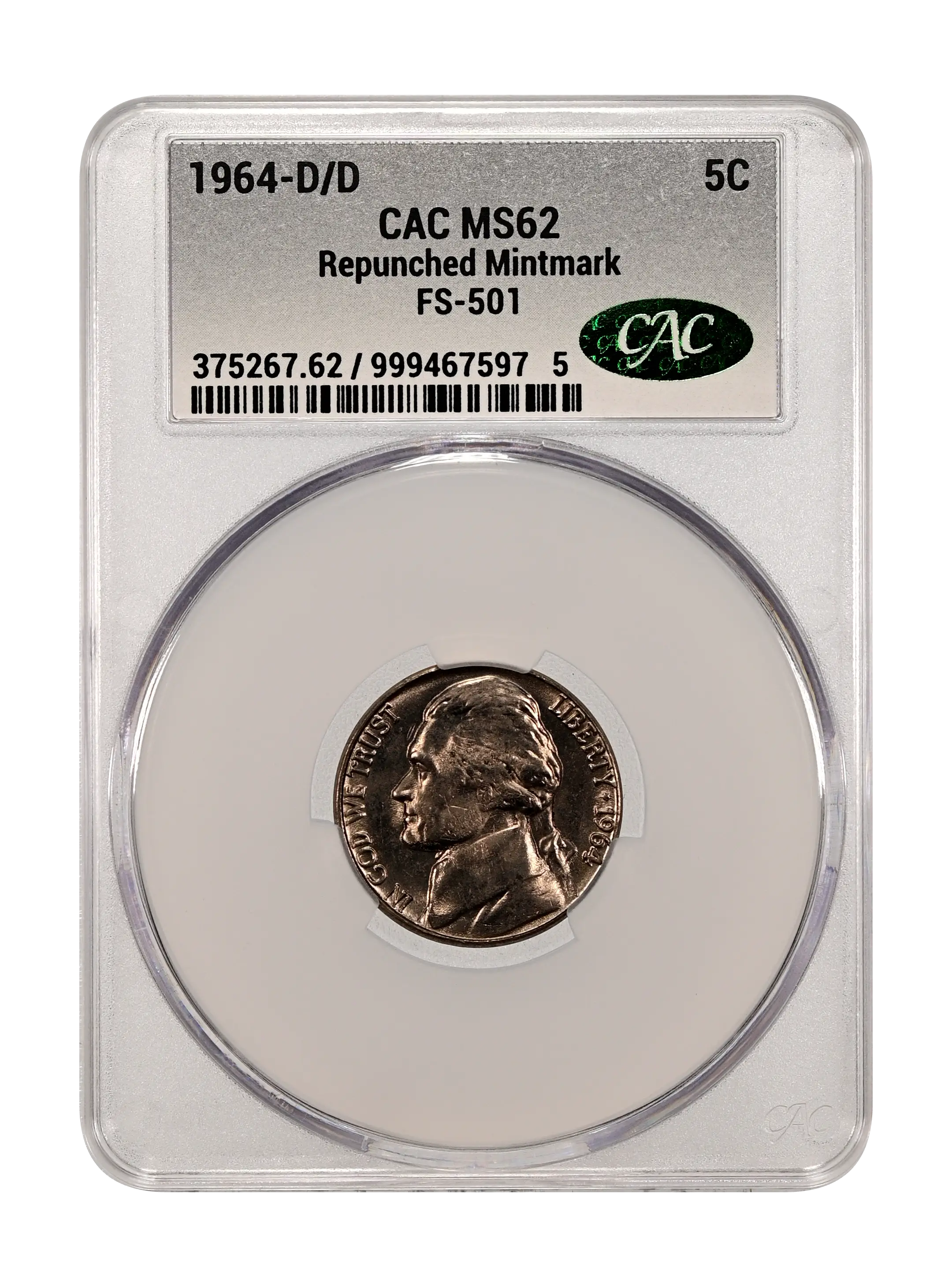 1964-D/D Repunched Mintmark 5c FS-501 CAC MS62