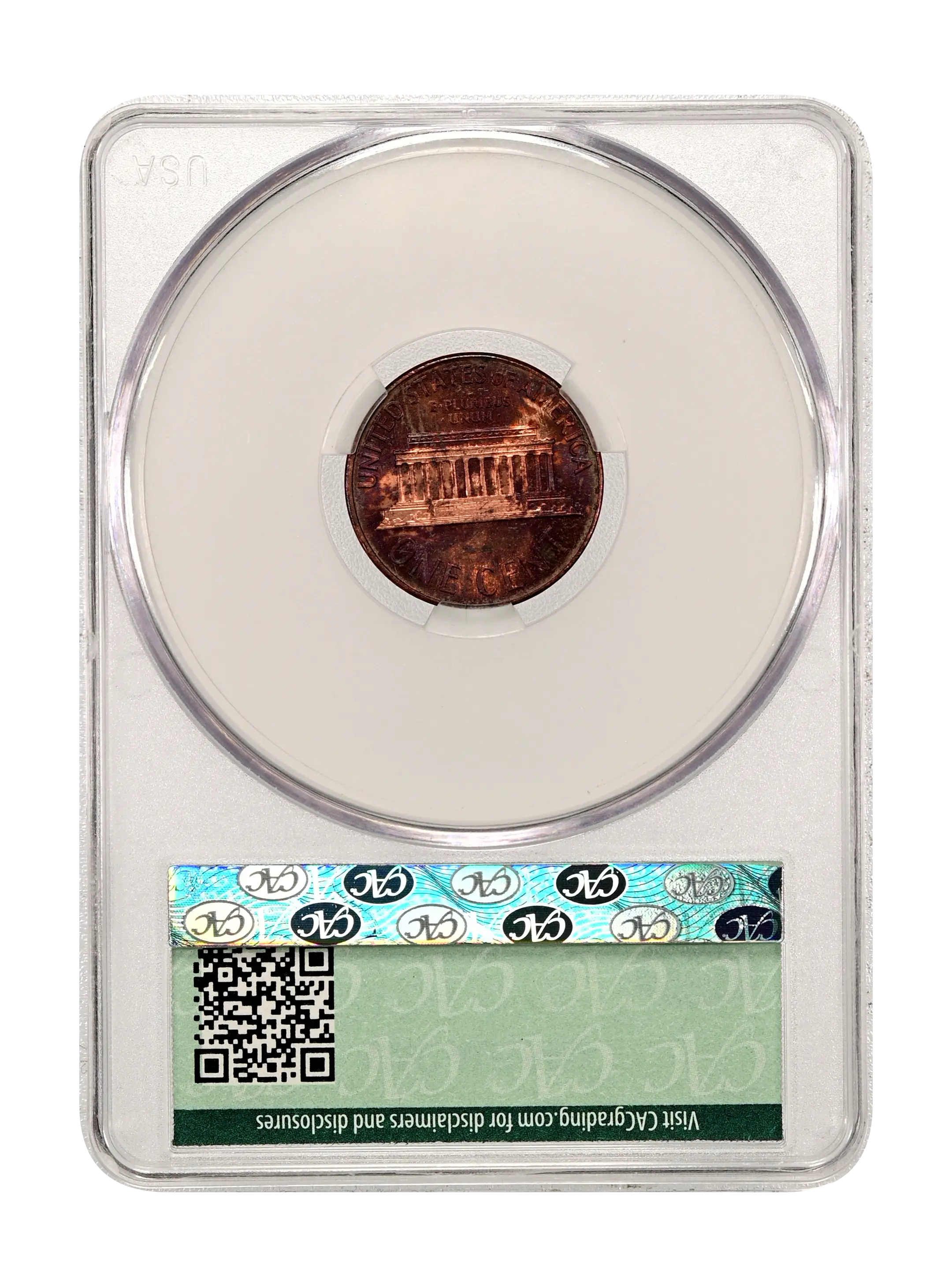 Reverse: Lincoln memorial building centered with words ONE CENT, UNITED STATES OF AMERICA on top and bottom periphery. E PLURIBUS UNUM centered above the top of the memorial.