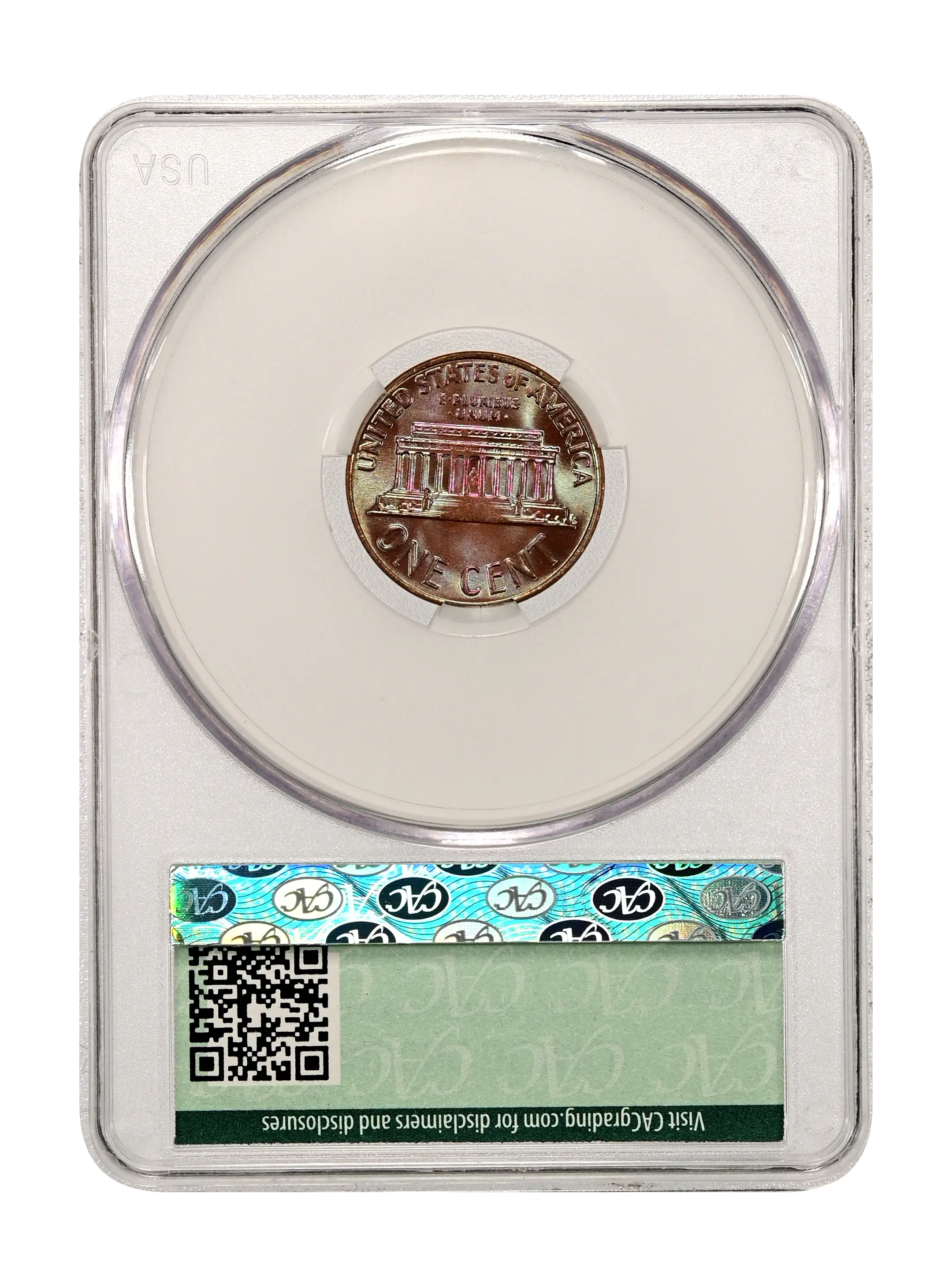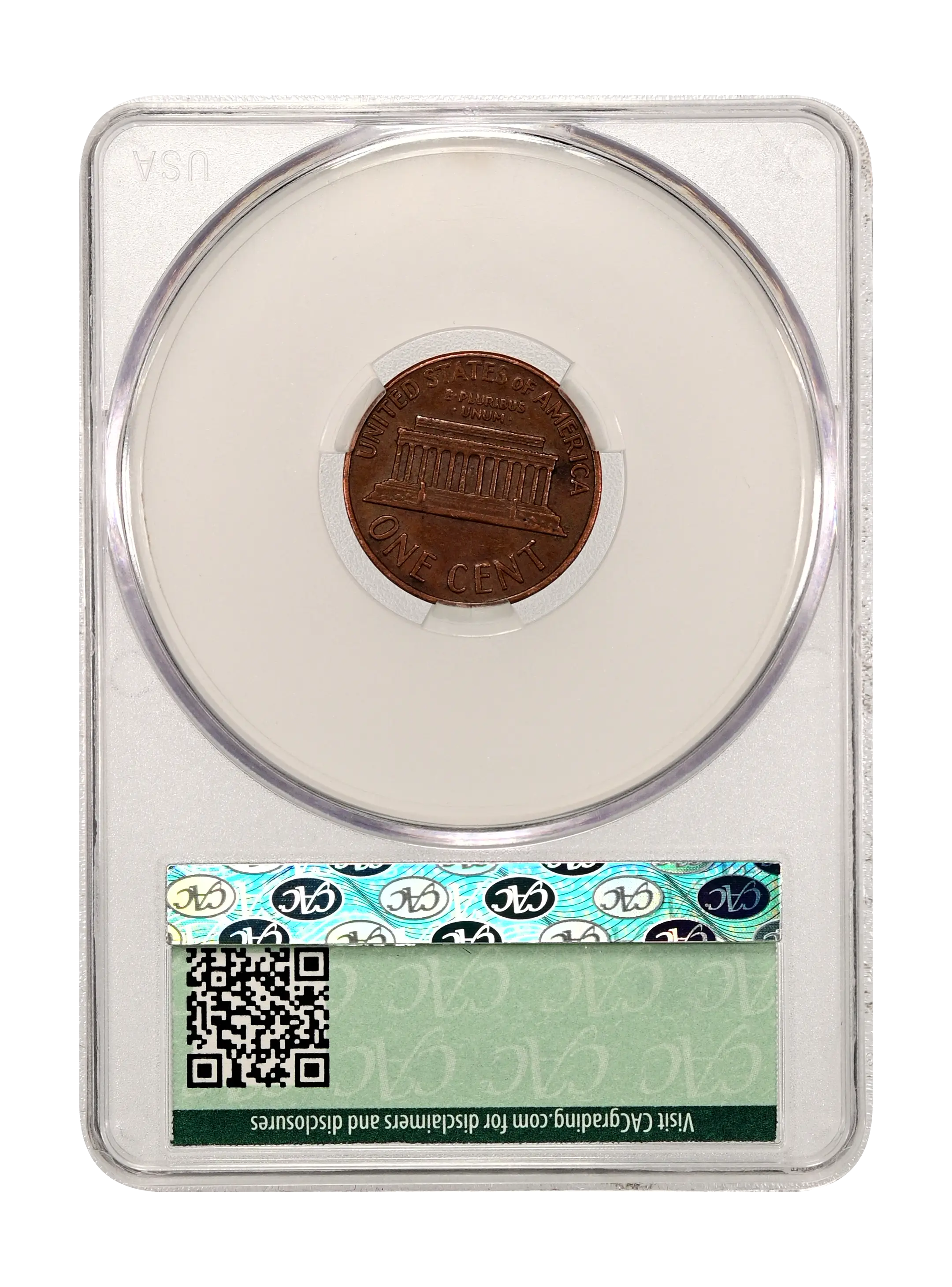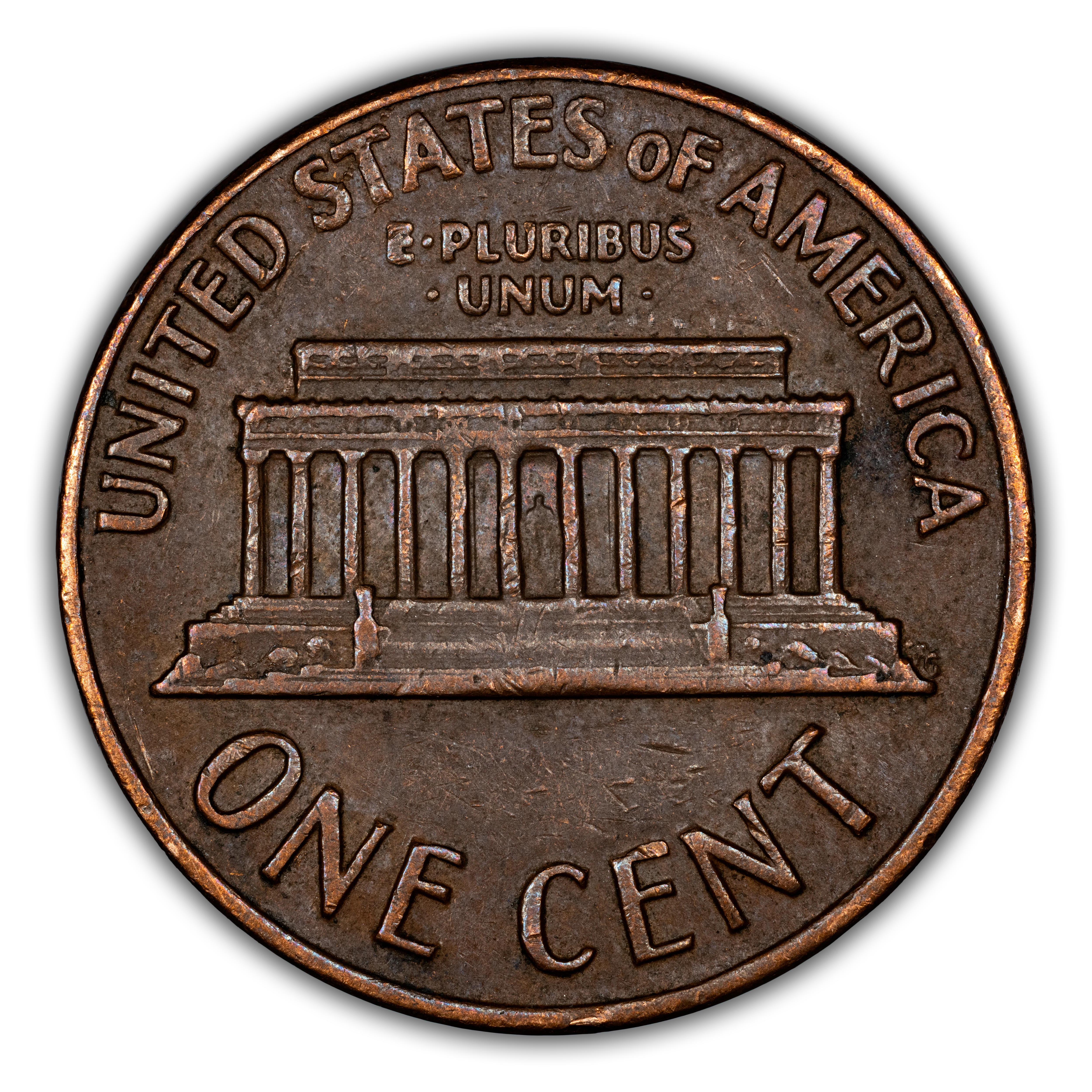Reverse: Lincoln memorial building centered with words ONE CENT, UNITED STATES OF AMERICA on top and bottom periphery. E PLURIBUS UNUM centered above the top of the memorial.