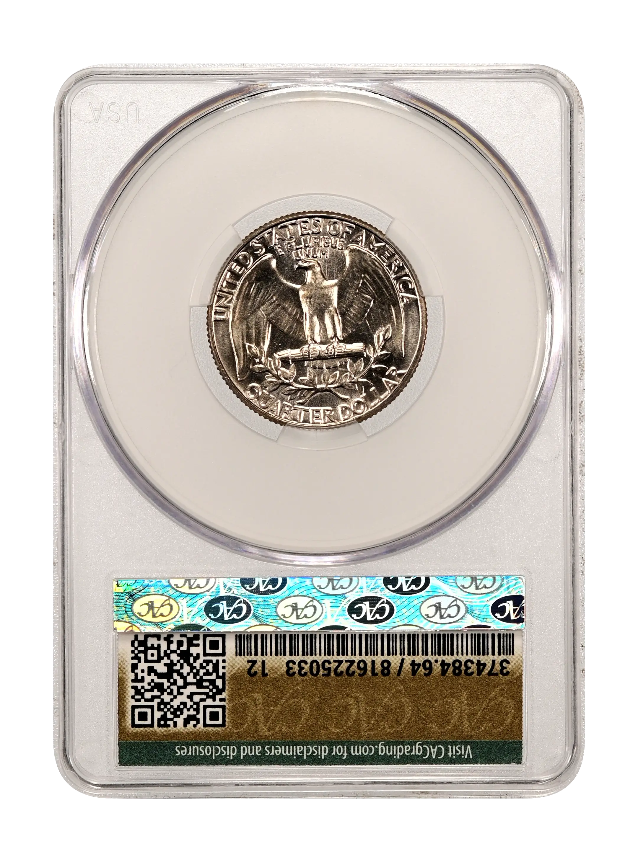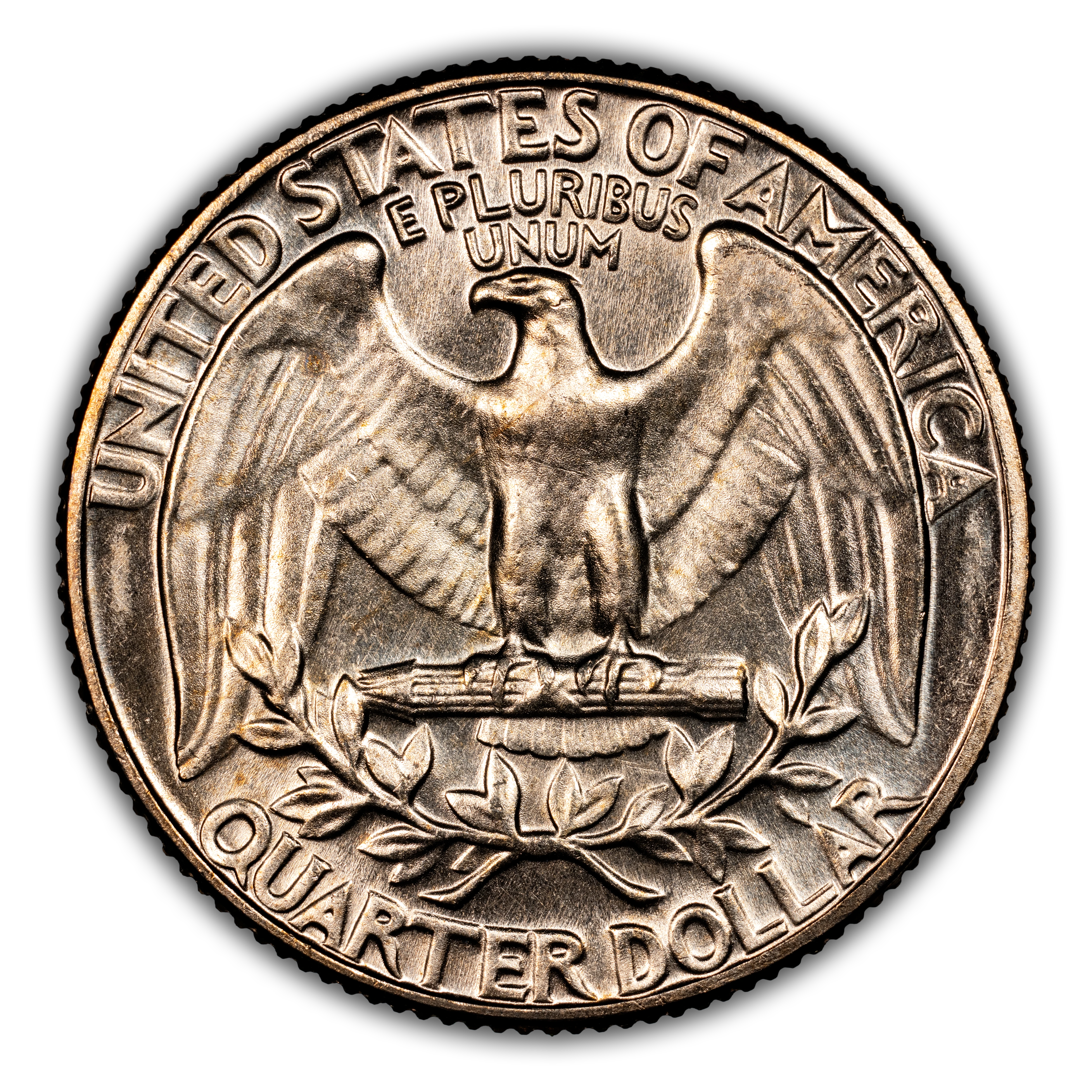 Reverse: Large eagle with wings fully extended, clutching a bundle of arrows with the words UNITED STATES OF AMERICA at the top periphery; QUARTER DOLLAR at the bottom. An olive leaf is positioned between the eagle and the denomination.