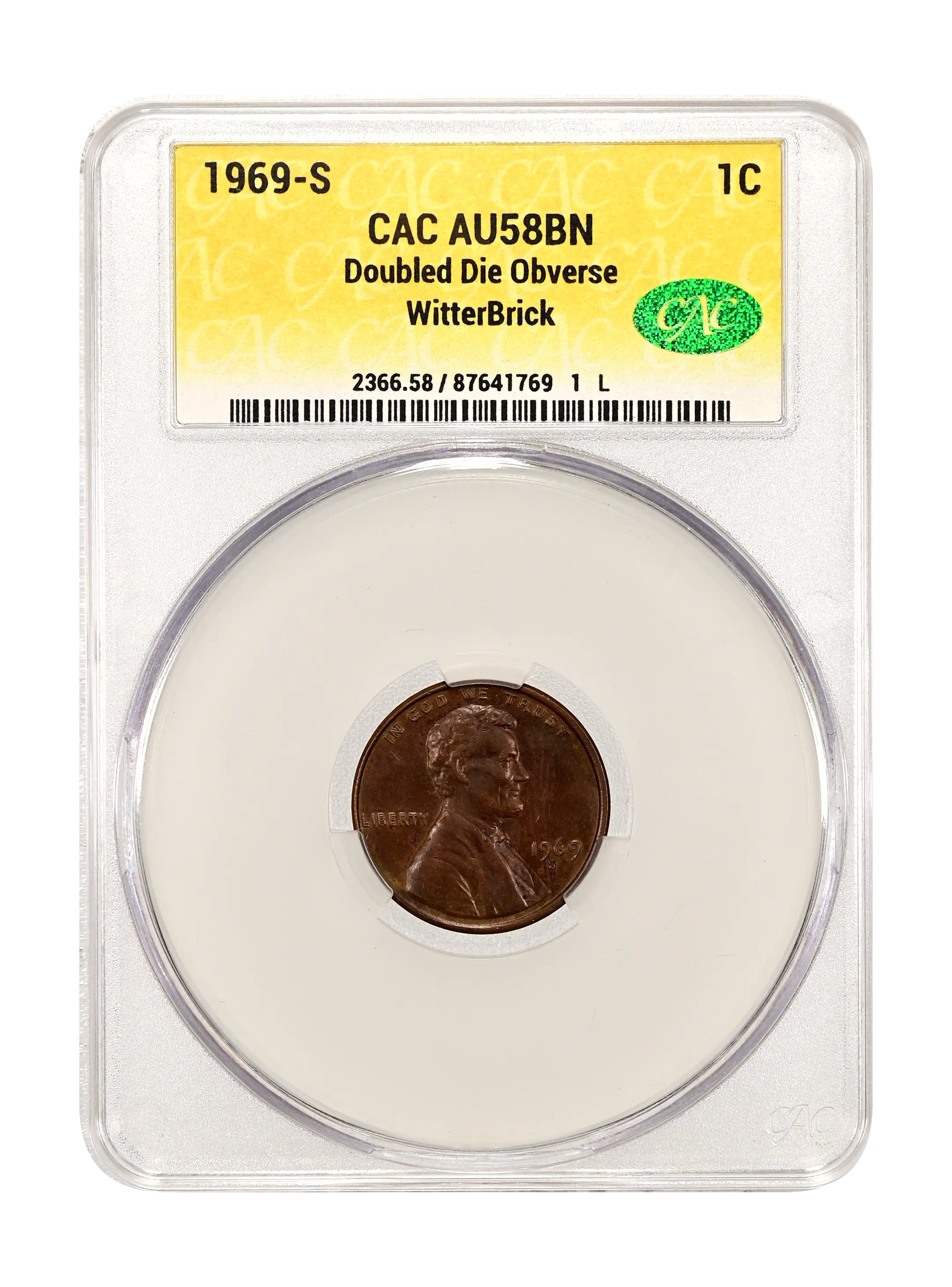 1969-S Doubled Die Obverse 1c BN CAC AU58BN