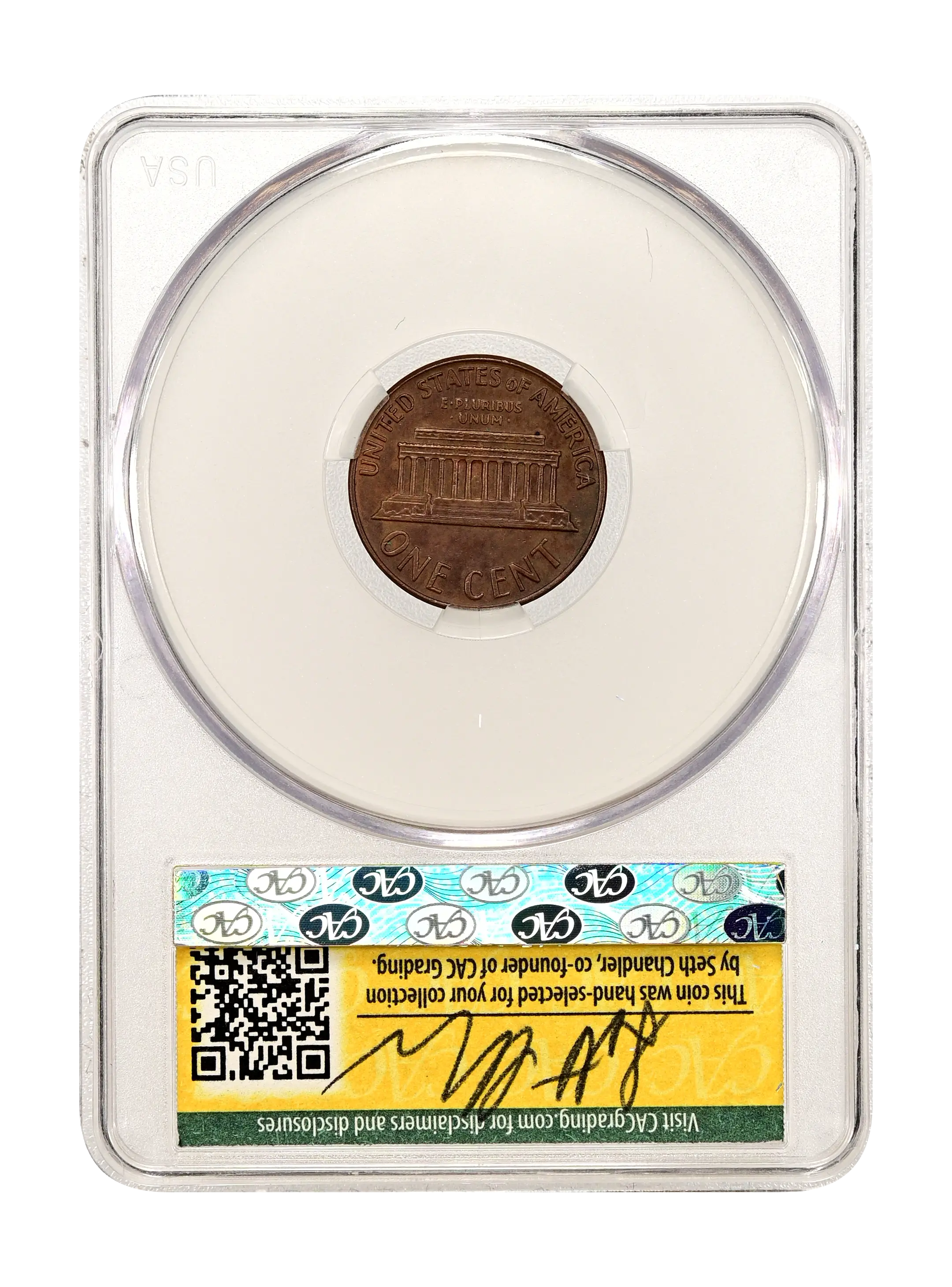 Reverse: Lincoln memorial building centered with words ONE CENT, UNITED STATES OF AMERICA on top and bottom periphery. E PLURIBUS UNUM centered above the top of the memorial.