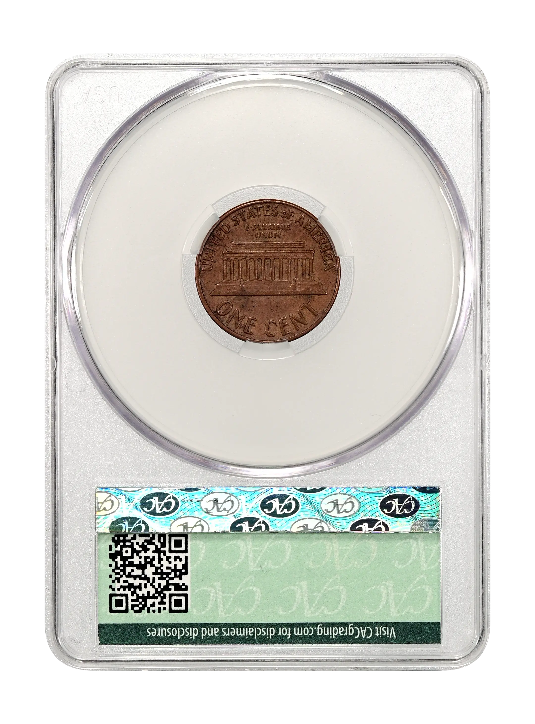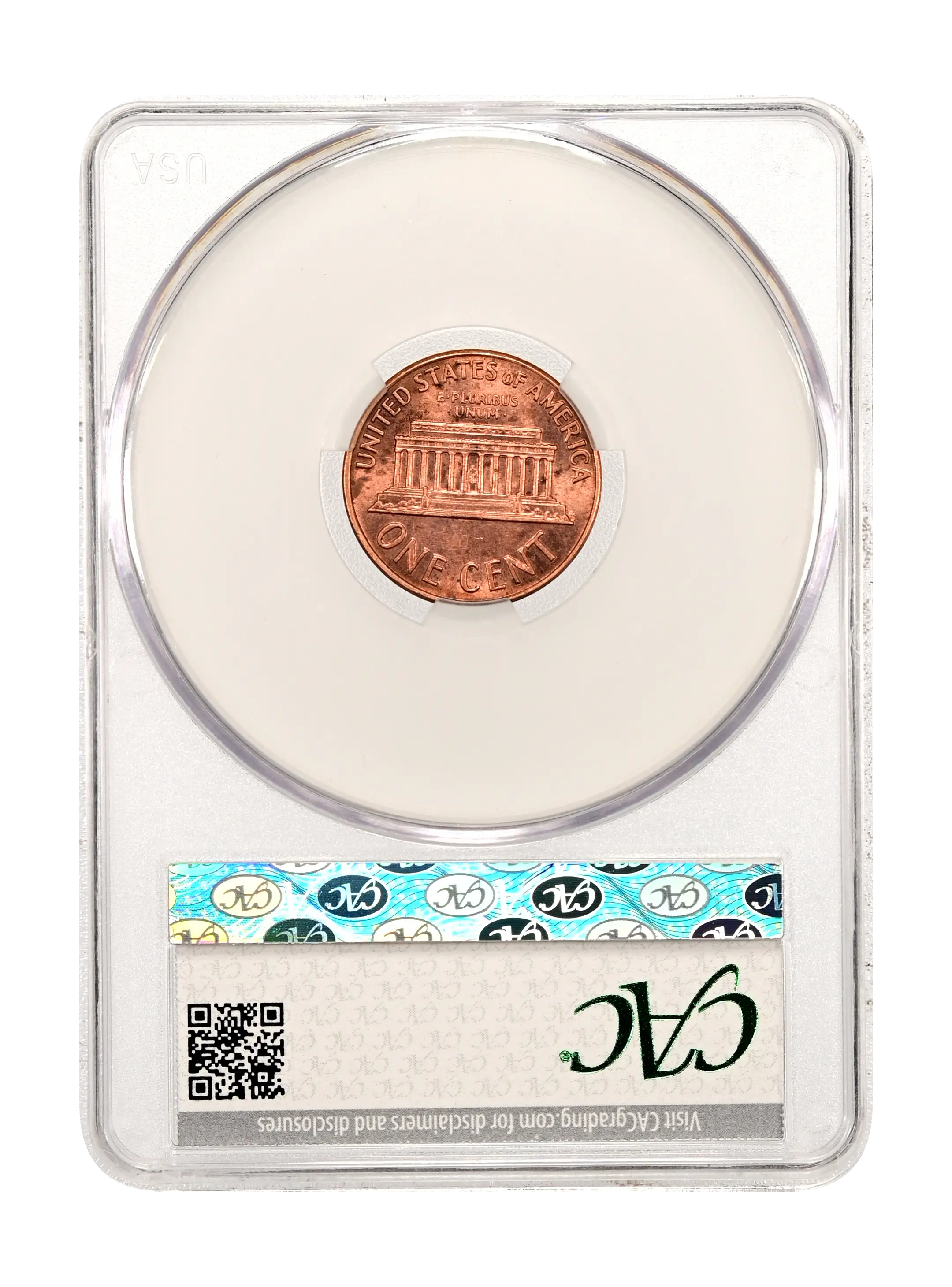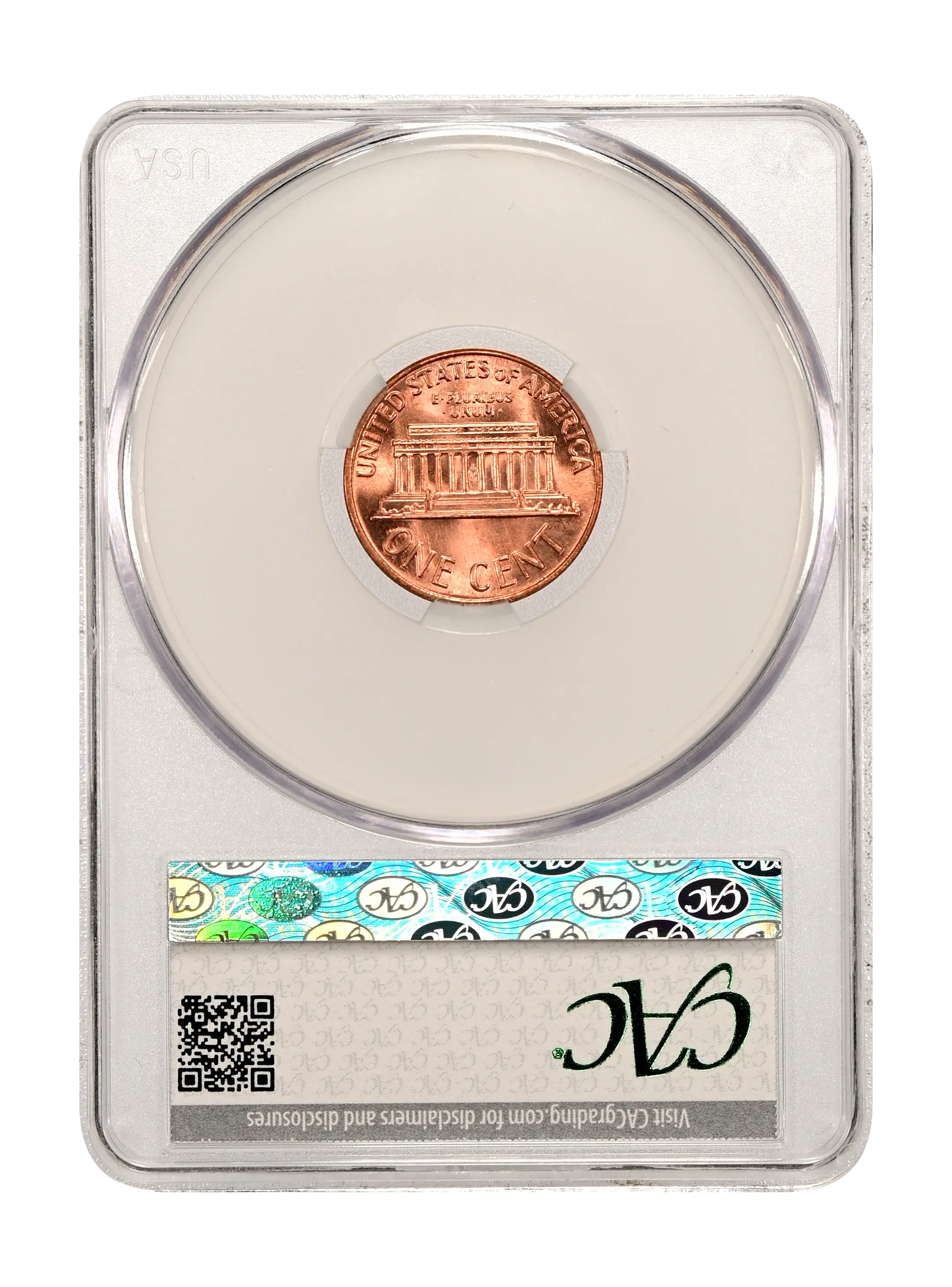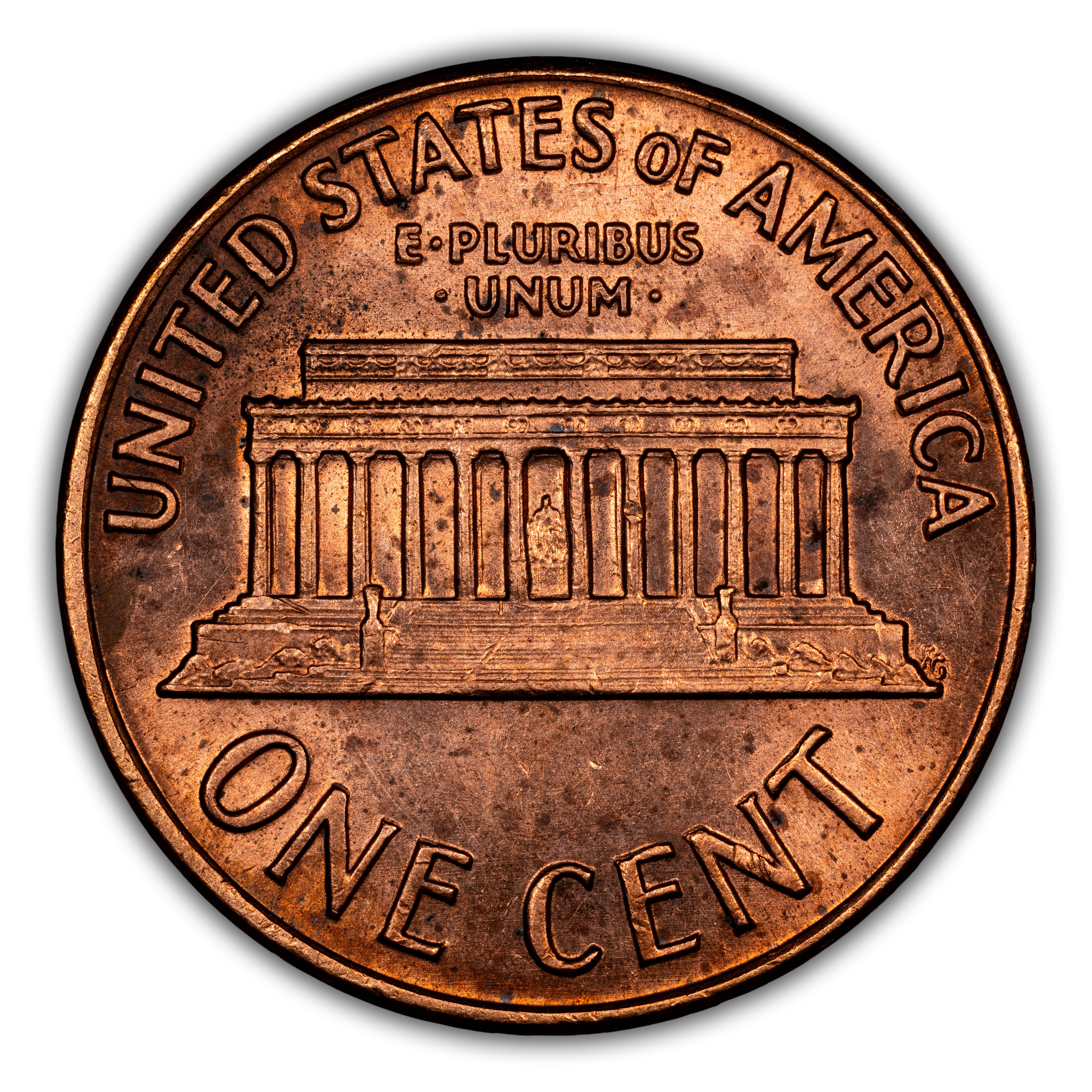Reverse: Lincoln memorial building centered with words ONE CENT, UNITED STATES OF AMERICA on top and bottom periphery. E PLURIBUS UNUM centered above the top of the memorial.
