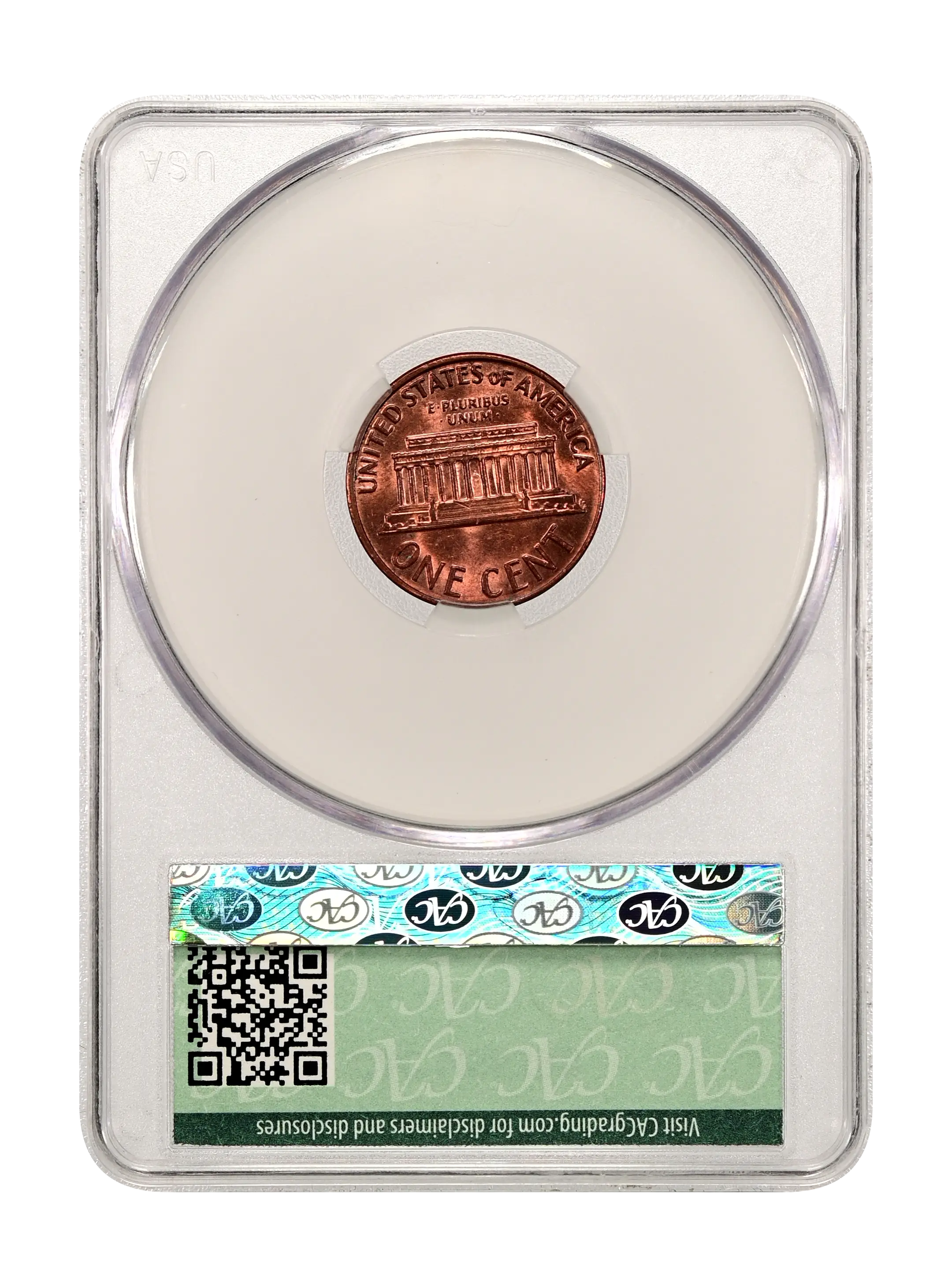 Reverse: Lincoln memorial building centered with words ONE CENT, UNITED STATES OF AMERICA on top and bottom periphery. E PLURIBUS UNUM centered above the top of the memorial.