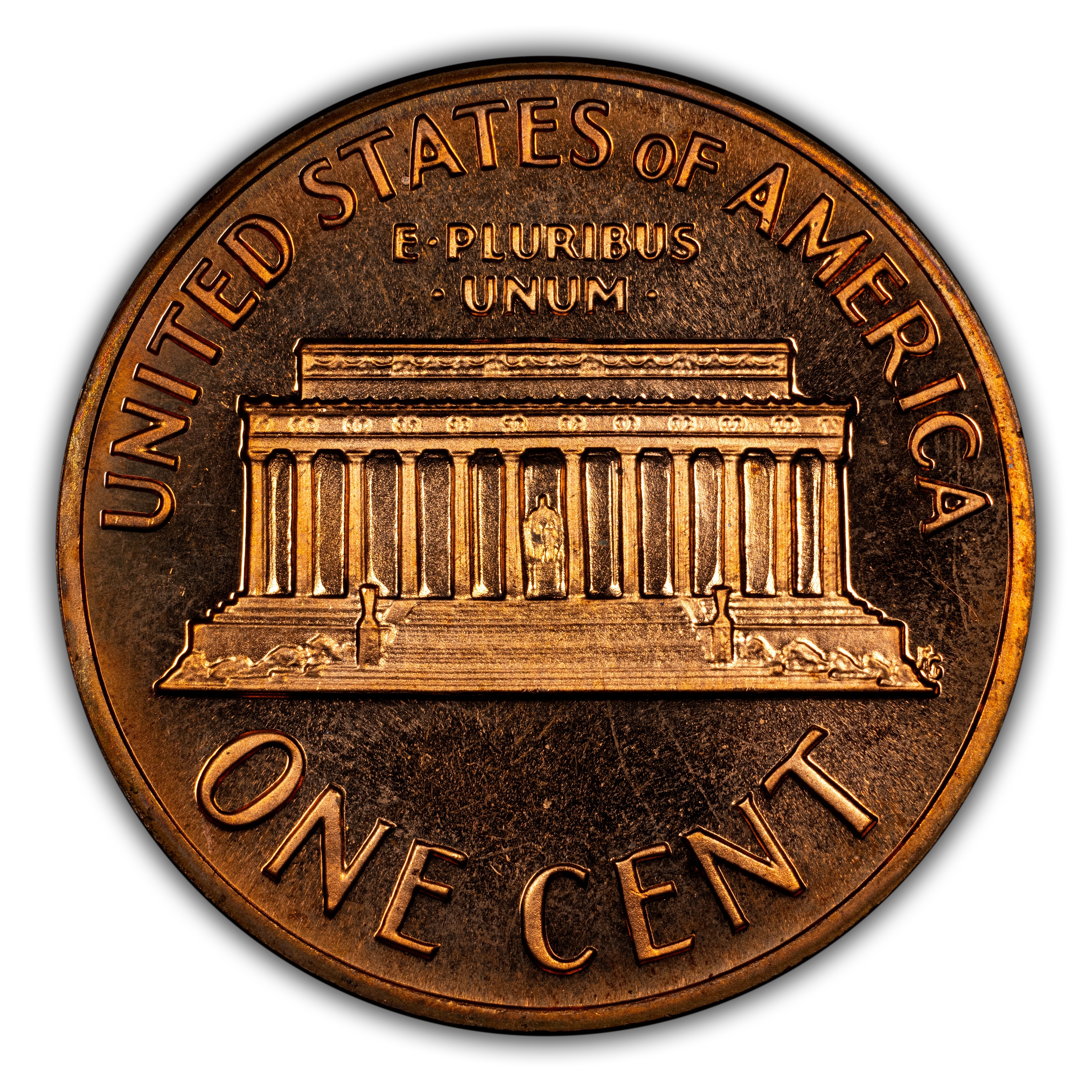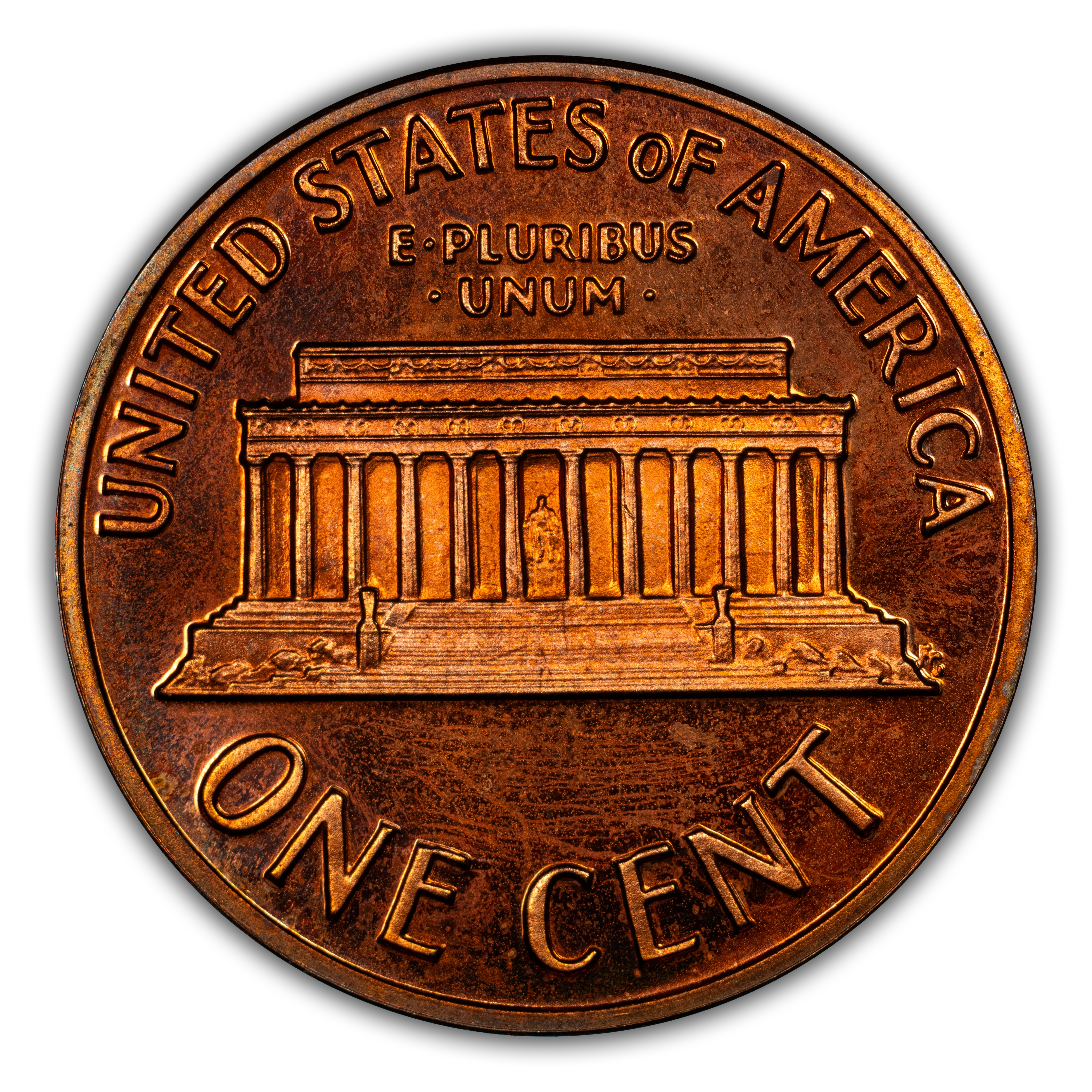 Reverse: Lincoln memorial building centered with words ONE CENT, UNITED STATES OF AMERICA on top and bottom periphery. E PLURIBUS UNUM centered above the top of the memorial.