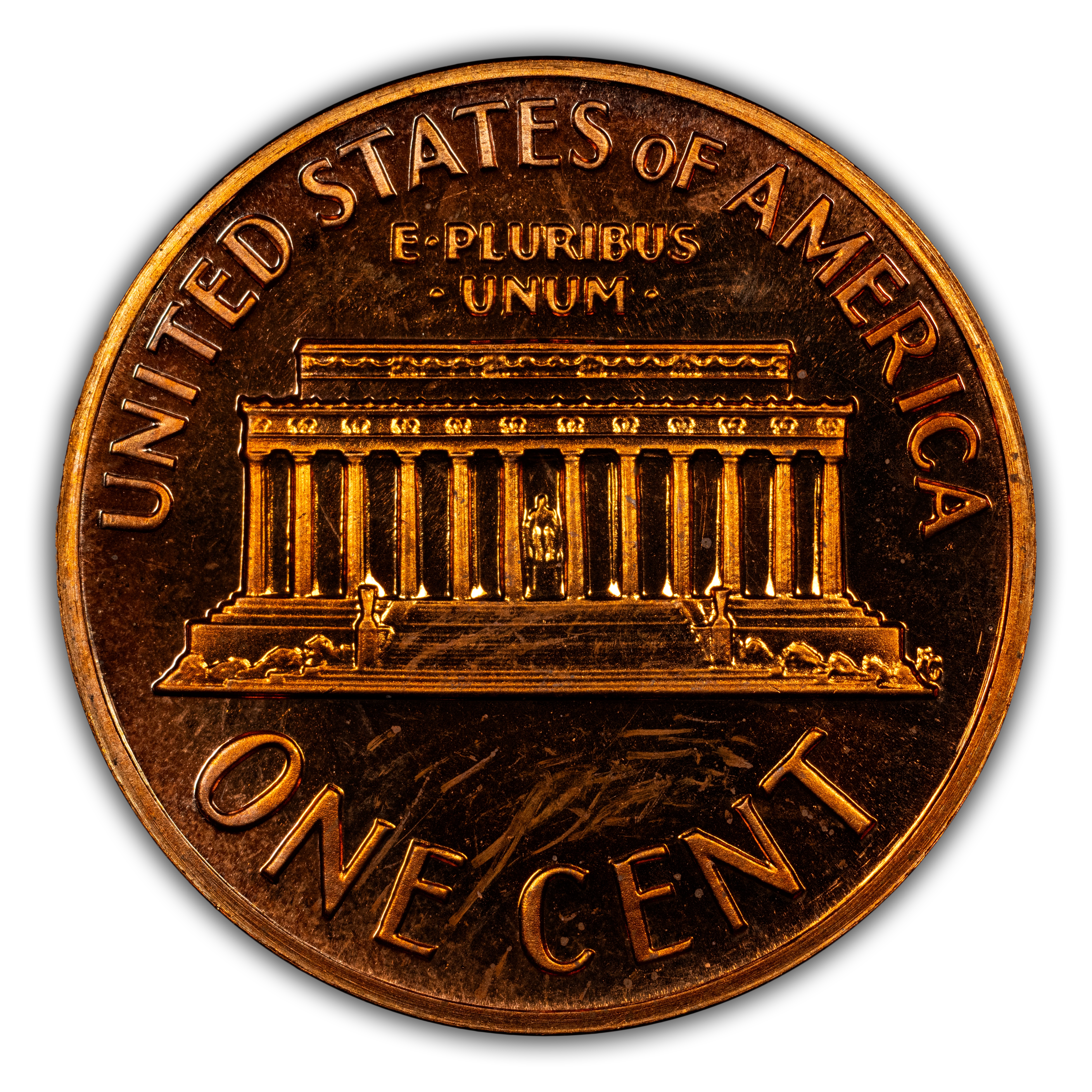 Reverse: Lincoln memorial building centered with words ONE CENT, UNITED STATES OF AMERICA on top and bottom periphery. E PLURIBUS UNUM centered above the top of the memorial.