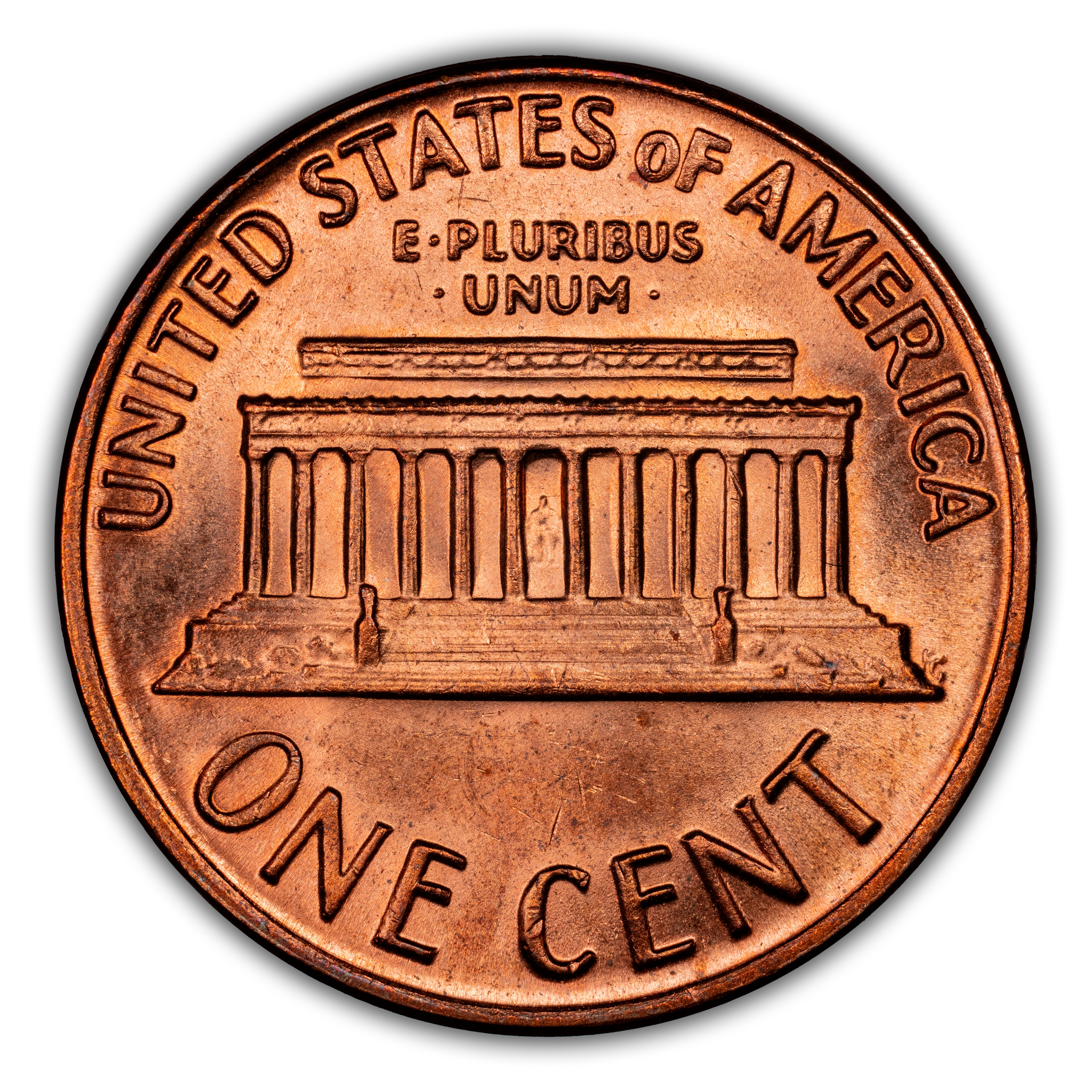 Reverse: Lincoln memorial building centered with words ONE CENT, UNITED STATES OF AMERICA on top and bottom periphery. E PLURIBUS UNUM centered above the top of the memorial.