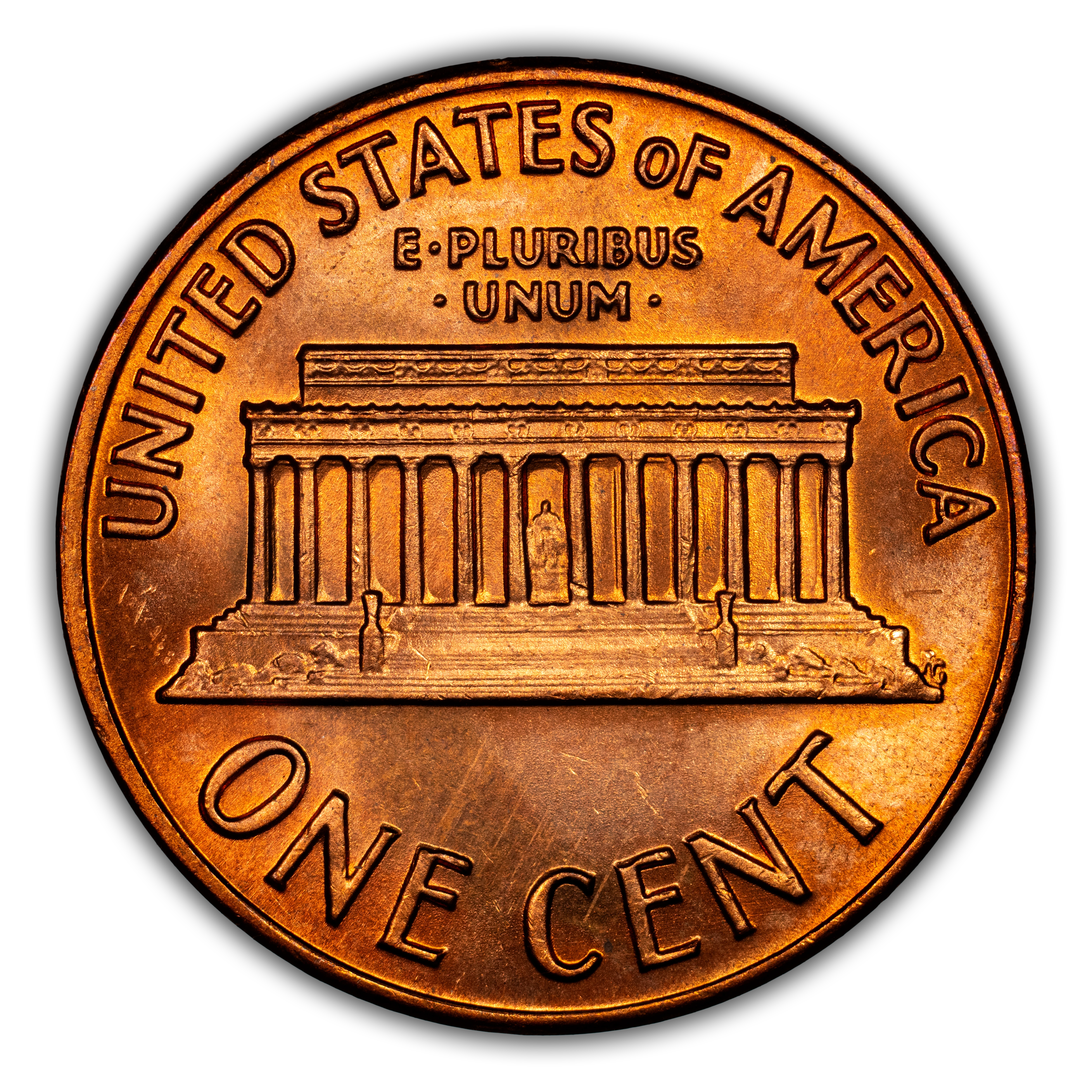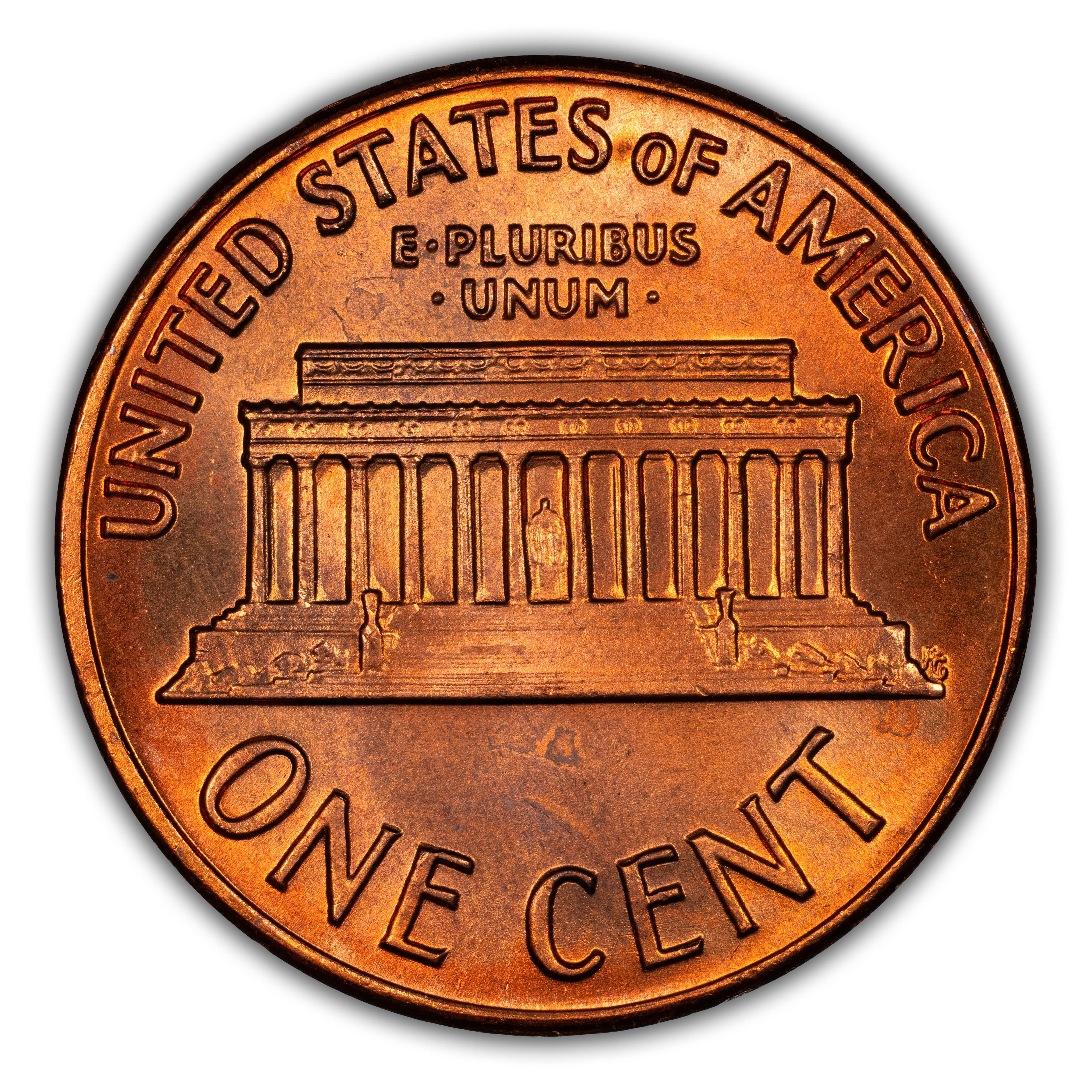 Reverse: Lincoln memorial building centered with words ONE CENT, UNITED STATES OF AMERICA on top and bottom periphery. E PLURIBUS UNUM centered above the top of the memorial.