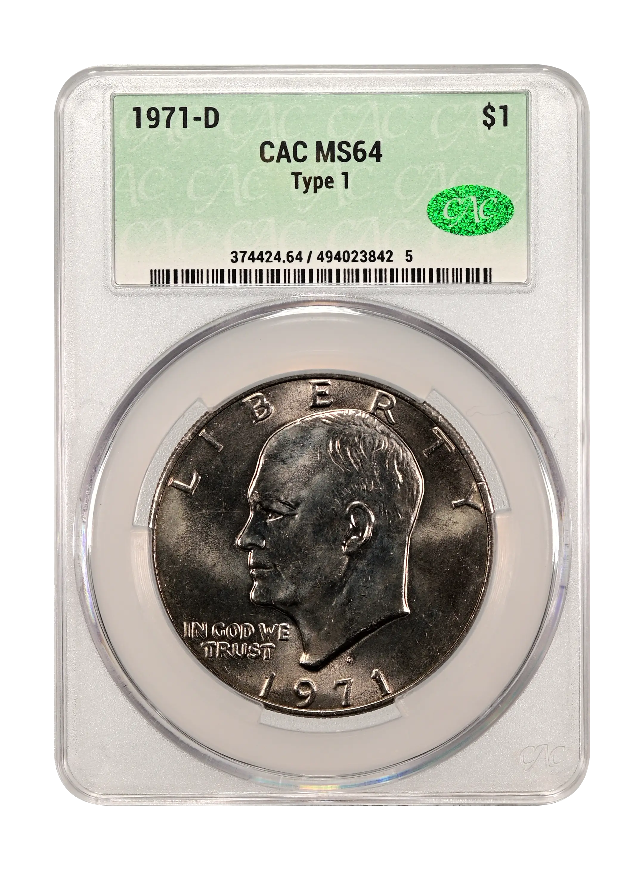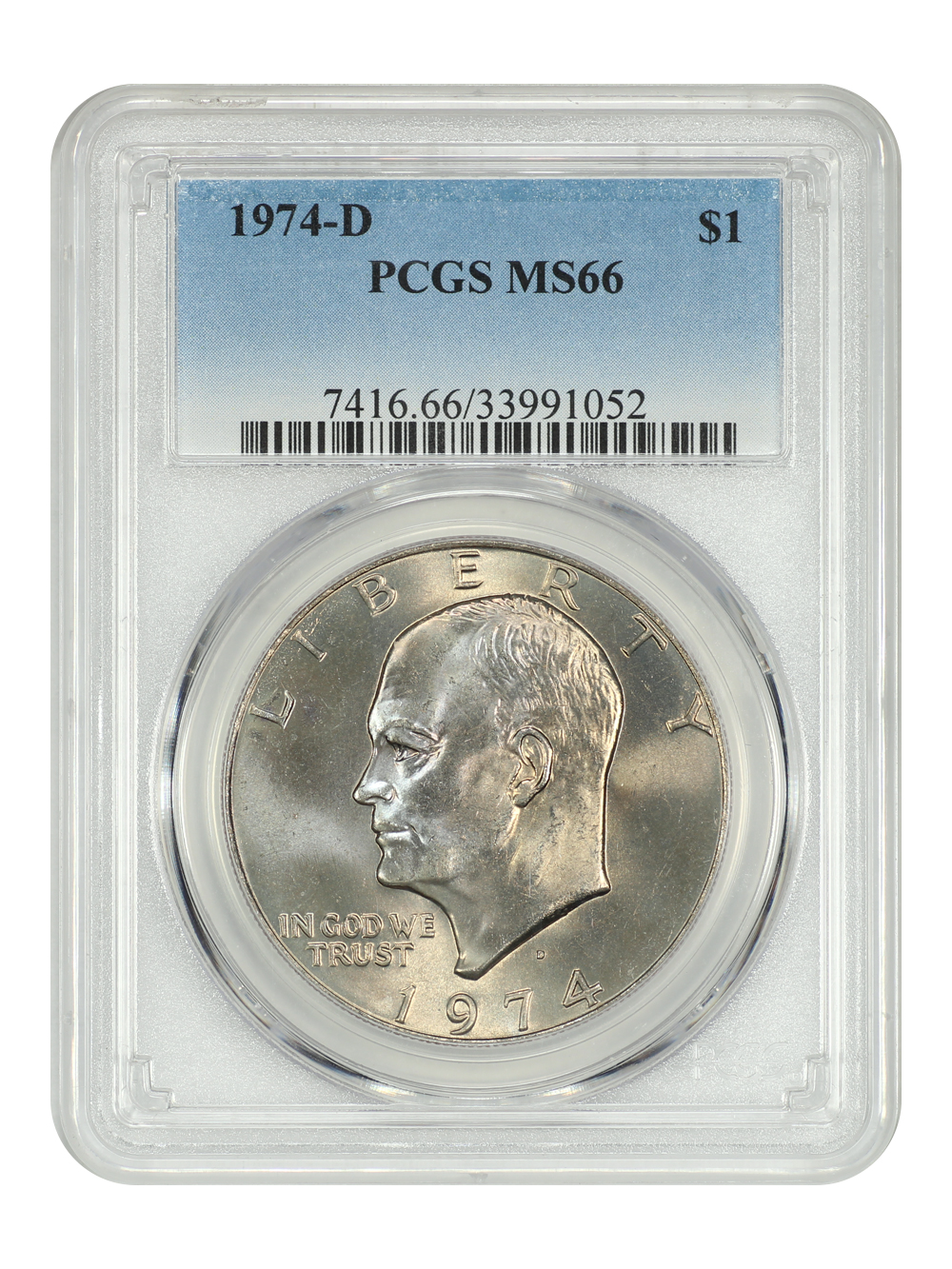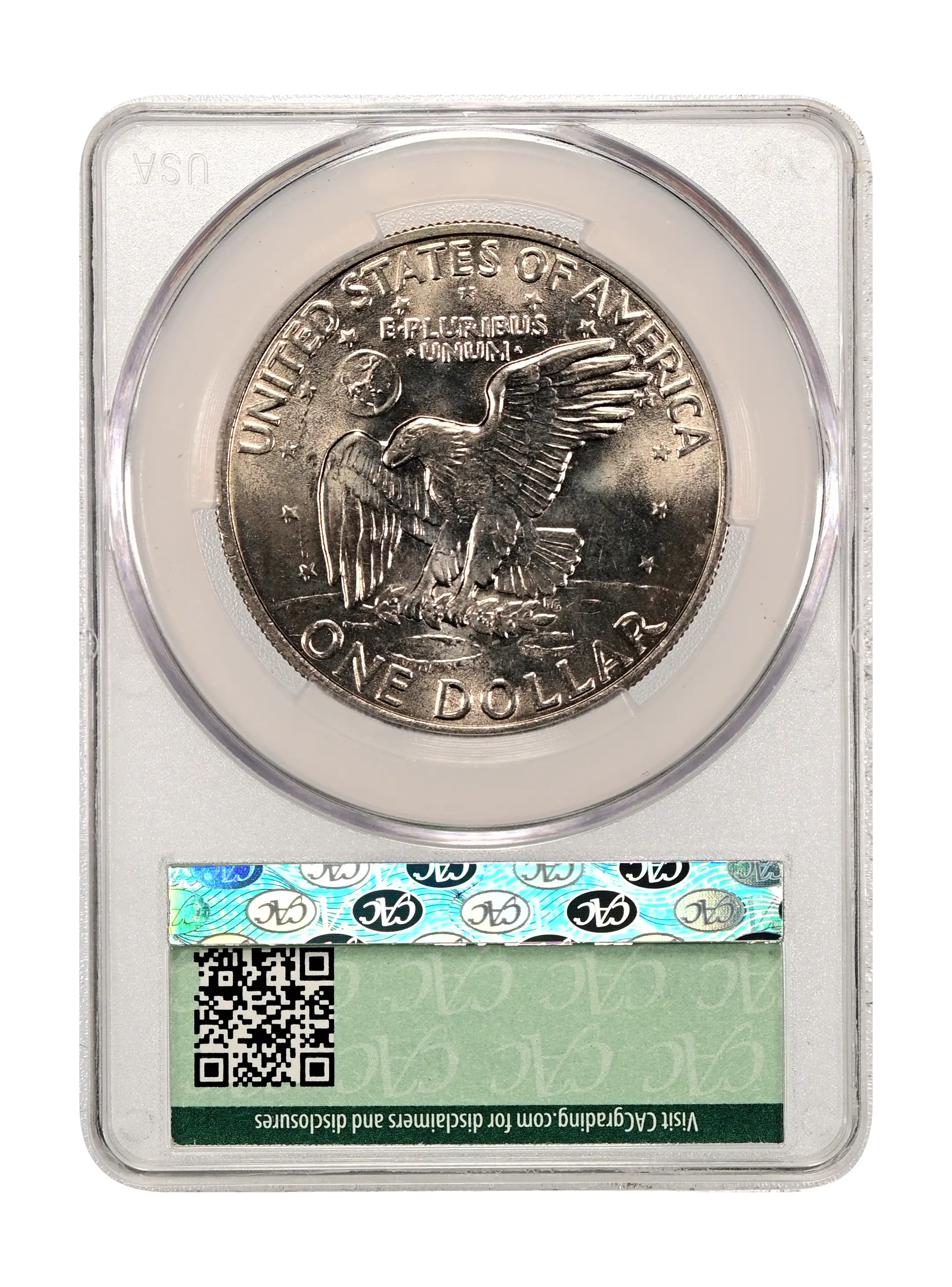 Reverse: A flying eagle, clutching olive branches, appears to be landing on the cratered moon, with the earth seen in the background. 13 stars surround the design with the words UNITED STATES OF AMERICA and ONE DOLLAR framing the periphery.