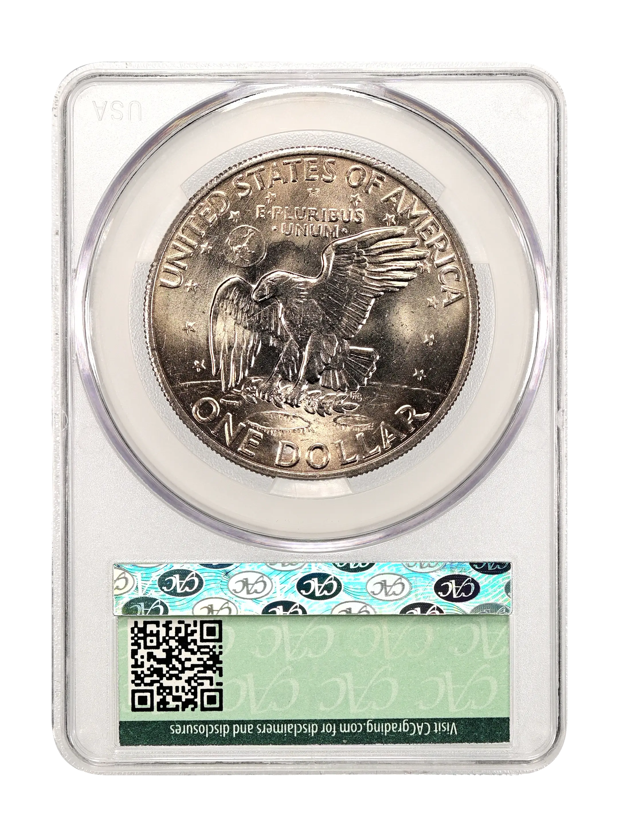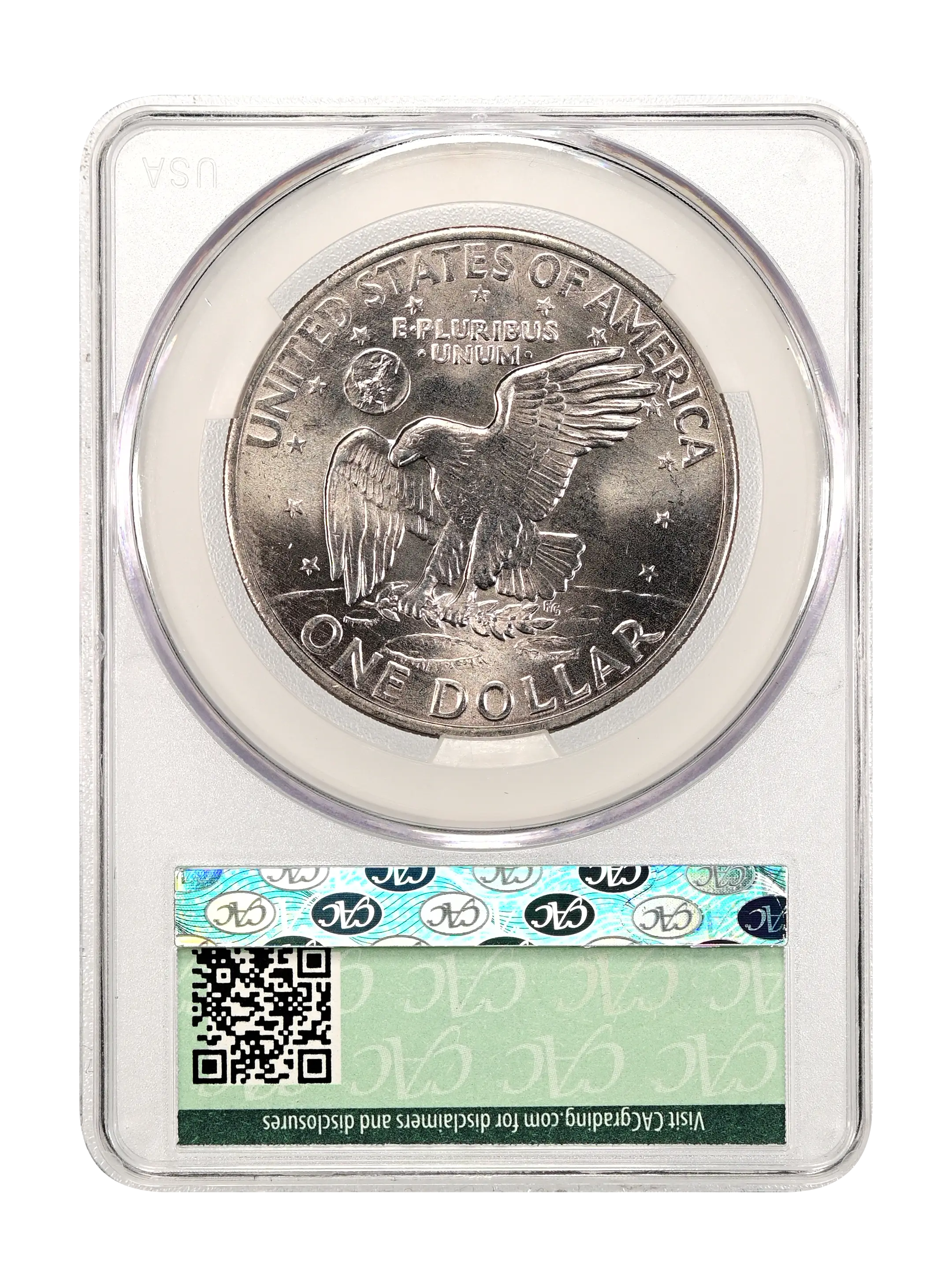 Reverse: A flying eagle, clutching olive branches, appears to be landing on the cratered moon, with the earth seen in the background. 13 stars surround the design with the words UNITED STATES OF AMERICA and ONE DOLLAR framing the periphery.