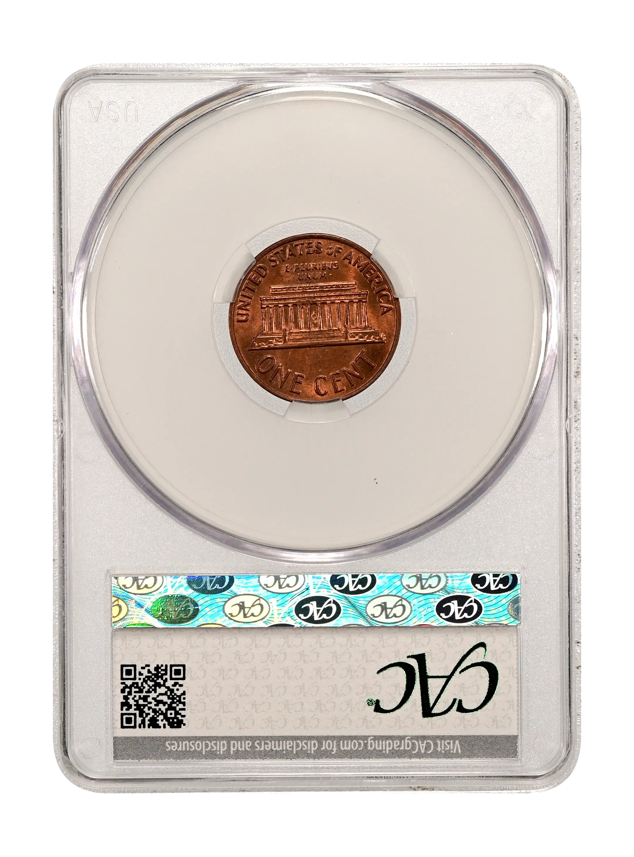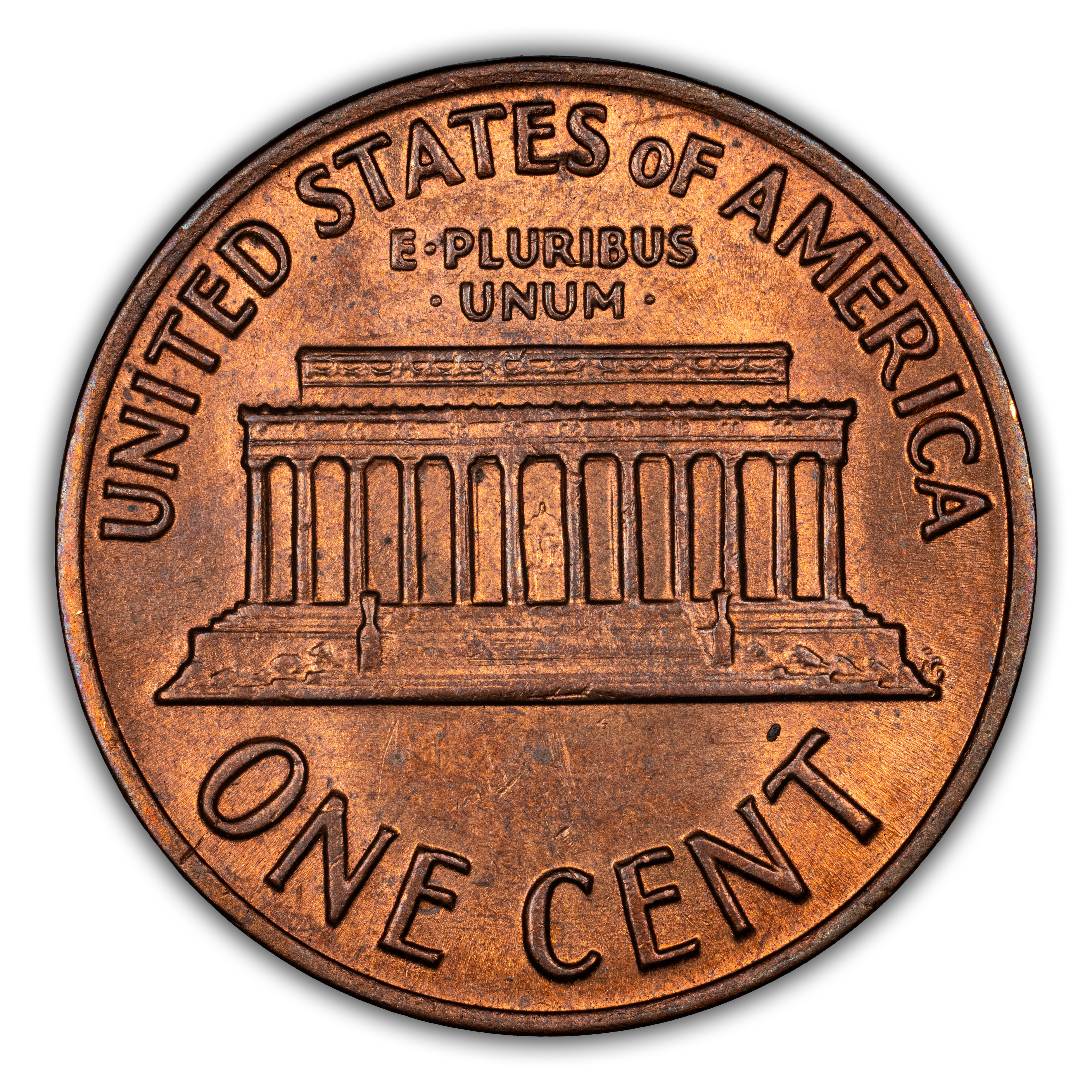 Reverse: Lincoln memorial building centered with words ONE CENT, UNITED STATES OF AMERICA on top and bottom periphery. E PLURIBUS UNUM centered above the top of the memorial.