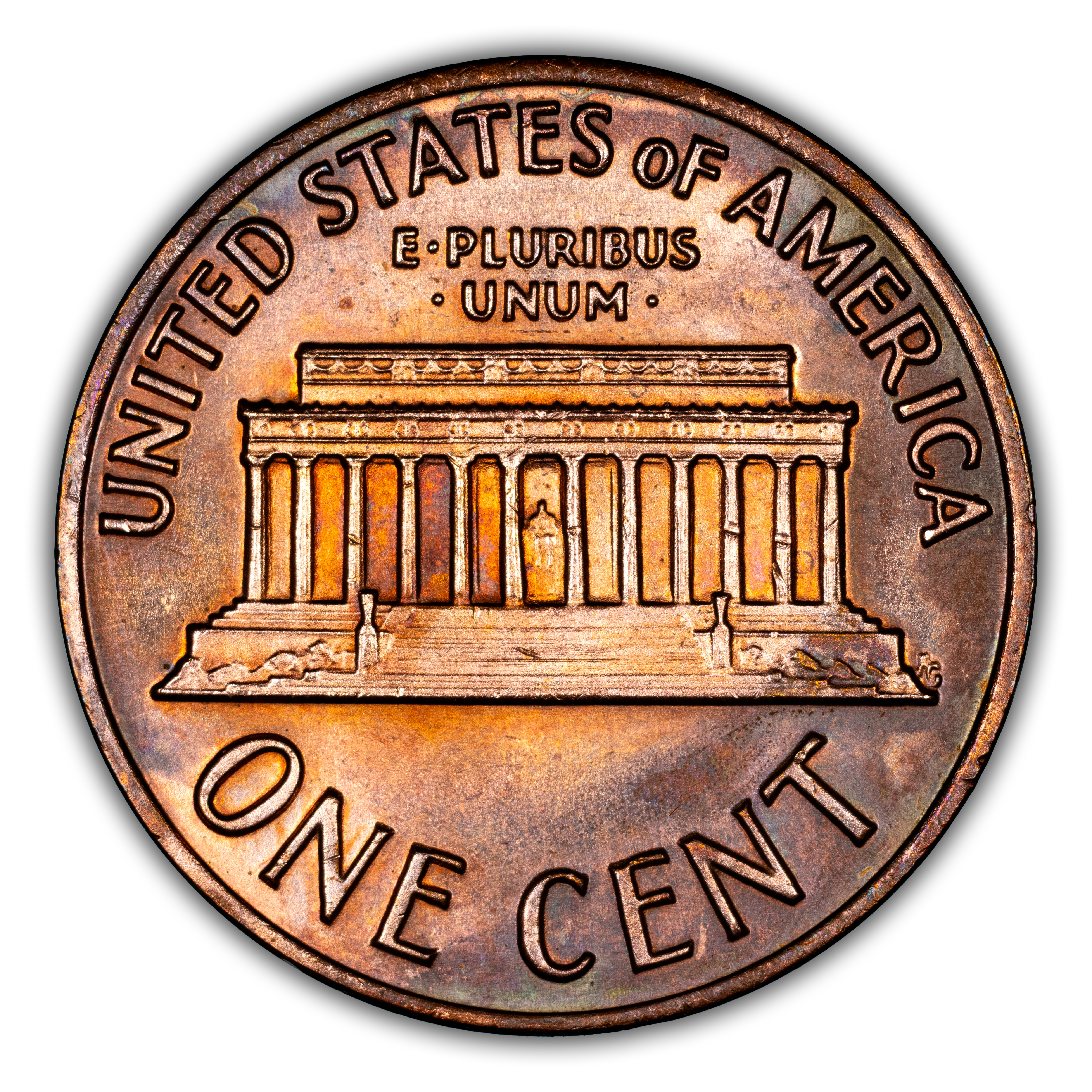 Reverse: Lincoln memorial building centered with words ONE CENT, UNITED STATES OF AMERICA on top and bottom periphery. E PLURIBUS UNUM centered above the top of the memorial.