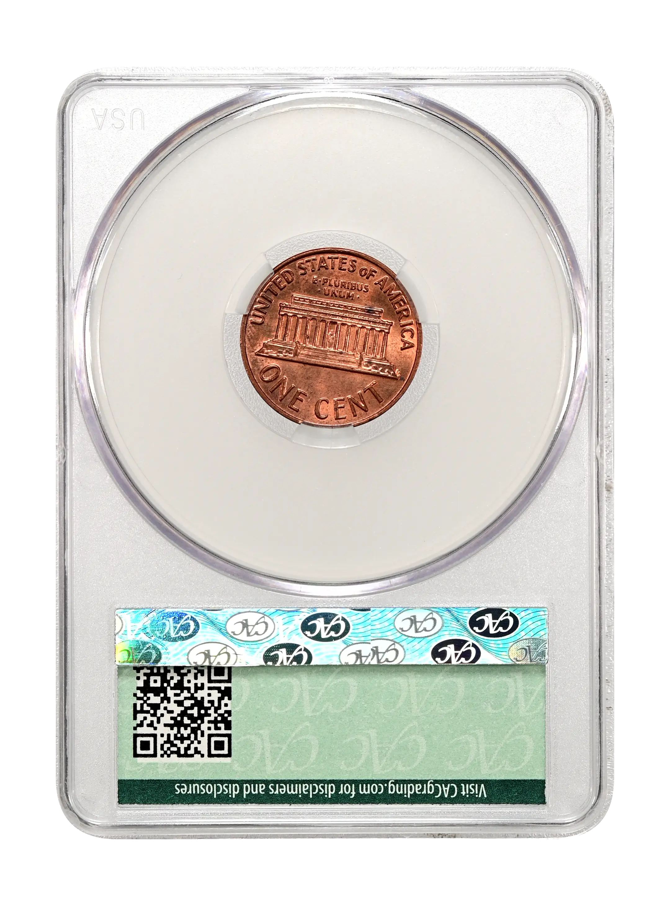 Reverse: Lincoln memorial building centered with words ONE CENT, UNITED STATES OF AMERICA on top and bottom periphery. E PLURIBUS UNUM centered above the top of the memorial.