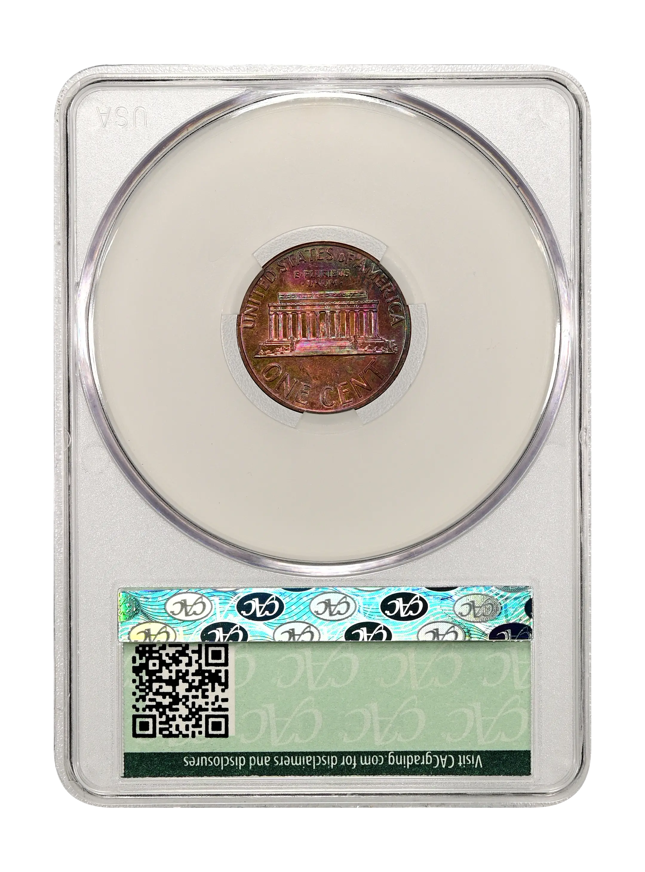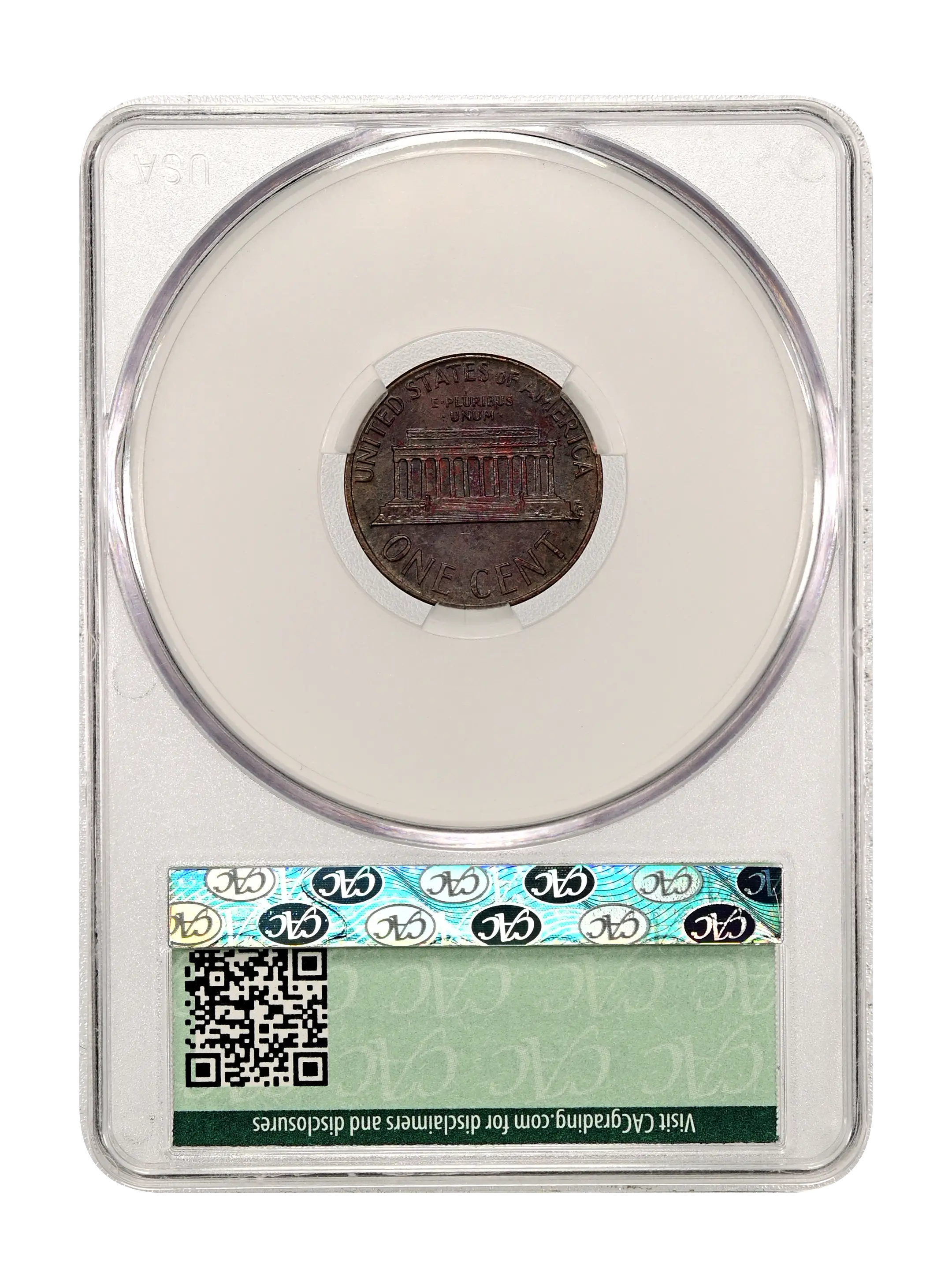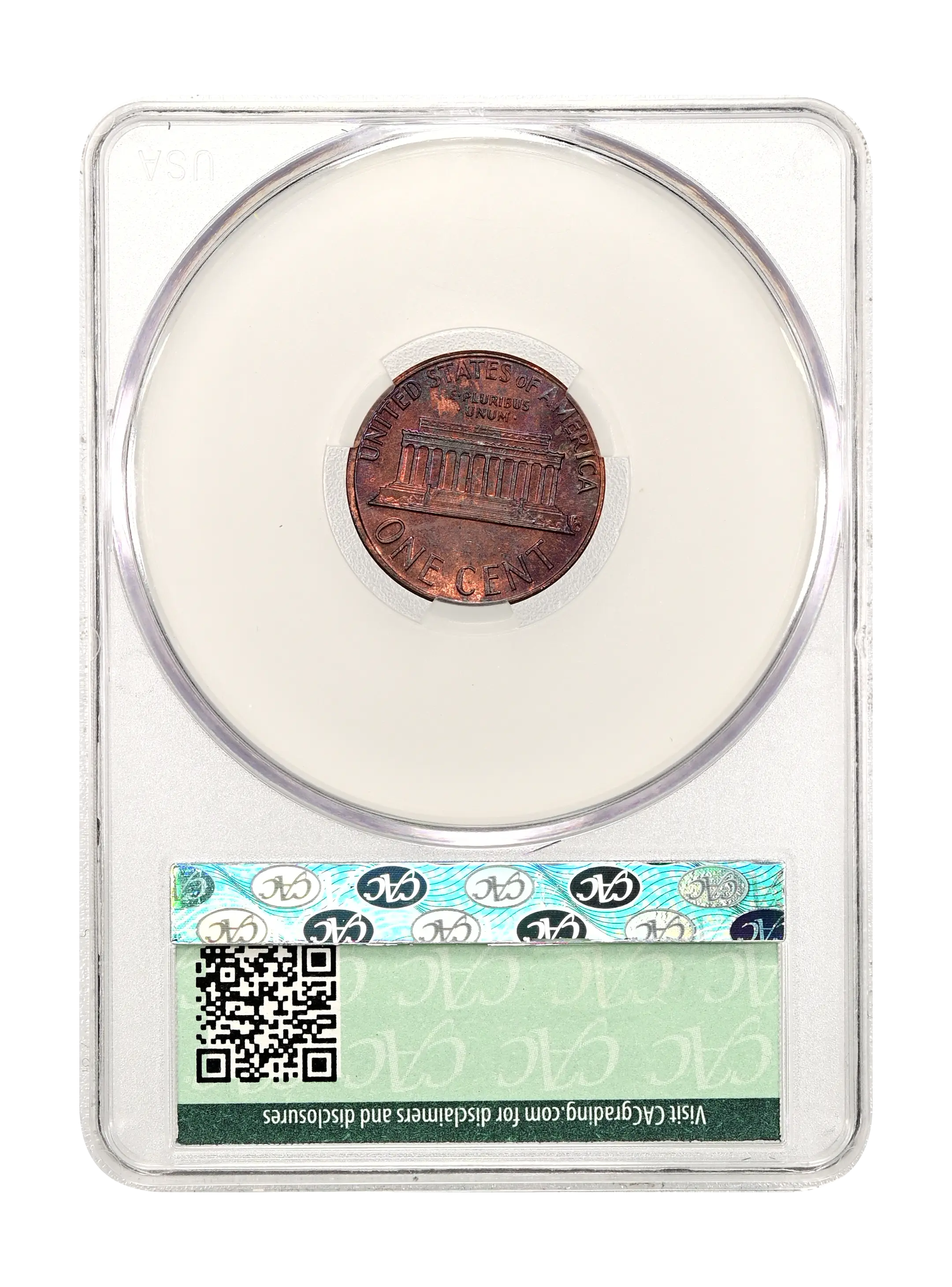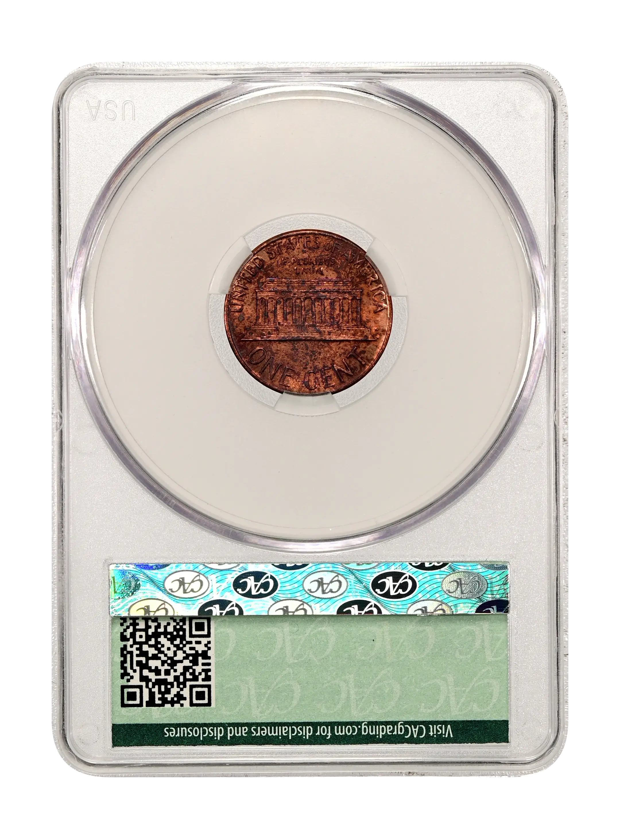 Reverse: Lincoln memorial building centered with words ONE CENT, UNITED STATES OF AMERICA on top and bottom periphery. E PLURIBUS UNUM centered above the top of the memorial.