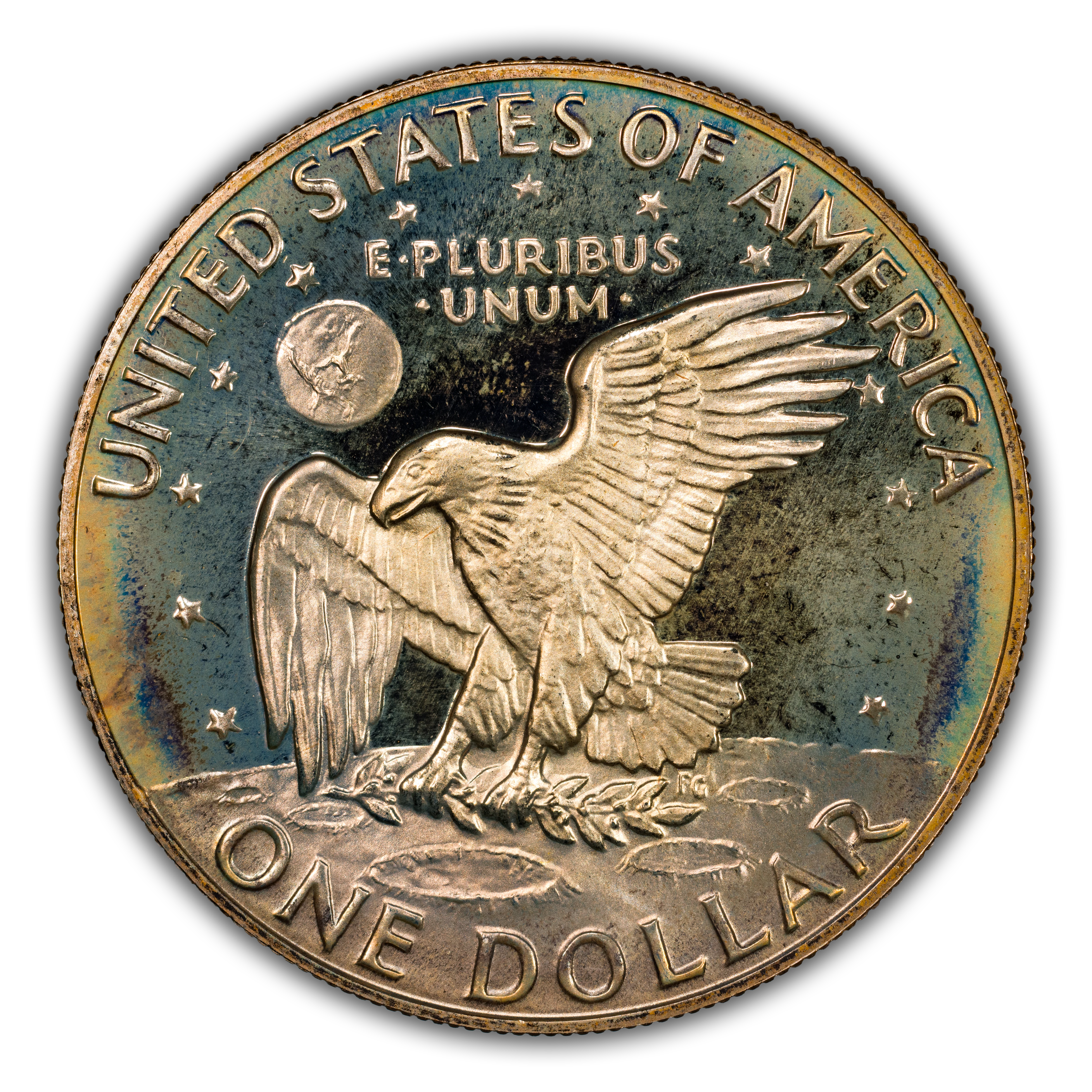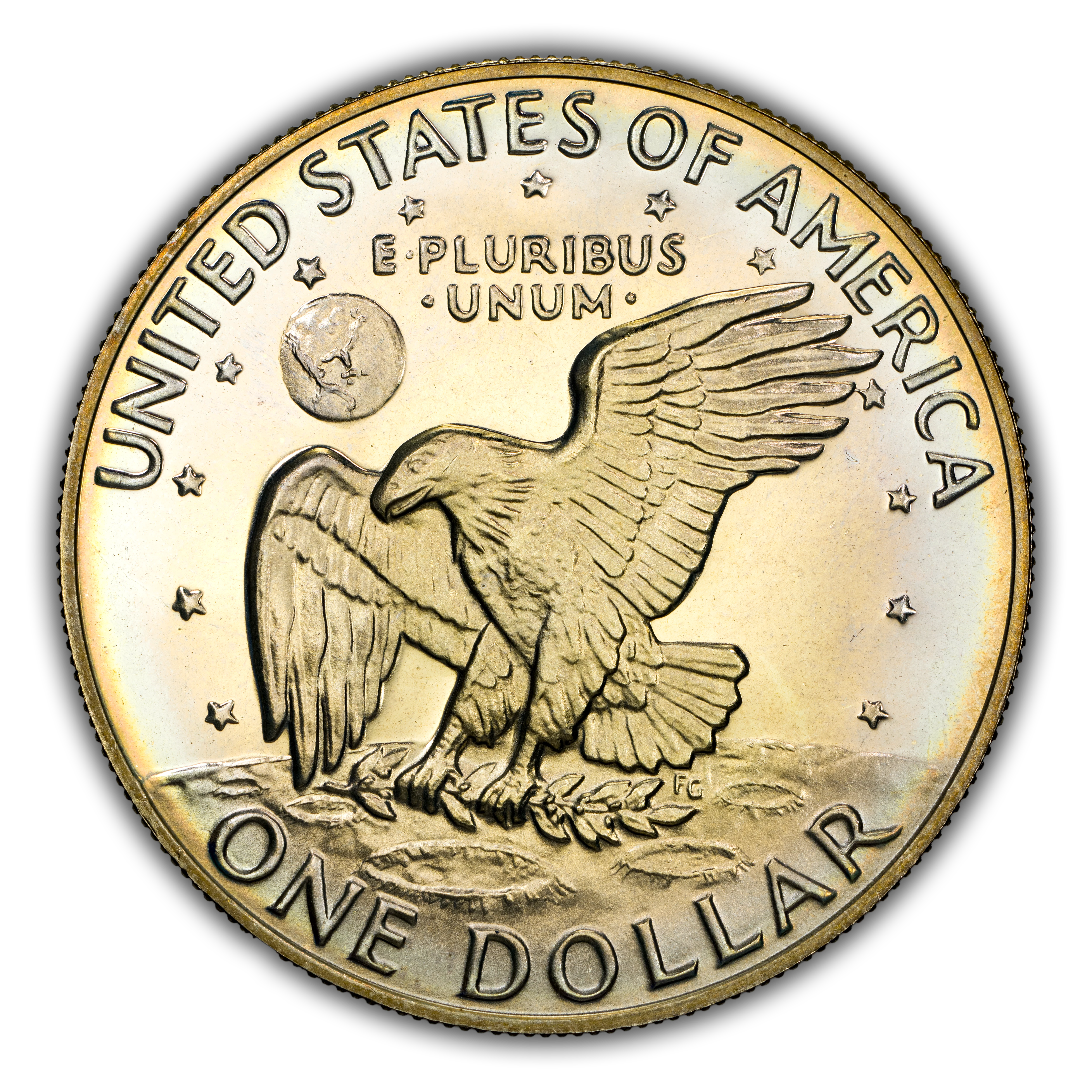 Reverse: A flying eagle, clutching olive branches, appears to be landing on the cratered moon, with the earth seen in the background. 13 stars surround the design with the words UNITED STATES OF AMERICA and ONE DOLLAR framing the periphery.