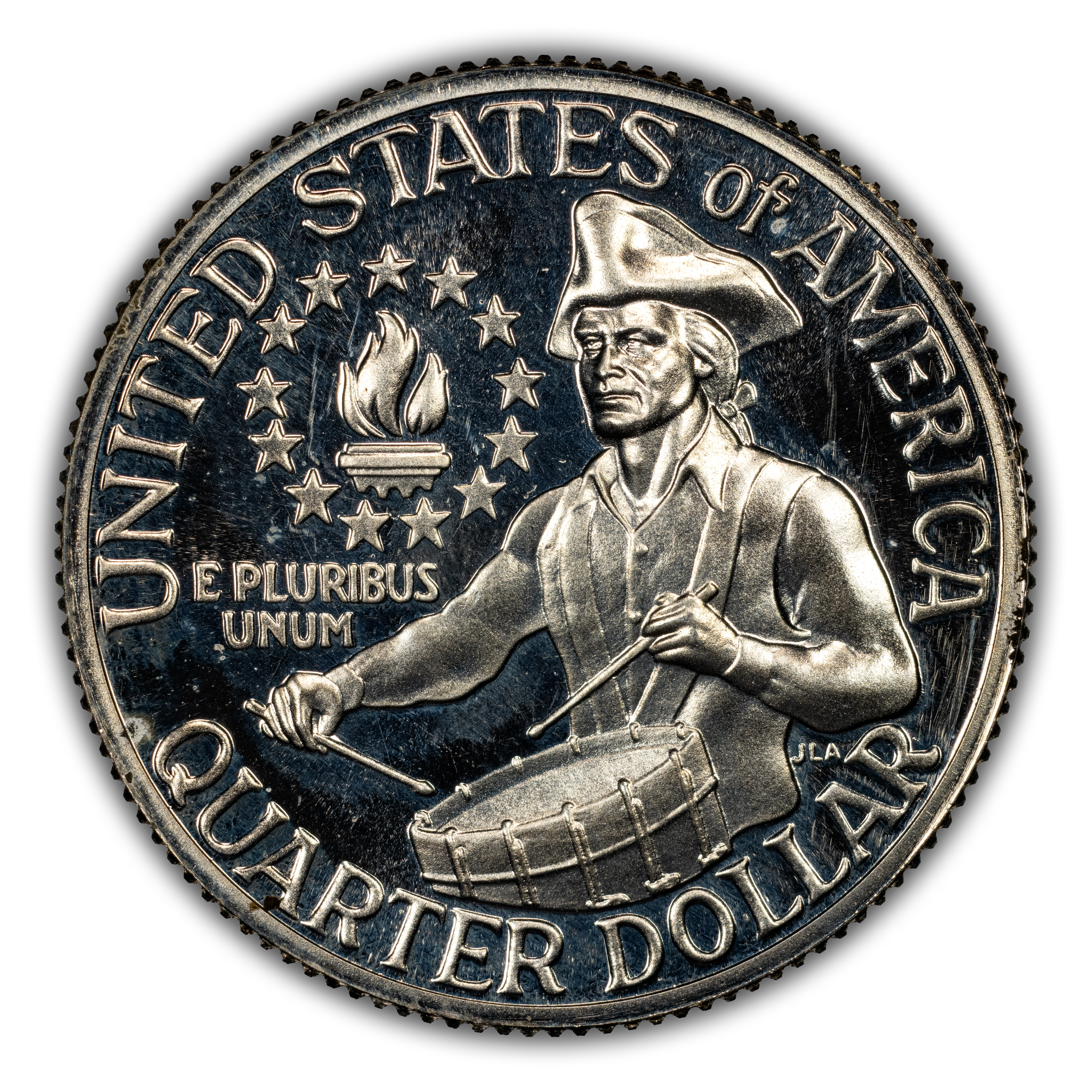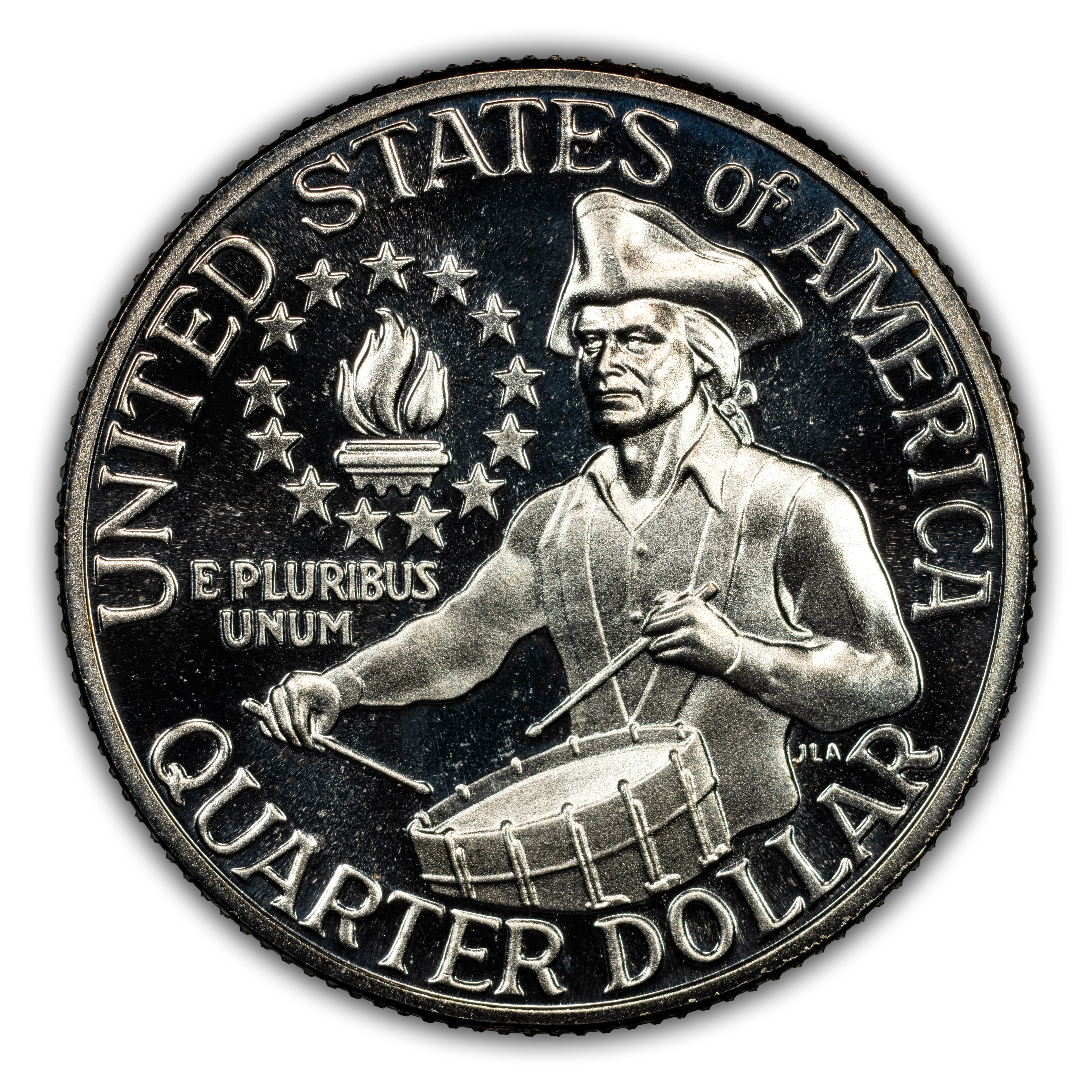 Reverse: A military drummer boy facing left is featured with a small torch, surrounded by 13 stars, in the left field. E PLURIBUS UNUM is wedged between the torch and drummer's hand. UNITED STATES OF AMERICA * QUARTER DOLLAR framer the periphery.