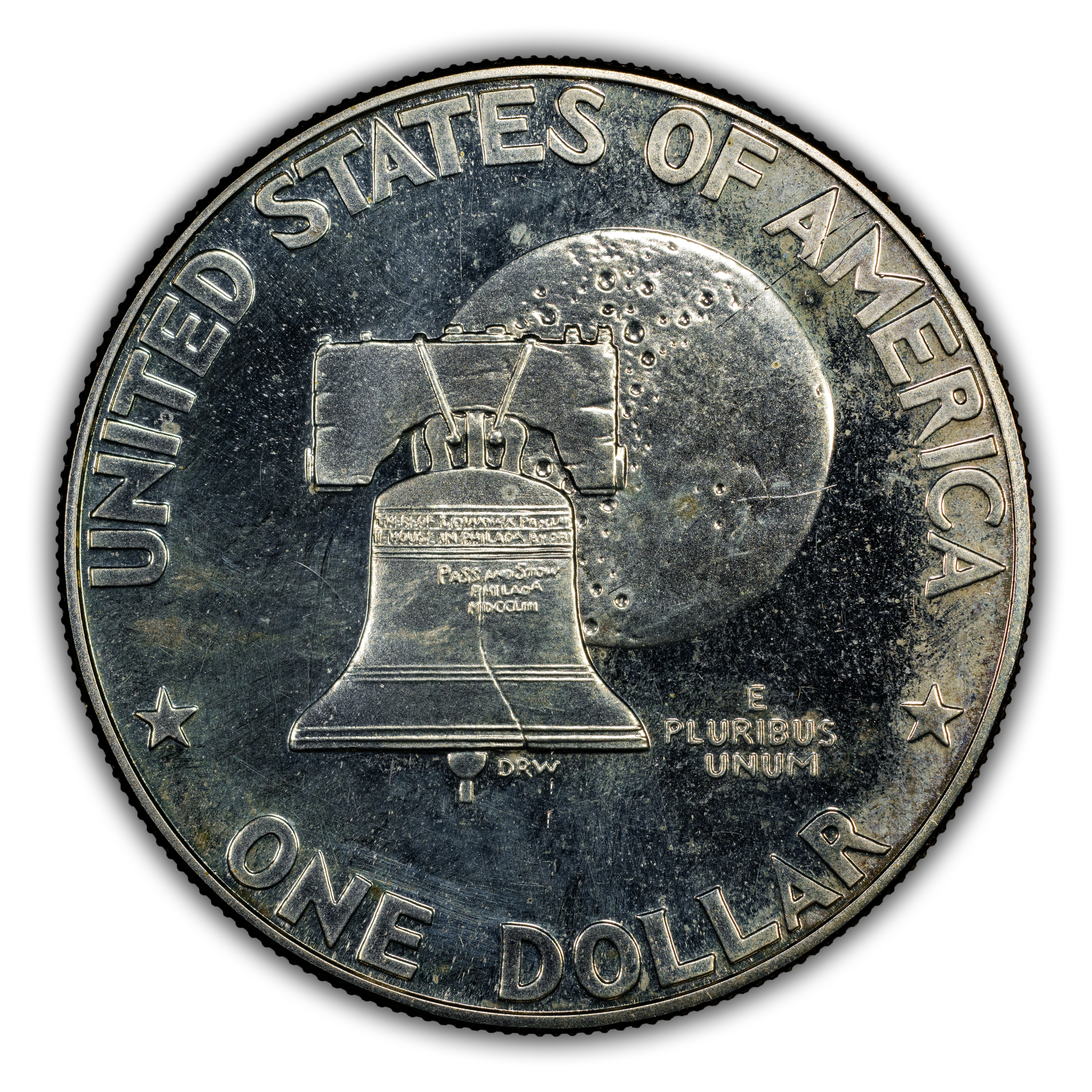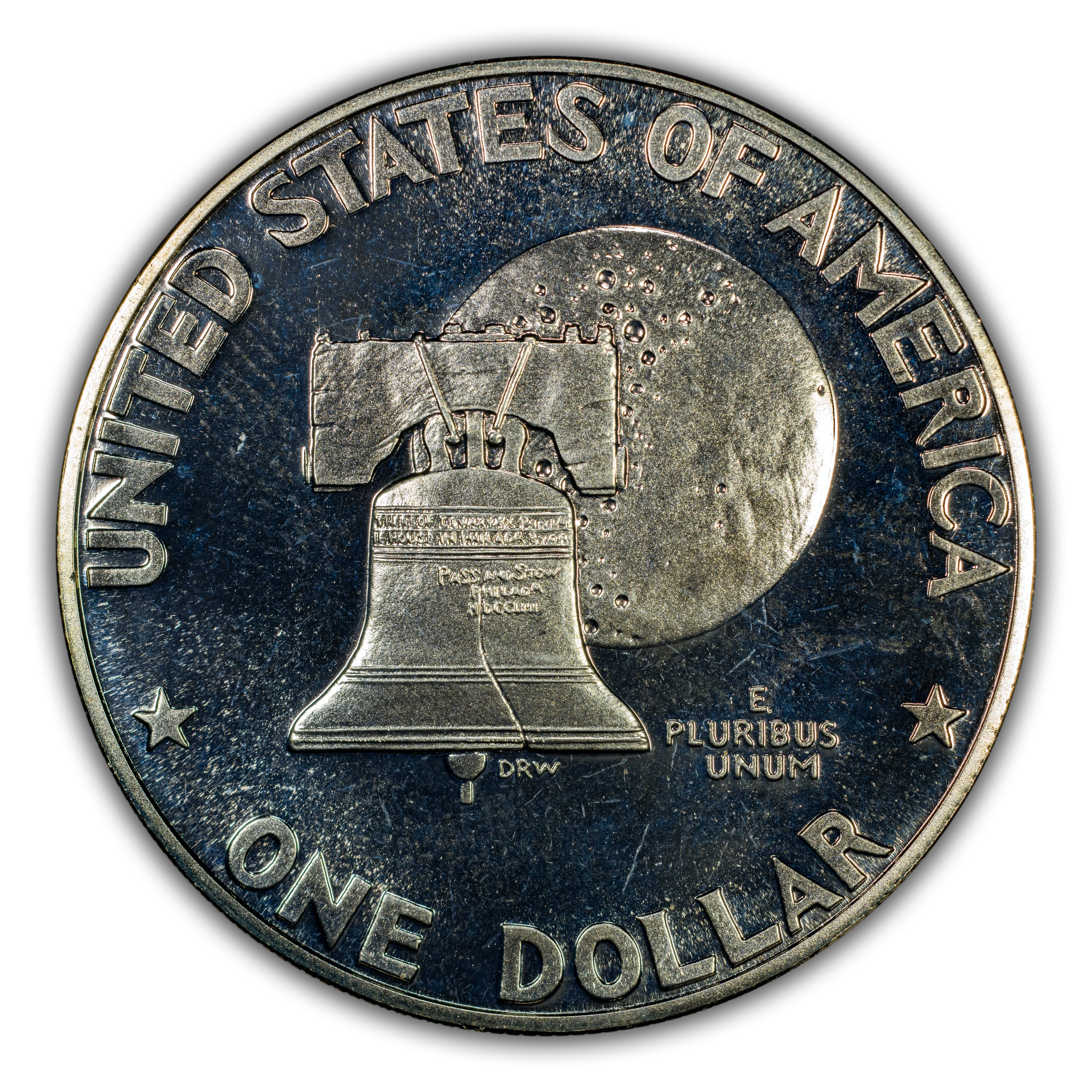 Reverse: The Liberty bell is positioned in front of a full moon with the motto E PLURIBUS UNUM off the lower right of the bell. UNITED STATES OF AMERICA * ONE DOLLAR * are written around the periphery.