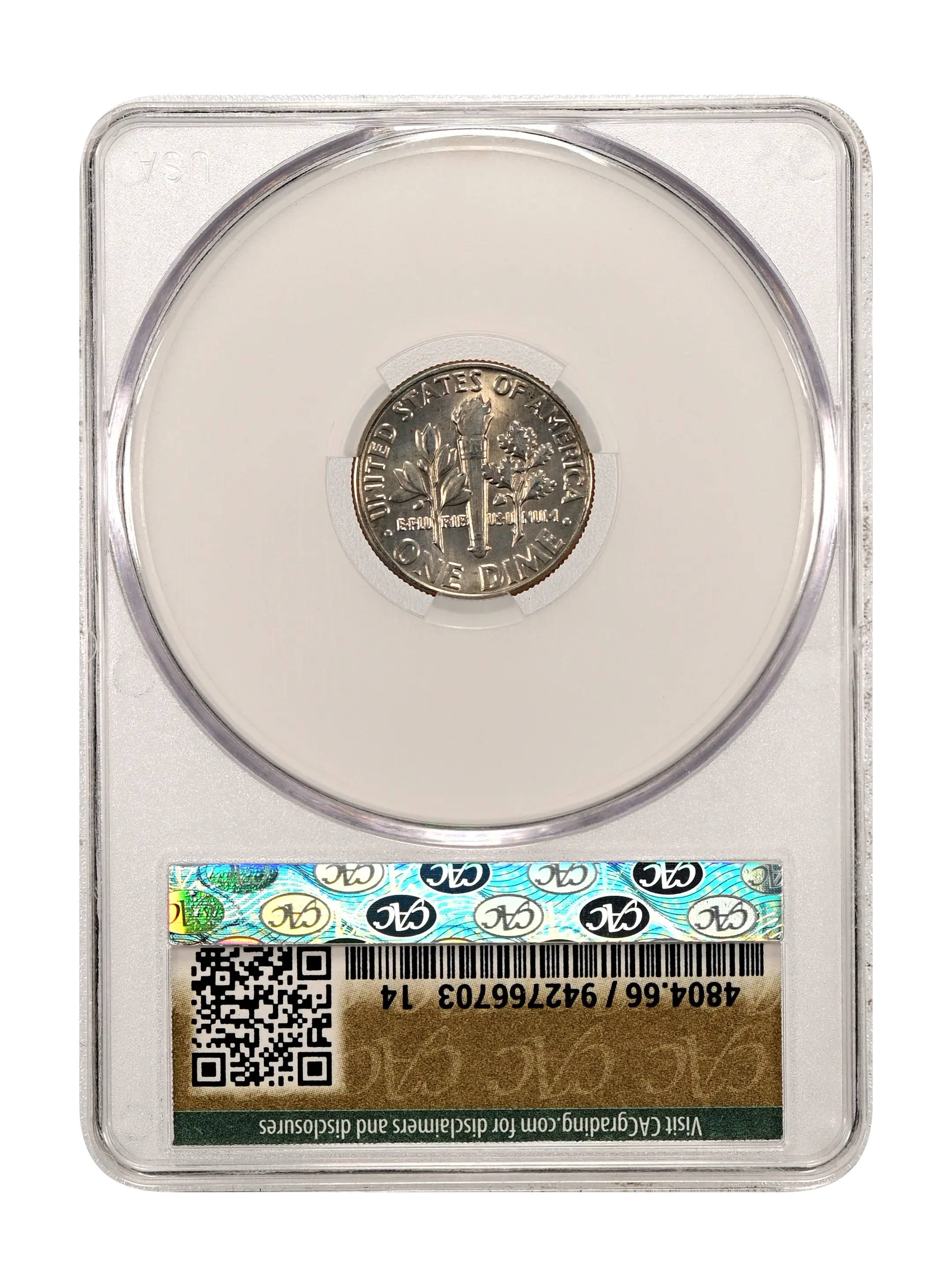 Reverse: Torch of Liberty is flanked by olive branches in the center with UNITED STATES OF AMERICA * ONE DIME around the circumference.