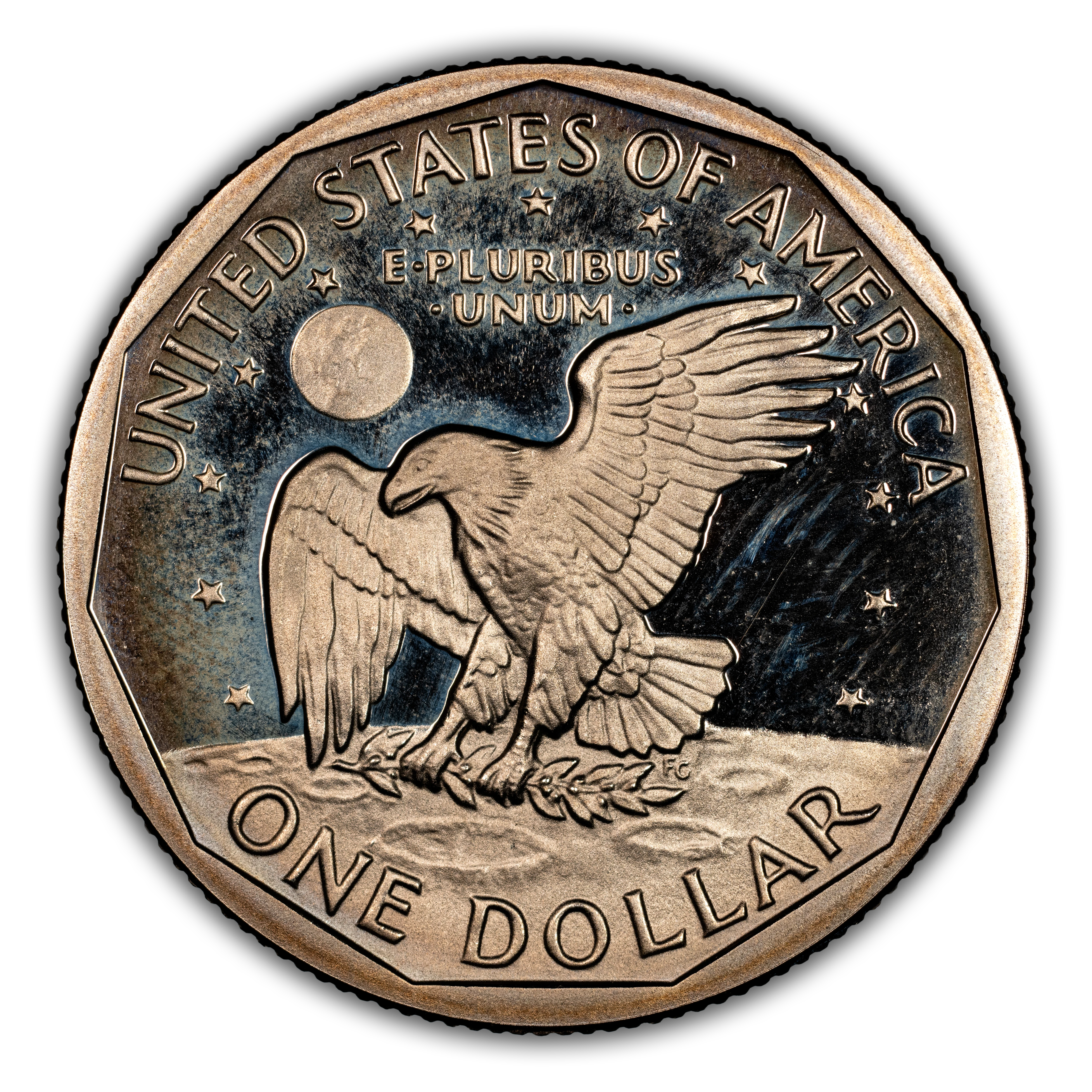 Reverse: A flying eagle, clutching olive branches, appears to be landing on the cratered moon, with the earth seen in the background. 13 stars surround the design with the words UNITED STATES OF AMERICA and ONE DOLLAR framing the periphery.