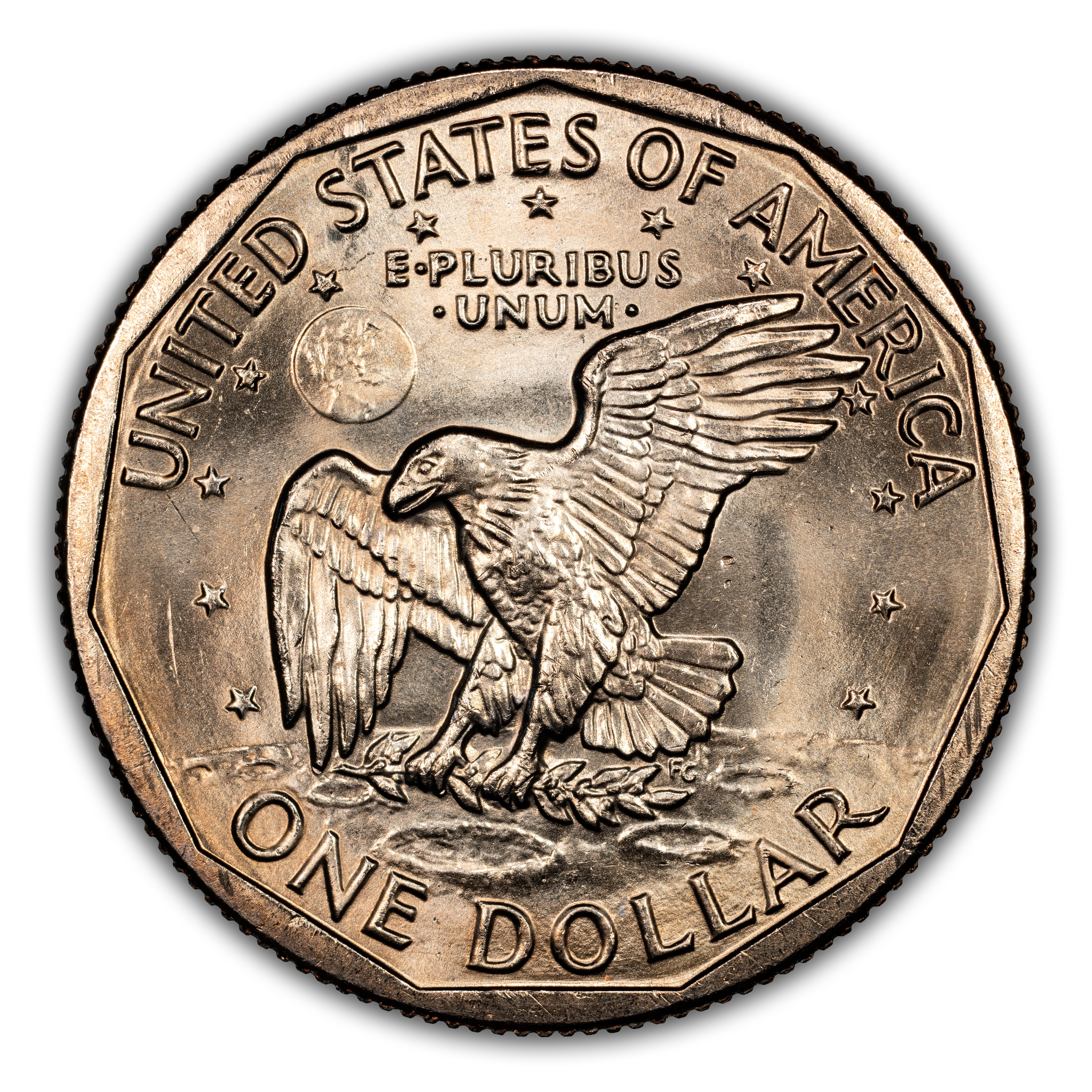 Reverse: A flying eagle, clutching olive branches, appears to be landing on the cratered moon, with the earth seen in the background. 13 stars surround the design with the words UNITED STATES OF AMERICA and ONE DOLLAR framing the periphery.