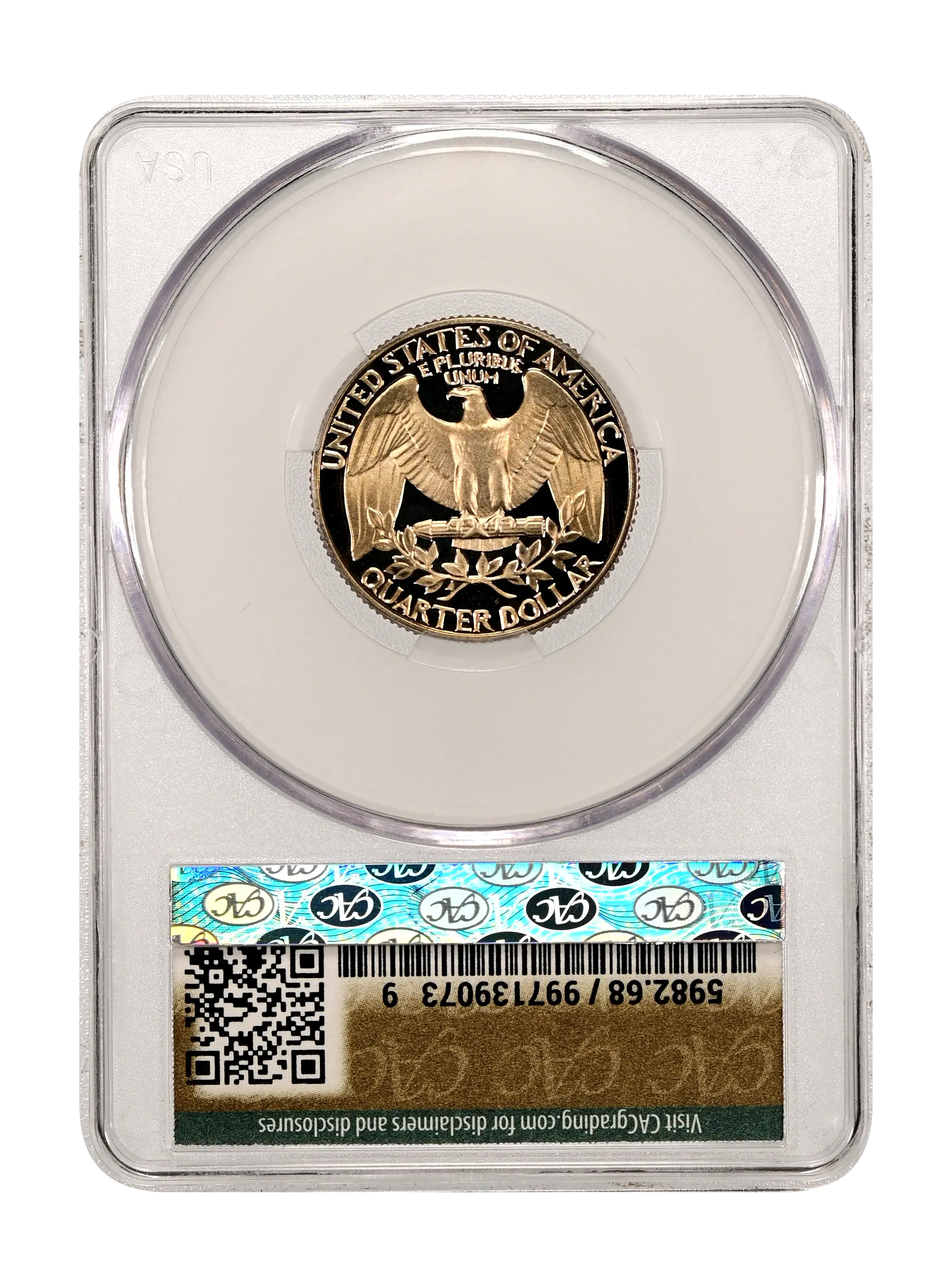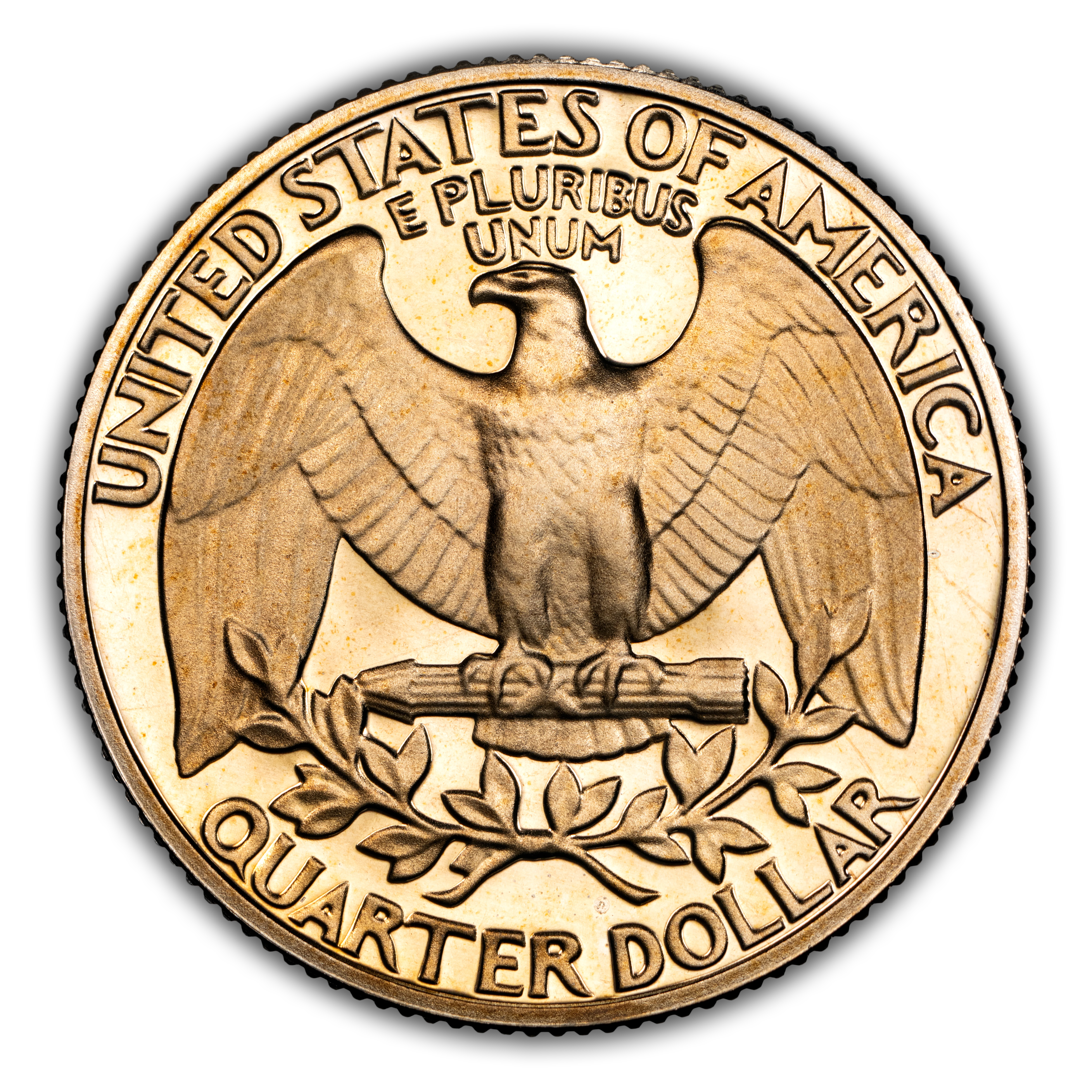 Reverse: Large eagle with wings fully extended, clutching a bundle of arrows with the words UNITED STATES OF AMERICA at the top periphery; QUARTER DOLLAR at the bottom. An olive leaf is positioned between the eagle and the denomination.
