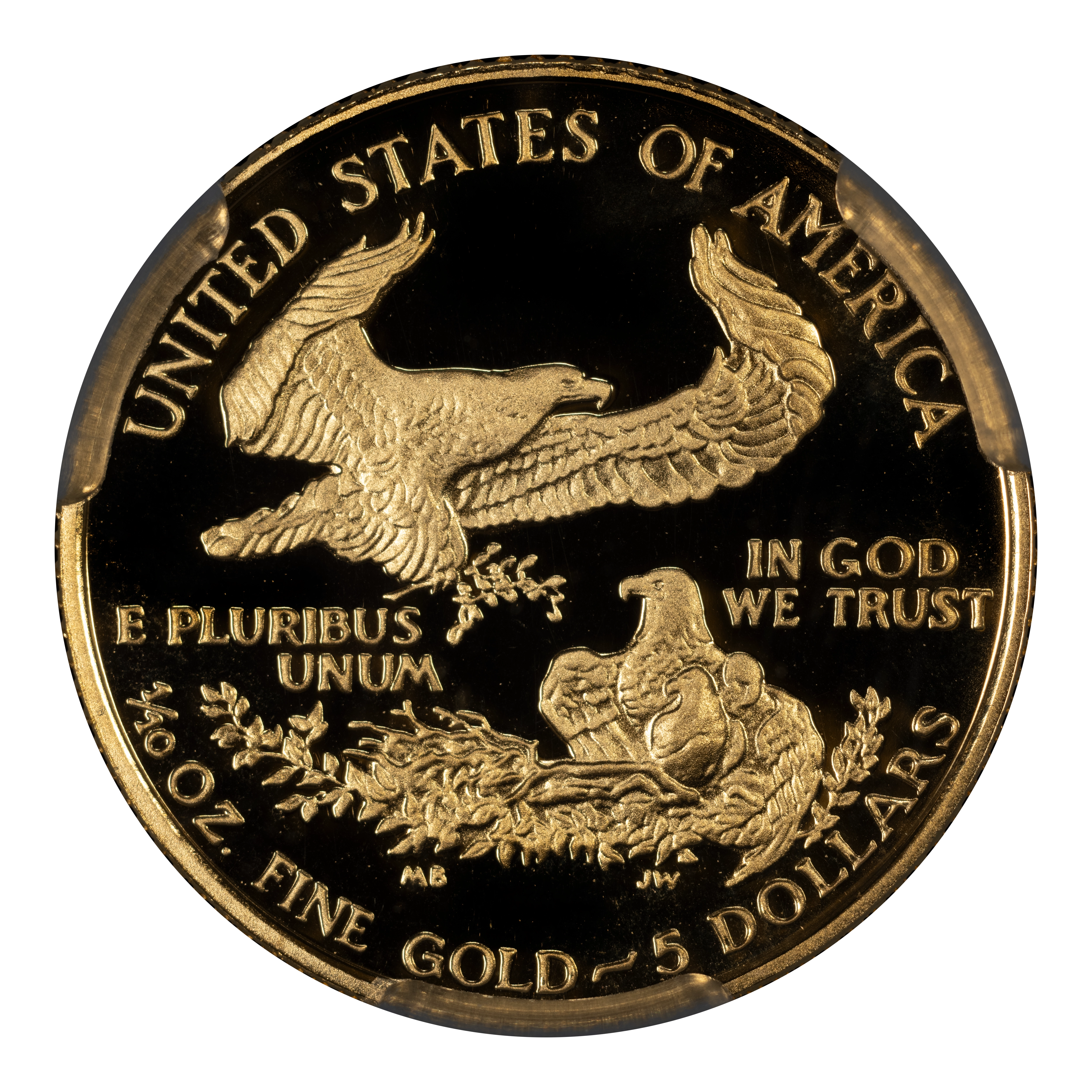 Reverse: A flying eagle is depicted approaching her nest of three waiting eagles accompanied by the words UNITED STATES OF AMERICA, E PLURIBUS UNUM, IN GOD WE TRUST , 1/10 OZ. FINE GOLD~5 DOLLARS.